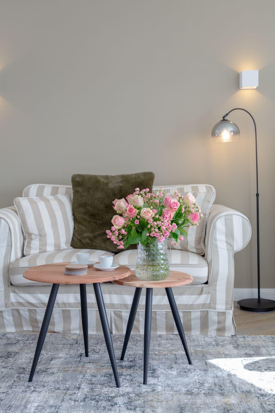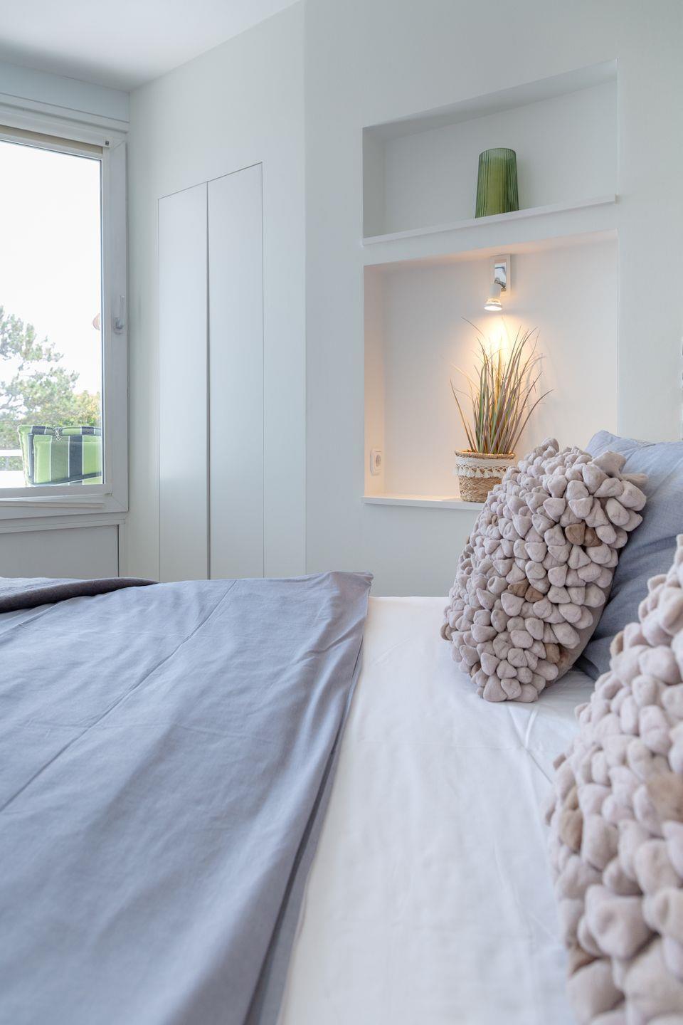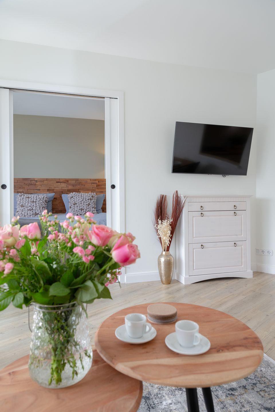 Das Herzstück der Wohnung bildet der helle und elegant gestaltete Wohn- und Schlafbereich, in dem sich sowohl ein komfortables Boxspringbett, als auch ein behagliches Sofa befinden.