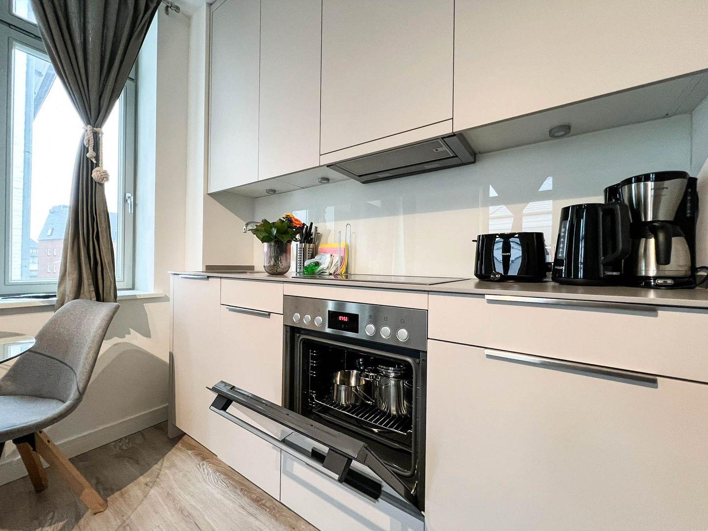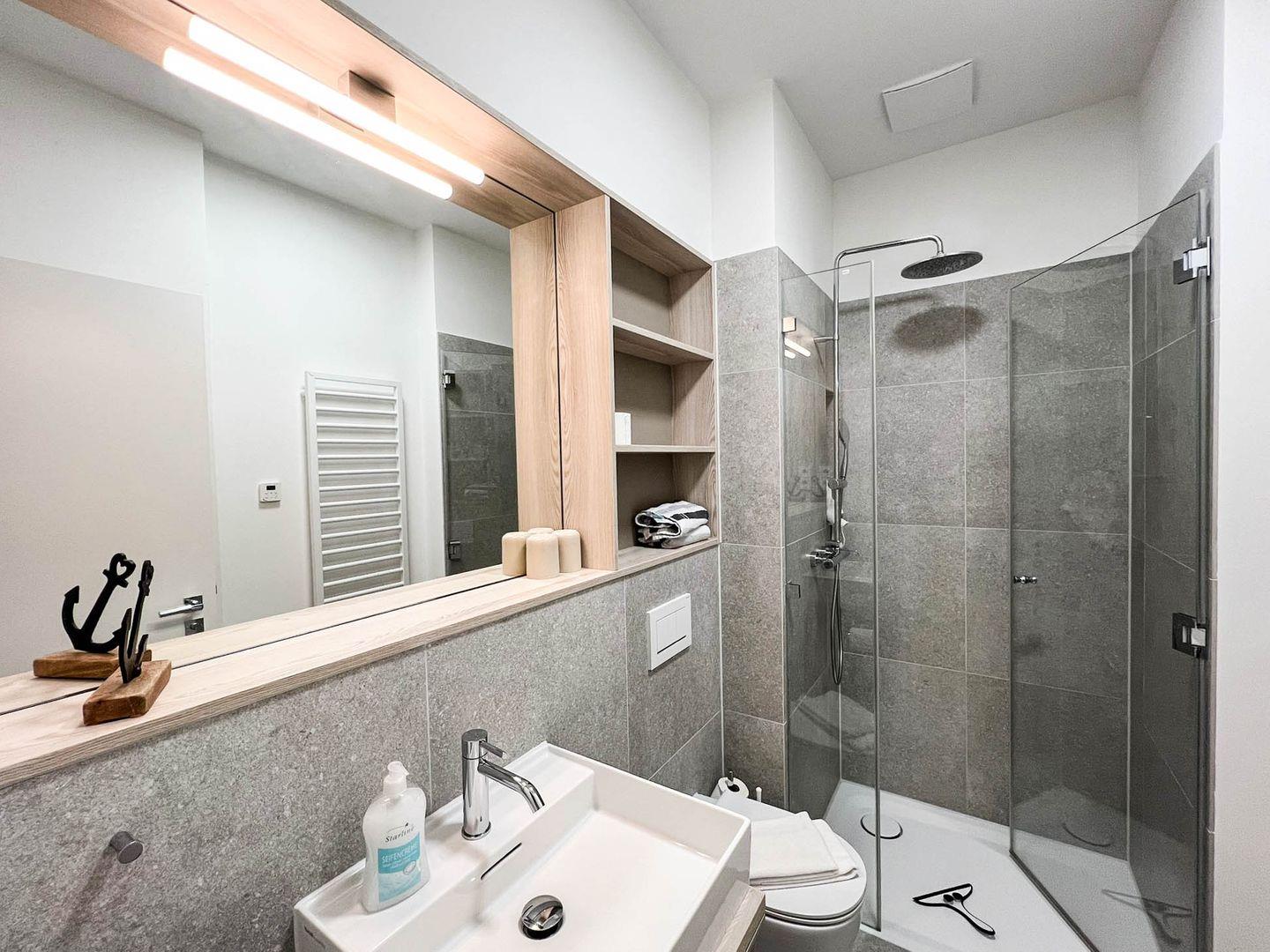 Die Wohnung hat 30 Quadratmeter und ein Duschbad, zum Haus gehören eine praktische Tiefgarage (Duplex), eine gemeinschaftliche Waschküche mit Waschmaschine und Trockner und selbstverständlich Internet/Wlan. Tür an Tür wohnen Sie hier übrigens mit der „Sturmkoje“, einem ähnlichen Appartement direkt nebenan, das Sie ebenfalls in unserem Portfolio finden - perfekt also, wenn Sie zu viert verreisen und größtmögliche Nähe bei etwas freundschaftlicher Distanz haben wollen.