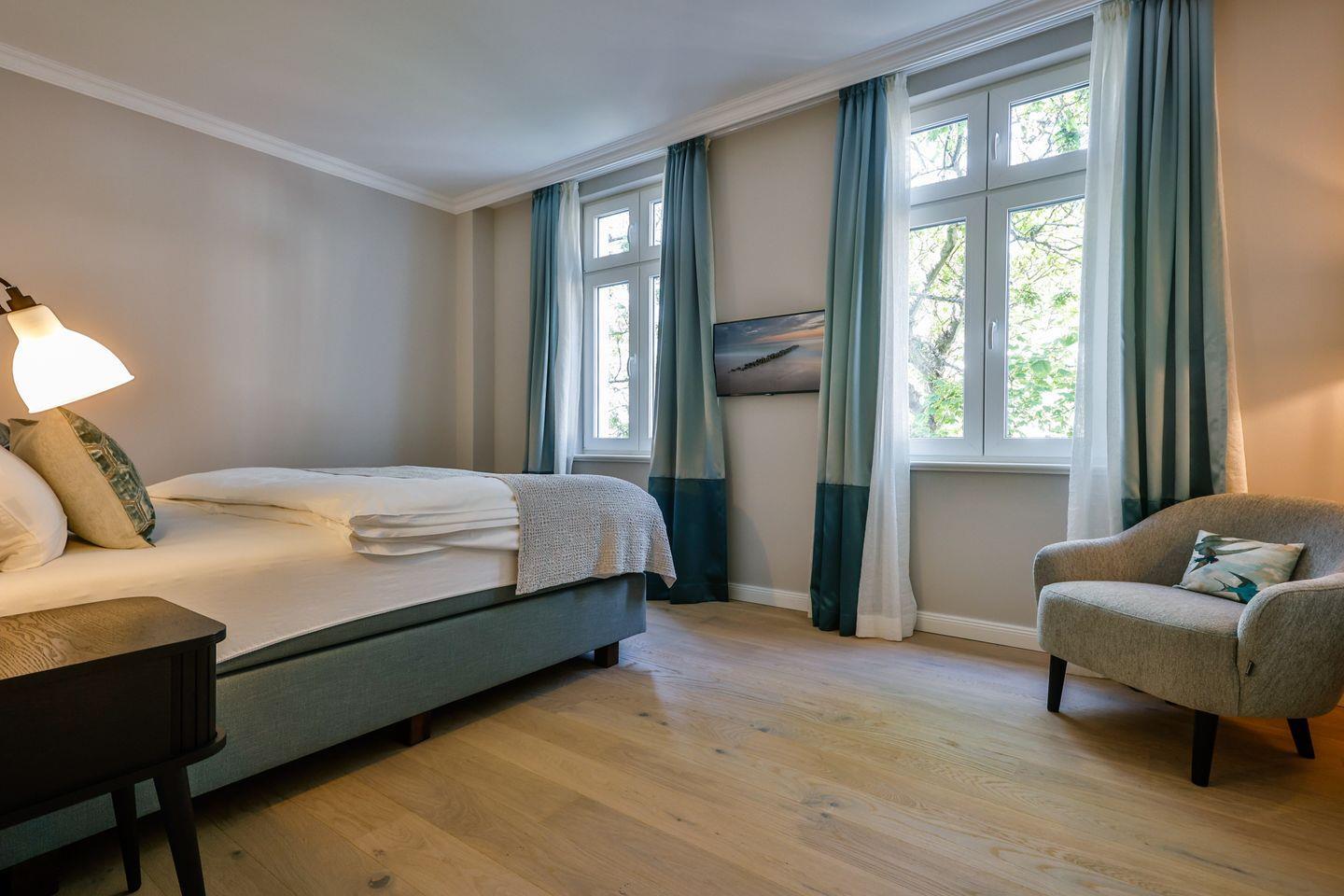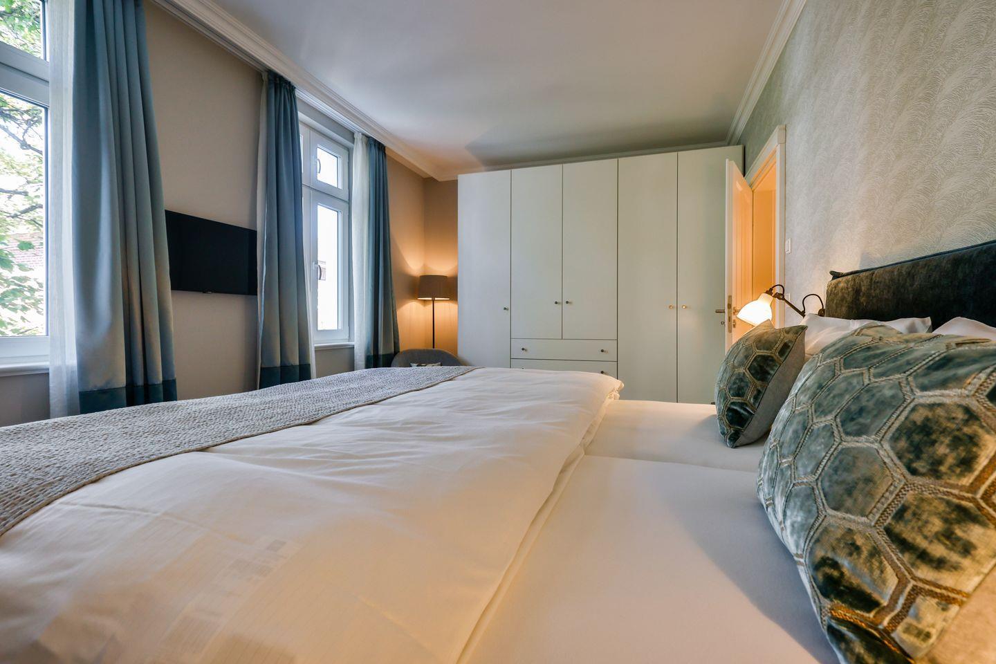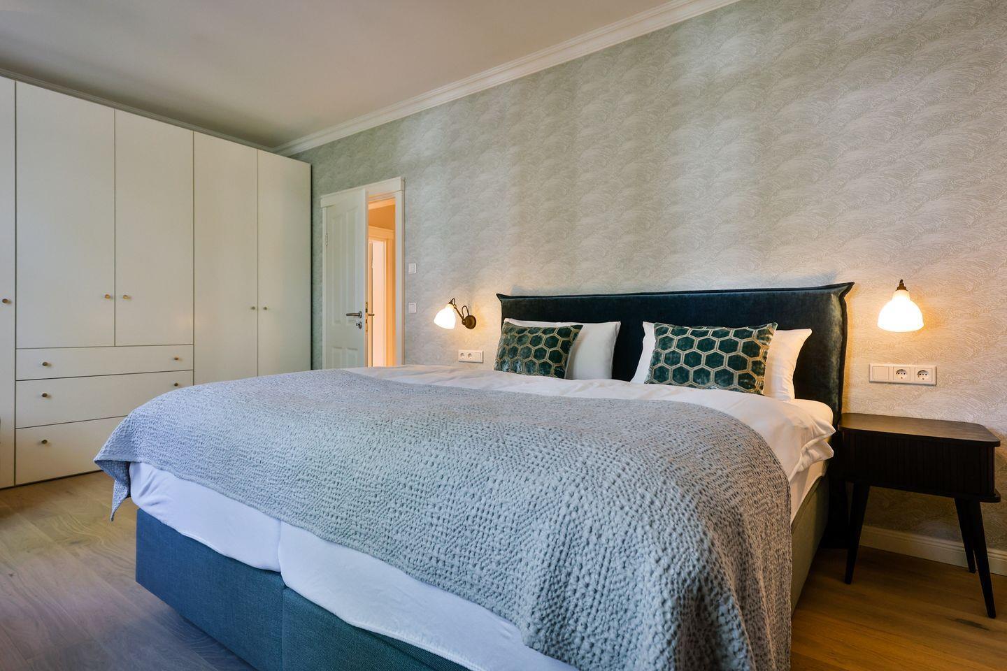 Beide Schlafzimmer sind sehr geschmackvoll eingerichtet und bieten höchsten Schlafkomfort in komfortablen Boxspringbetten (180x200 cm) sowie ein TV. Für die 5. Person kann eine weitere Schlafmöglichkeit durch ein Zustellbett geschaffen werden, was diese Wohnung auch für Familien ideal macht. Zwei moderne Badezimmer mit ebenerdigen Duschen, WC und Fön stehen Ihnen zur Verfügung, eines davon bietet zusätzlich eine Badewanne zum Entspannen und Wohlfühlen. Abgerundet wird der Bereich durch ein separates Gäste-WC.