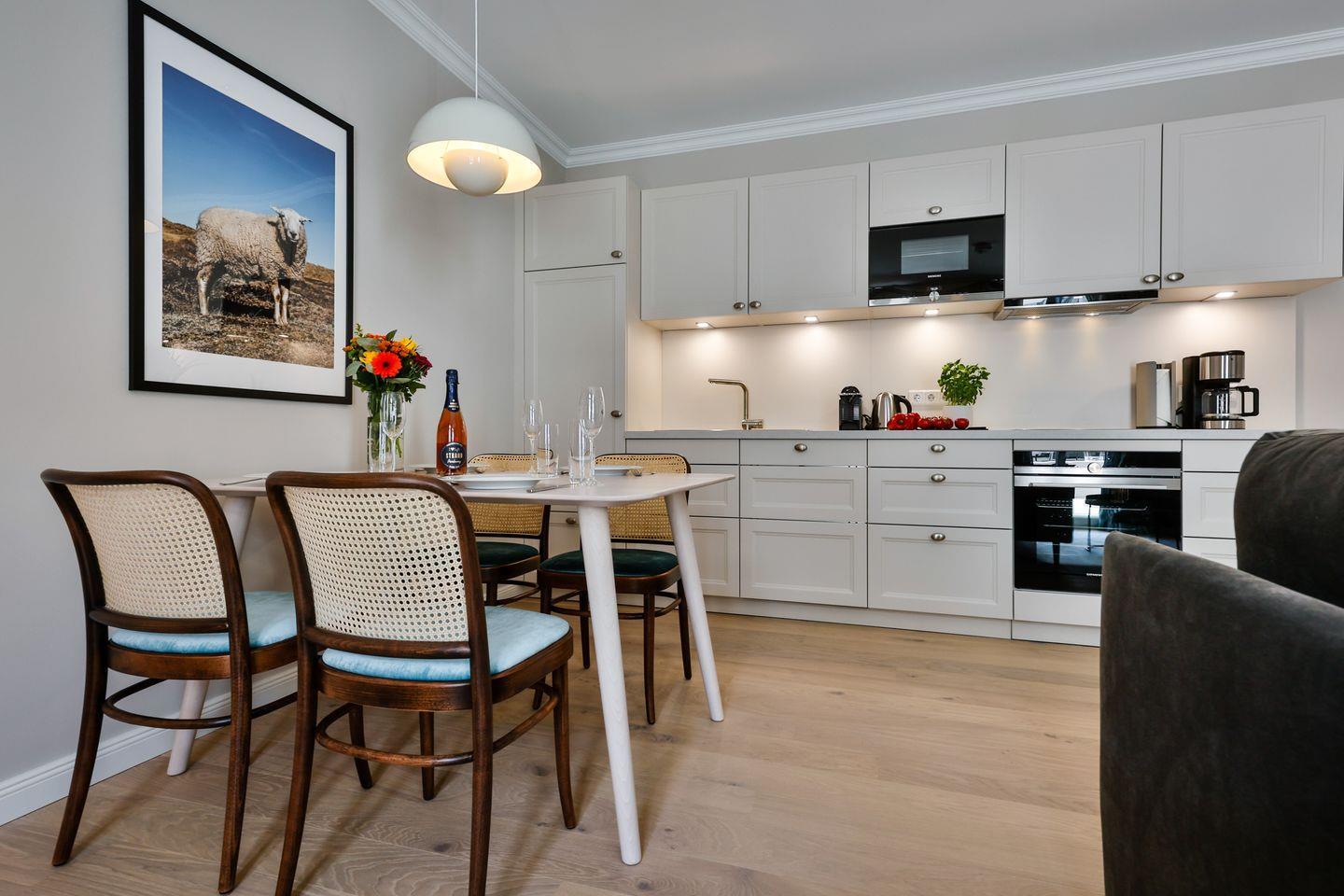 Die offene, modern ausgestattete Küche bietet alles, was Sie in einer Küche erwarten. Hochwertige Elektrogeräte und eine umfangreiche Ausstattung machen das Kochen und Zubereiten zum Genuss. Im angrenzenden Essbereich finden Sie einen gemütlichen Platz für gemeinsame Mahlzeiten und gesellige Runden.