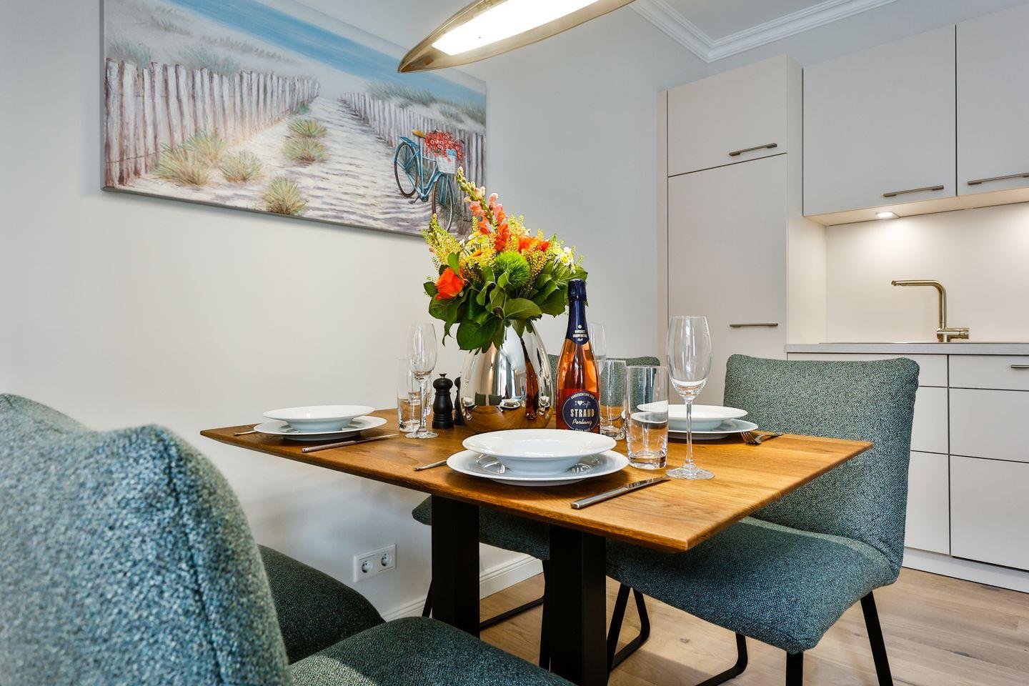 Die offene und komplett ausgestattete Küche bietet alle Annehmlichkeiten, die Sie erwarten. Hochwertige Elektrogeräte und eine umfangreiche Ausstattung machen das Kochen und Zubereiten zum Genuss. Der angrenzende Essbereich ist ideal für entspannte Mahlzeiten oder gesellige Runden.