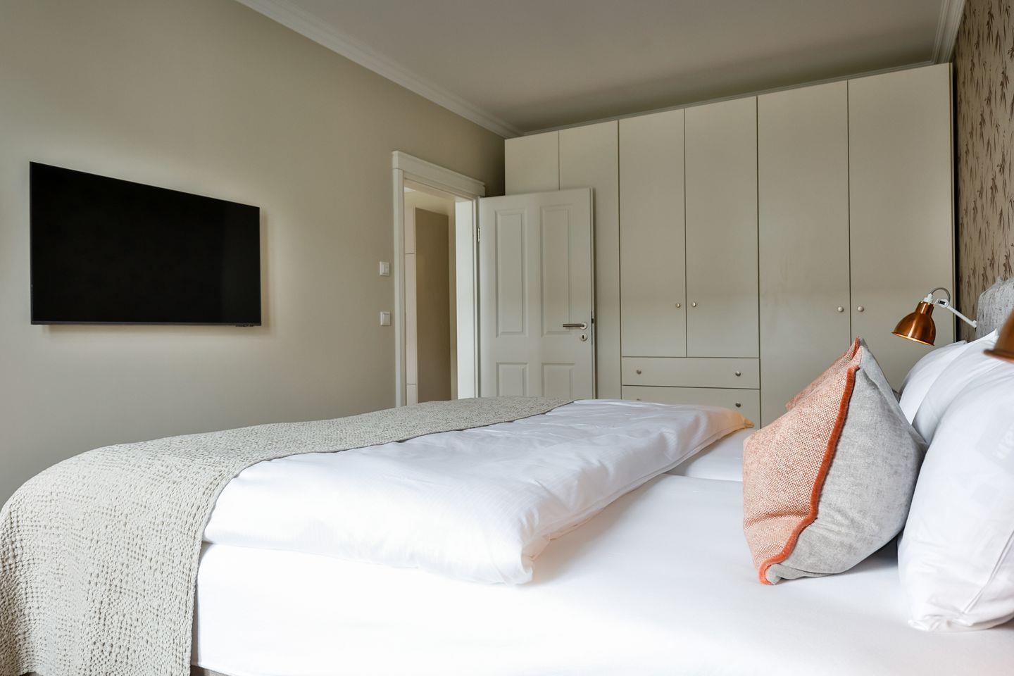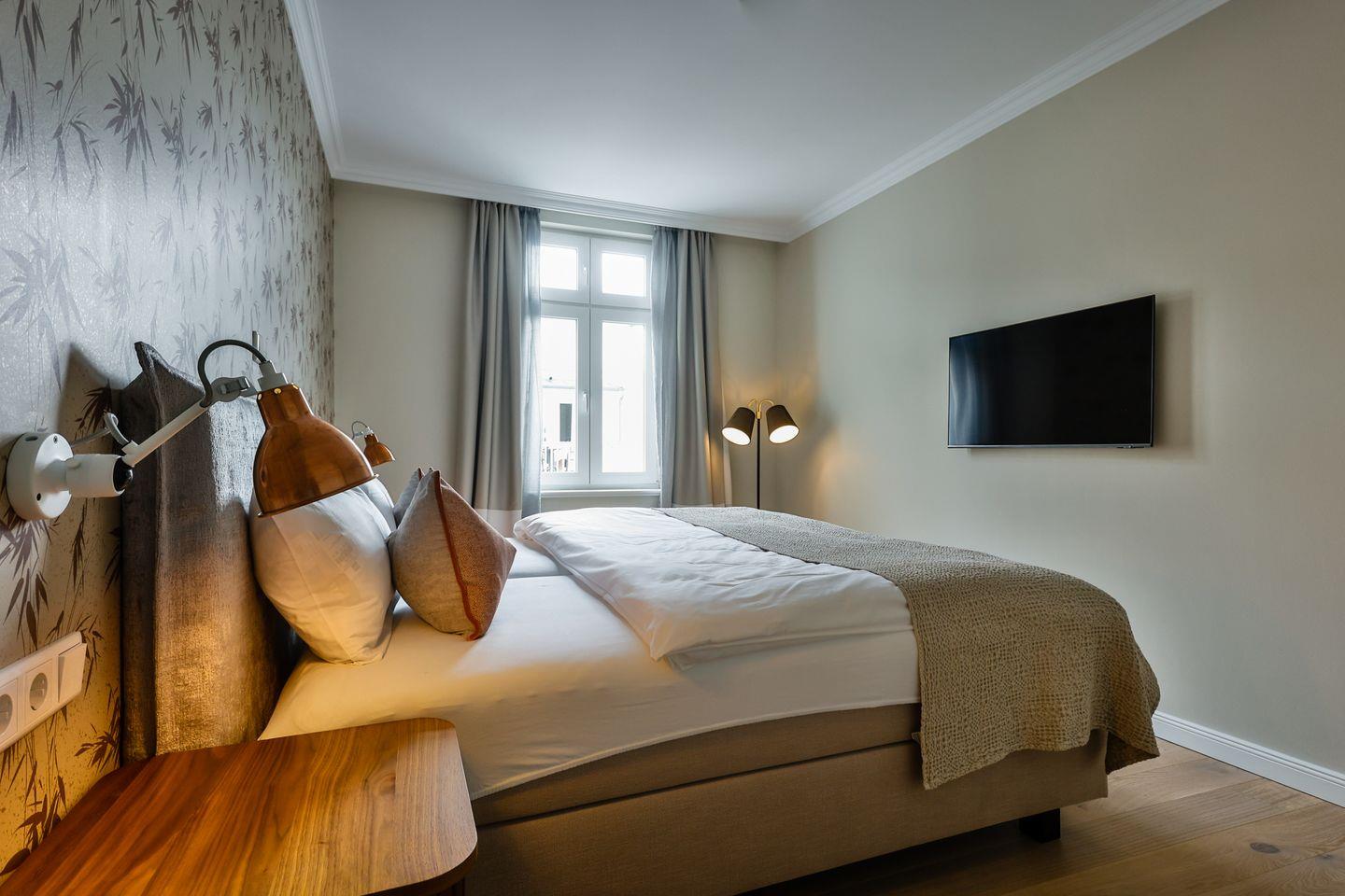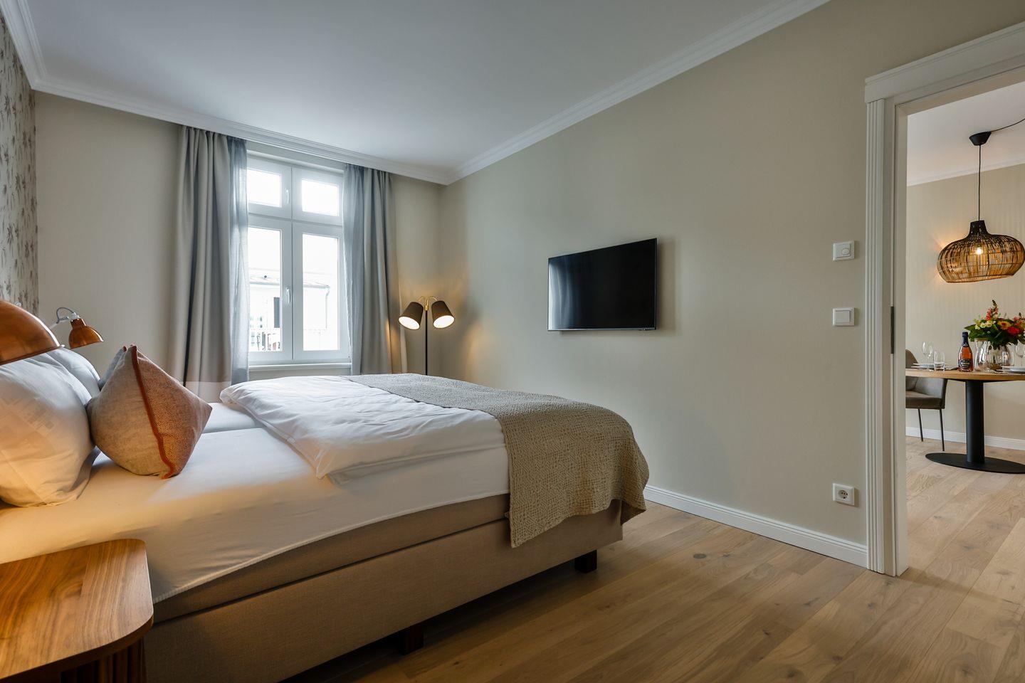 Das großzügige Schlafzimmer ist geschmackvoll eingerichtet und mit einem komfortablen Boxspringbett (180x200 cm) und TV ausgestattet. Ein ruhiges Ambiente sorgt für erholsame Nächte. Im hellen Badezimmer wählen Sie zwischen einer ebenerdigen Dusche für einen guten Start in den Tag und einer Badewanne zum Entspannen und Wohlfühlen. WC und Fön runden die Ausstattung ab.