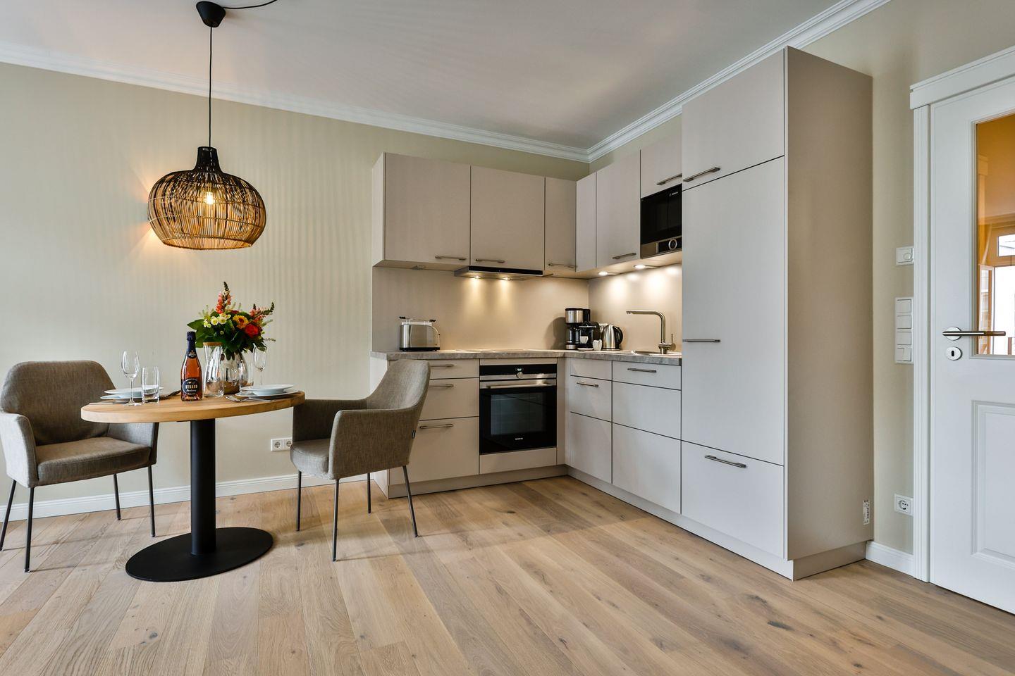 Die offene Küche bietet alles, was Sie in einer Küche erwarten. Hochwertige Elektrogeräte und eine umfangreiche Ausstattung machen das Kochen und Zubereiten zum Genuss. Im angrenzenden Essbereich finden Sie gemütlich Platz für gemeinsame Mahlzeiten und gesellige Runden.