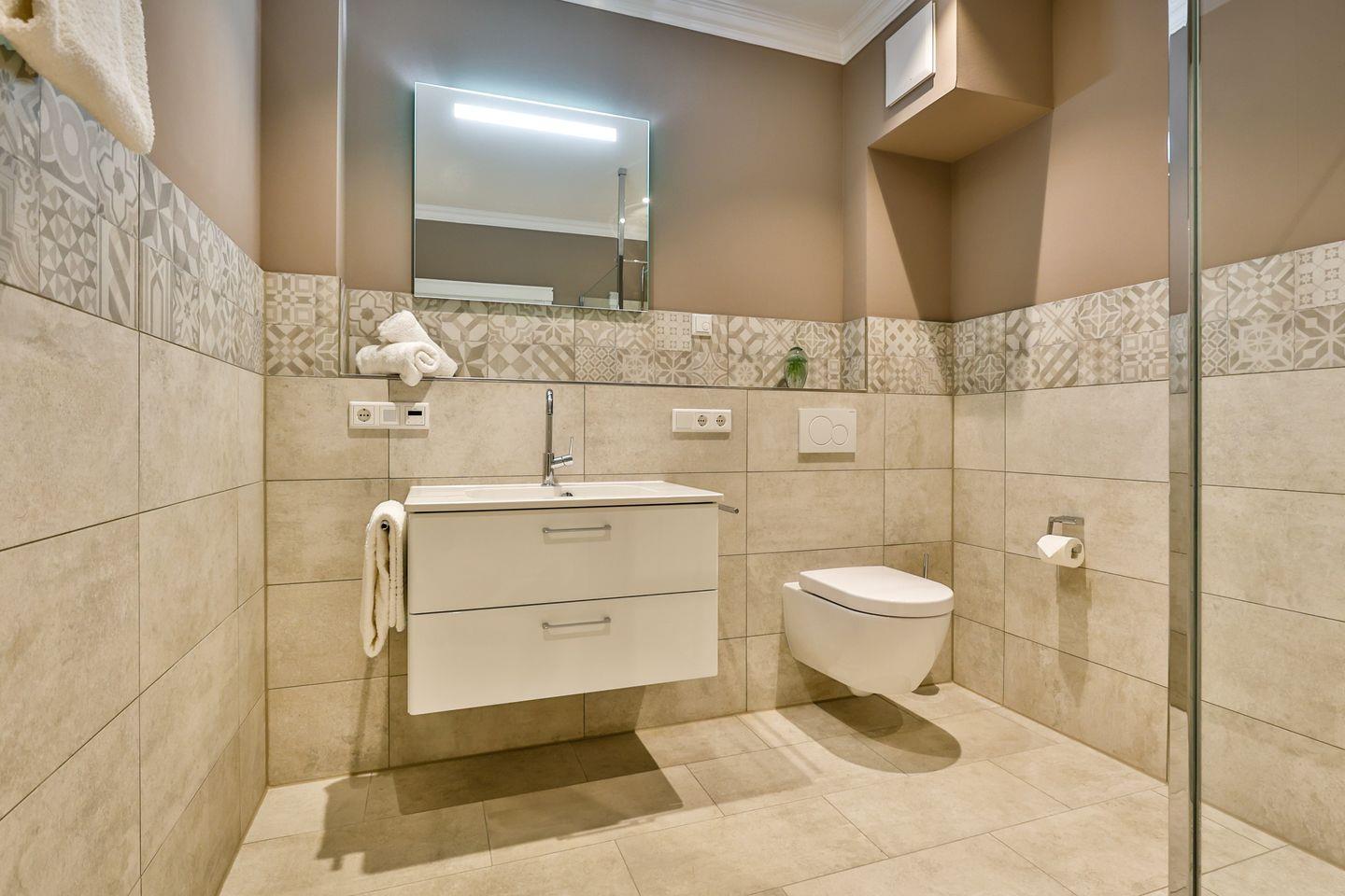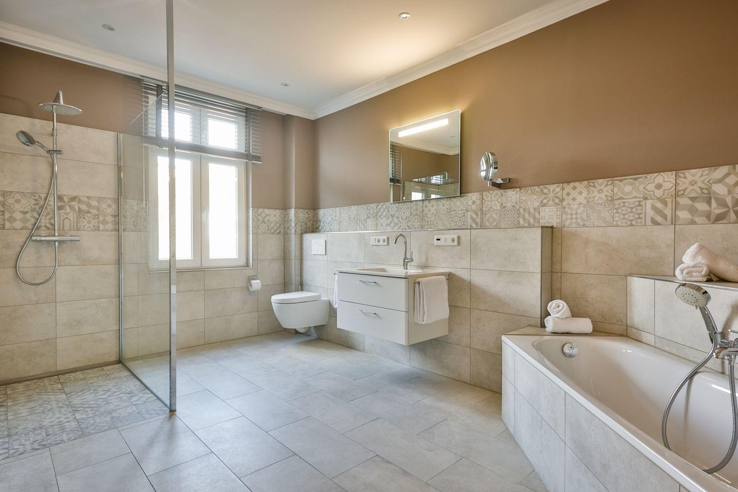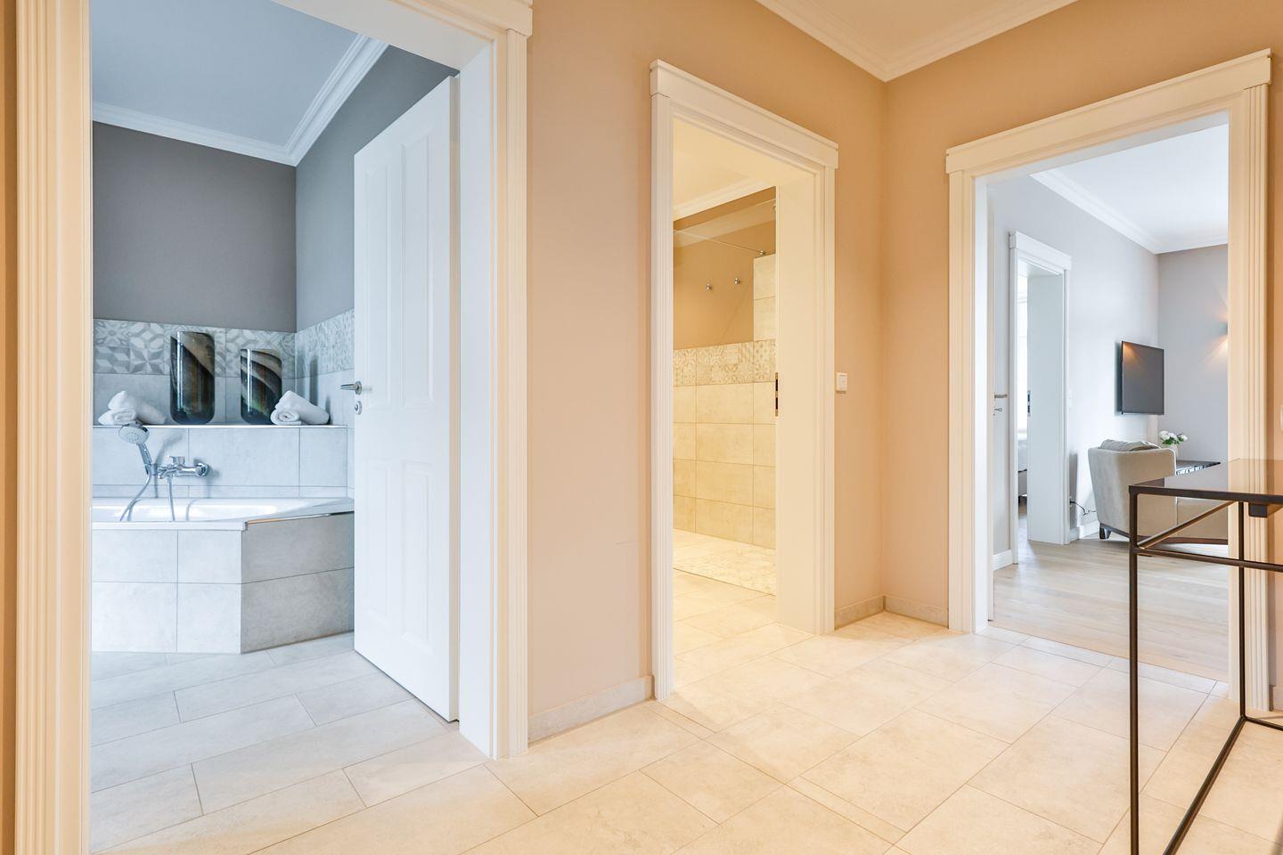 Beide Schlafzimmer sind sehr geschmackvoll eingerichtet und bieten höchsten Schlafkomfort. Das Hauptschlafzimmer ist mit einem Boxspringbett (180x200 cm) und TV ausgestattet. Das zweite Schlafzimmer ist ebenfalls mit einem Boxspringbett (180x200 cm) und TV eingerichtet. Bei Bedarf kann für eine fünfte Person ein Zustellbett bereitgestellt werden. Die Wohnung bietet zwei moderne Badezimmer, die mit ebenerdigen Duschen, WC und Fön ausgestattet sind. Ein Badezimmer hat zusätzlich eine Badewanne zum Entspannen und Wohlfühlen. Abgerundet wird der Bereich durch ein separates Gäste-WC.