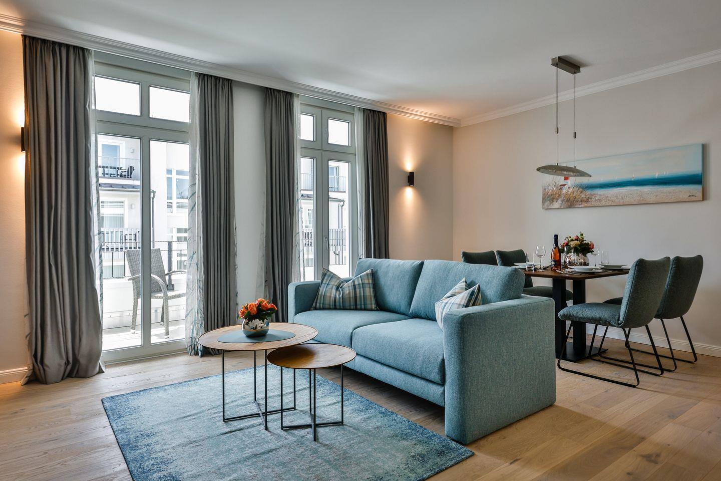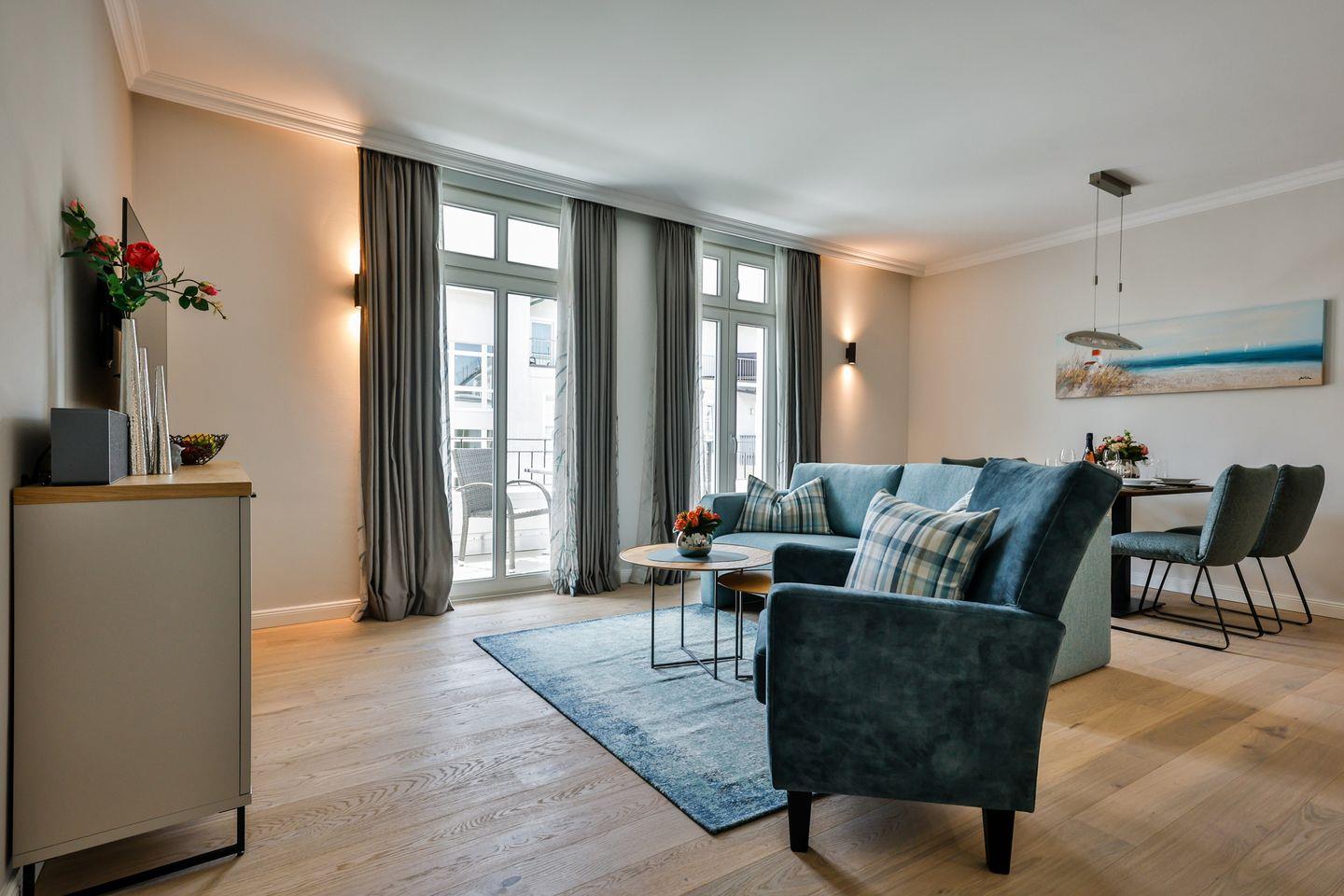 Der lichtdurchflutete Wohn- und Essbereich lädt zum Verweilen ein und führt direkt auf die sonnige Loggia in Südausrichtung. Hier scheint die Sonne zu fast jeder Tageszeit oder Sie lassen dort den Abend gemütlich ausklingen. Die hochwertige Loewe klang s3-Anlage sorgt für ein exklusives Klangerlebnis und bietet Digital-Radio, Bluetooth, CD-Player und USB-Anschlüsse. Ein hochwertiges Funktionssofa (140x200 cm) ist für 1 Erwachsenen oder bis zu 2 Kinder bestens zum Schlafen geeignet. Für eine Buchung mit 2 Erwachsenen und 2 Kindern kontaktieren Sie uns bitte telefonisch oder senden uns eine Email.