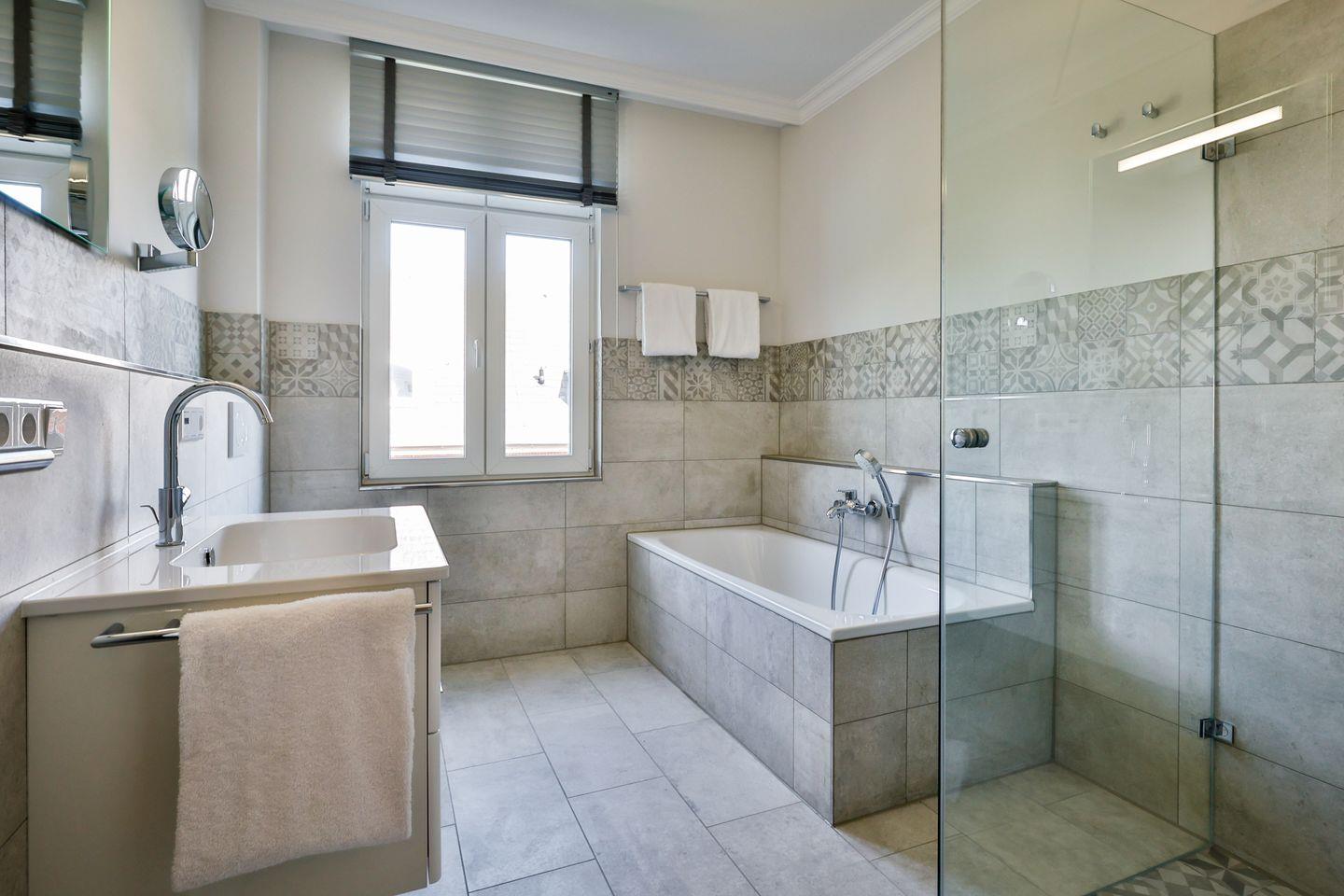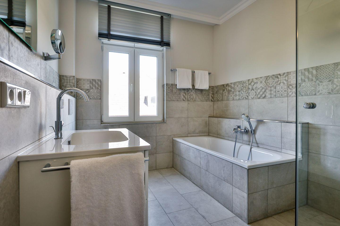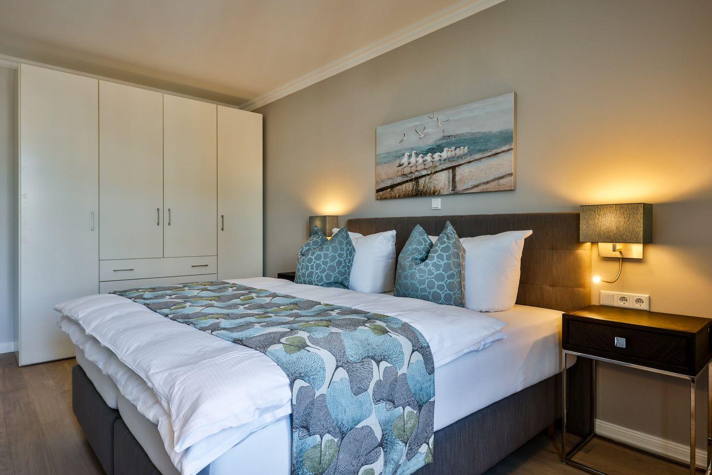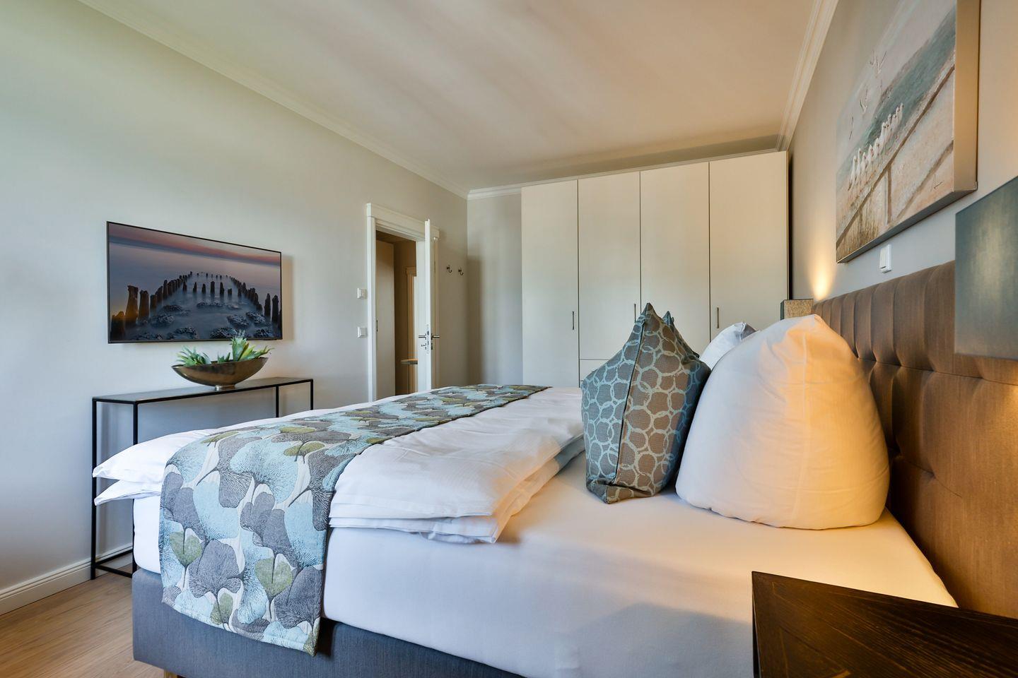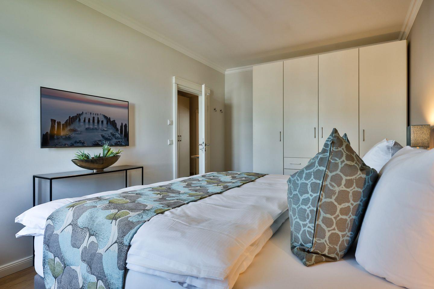 Das Schlafzimmer ist geschmackvoll eingerichtet und bietet höchsten Schlafkomfort mit einem hochwertigen Boxspringbett (180x200 cm) und TV. Ein ruhiges Ambiente sorgt für erholsame Nächte. Im modernen Badezimmer erwarten Sie eine ebenerdige Dusche, WC, Fön und zusätzlich eine Badewanne zum Entspannen und Wohlfühlen.