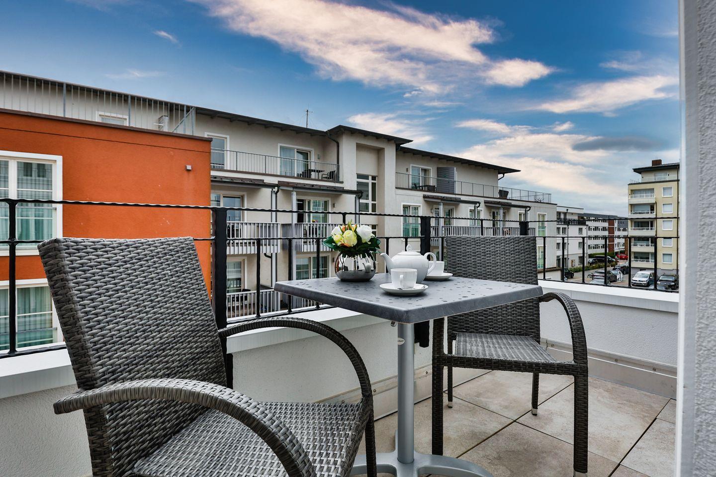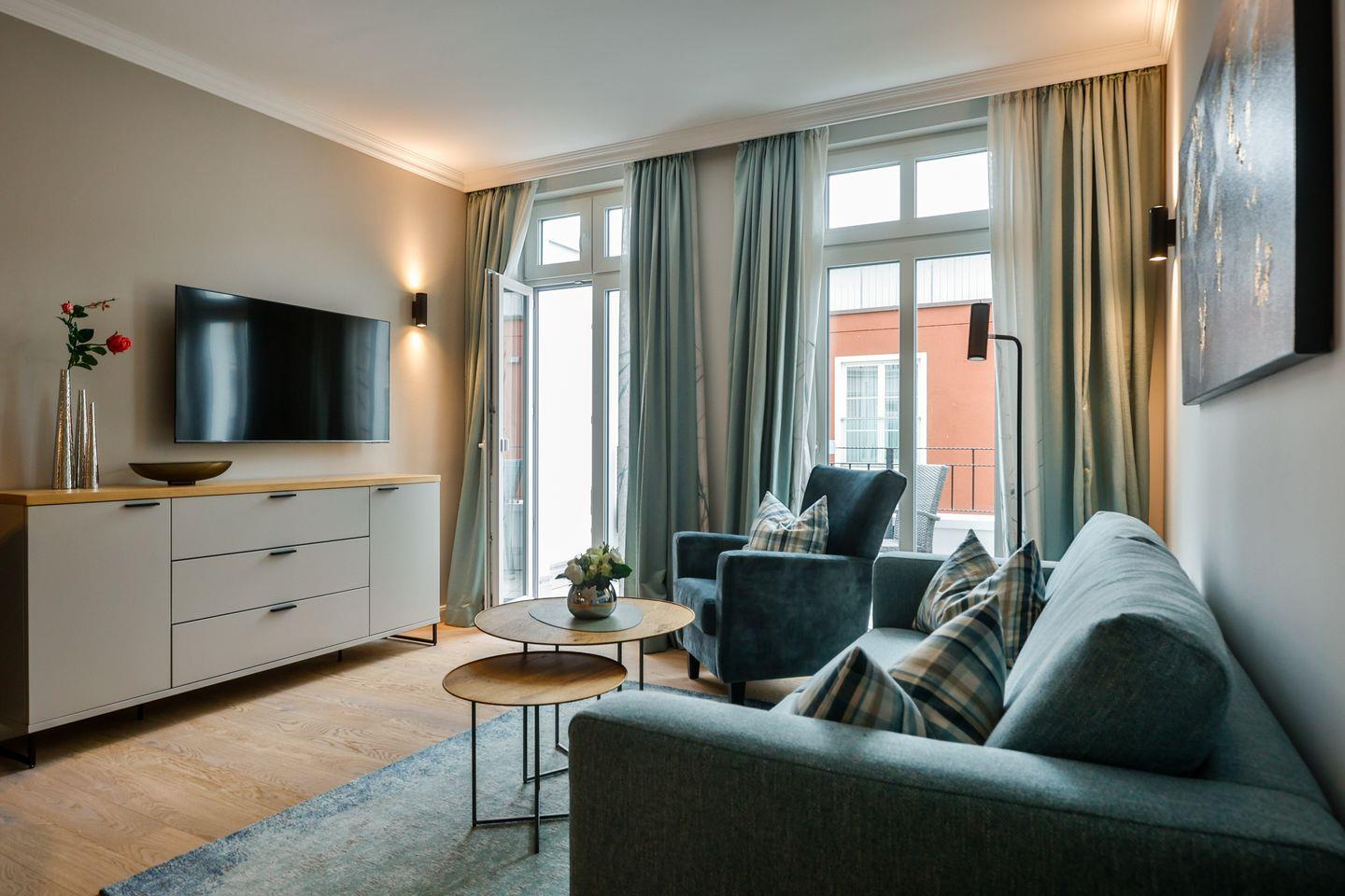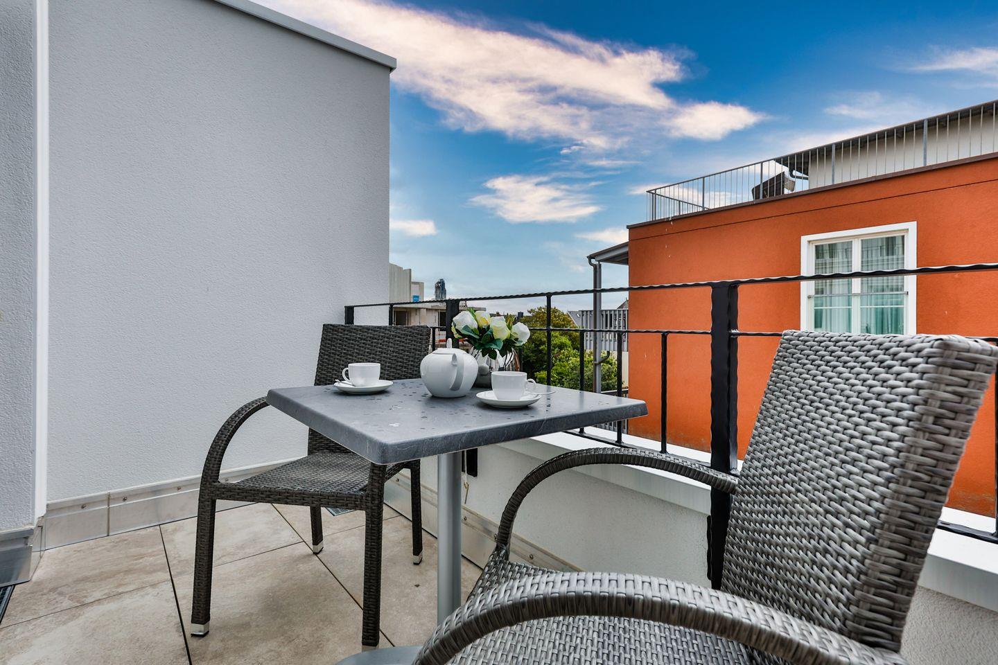 Moderne 2-Zimmer-Ferienwohnung mit Balkon, Wellnessbereich und zentraler Lage in Westerland, nur wenige Schritte vom Strand entfernt.