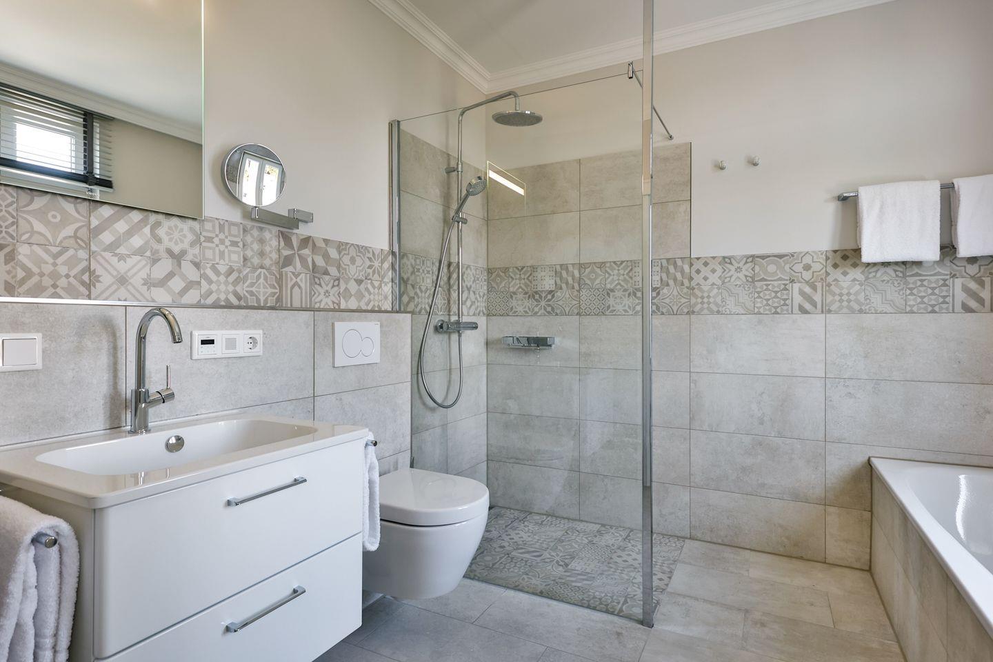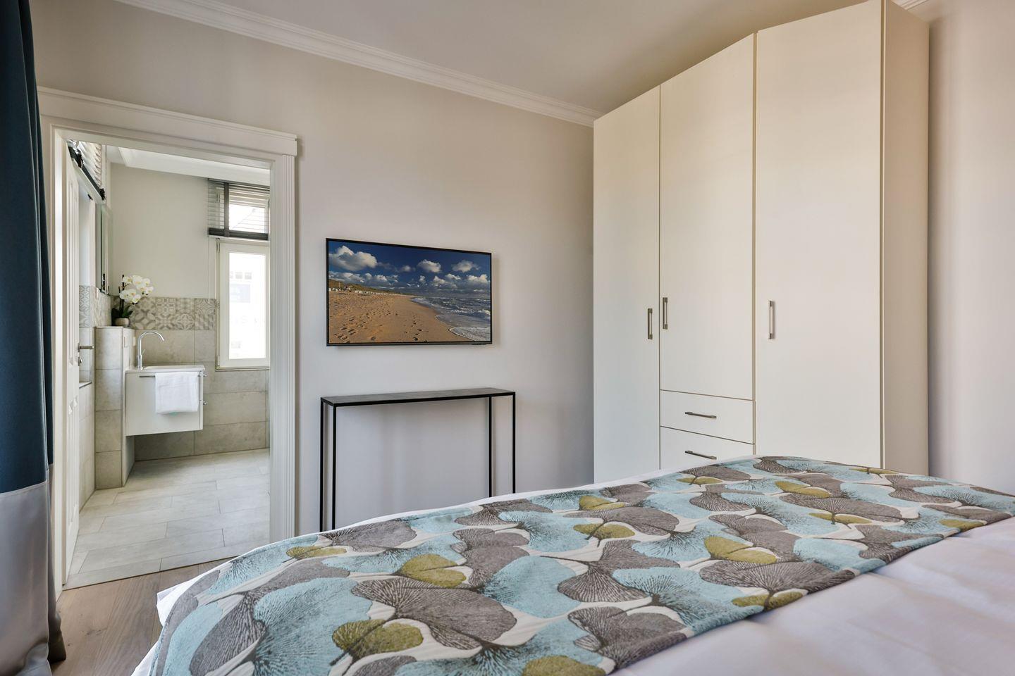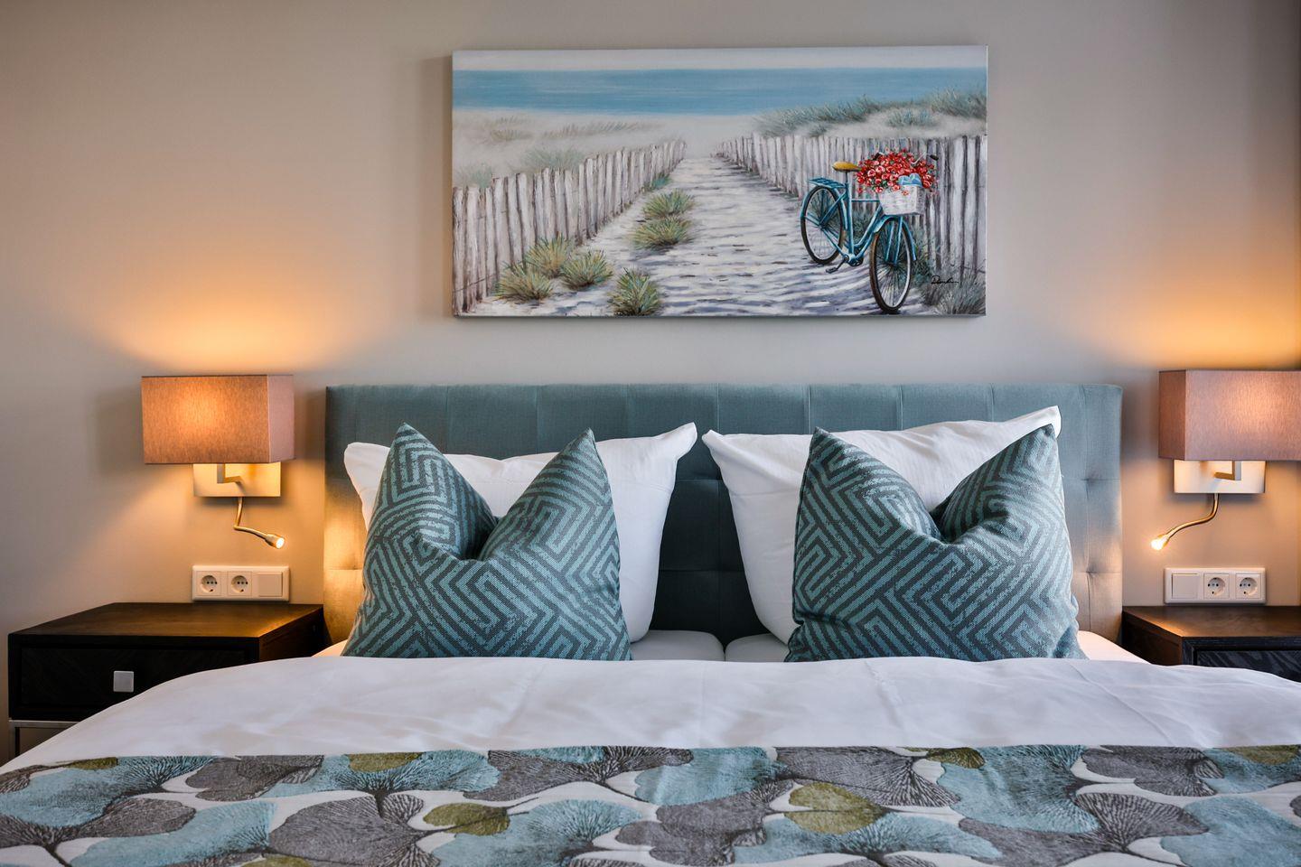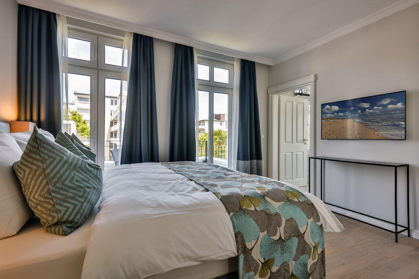 Beide Schlafzimmer sind sehr geschmackvoll eingerichtet und bieten höchsten Schlafkomfort. Das Hauptschlafzimmer ist mit einem Boxspringbett (180x200 cm) und TV ausgestattet. Das zweite Schlafzimmer ist ebenfalls mit einem Boxspringbett (160x200 cm) und TV eingerichtet. Beide Zimmer haben ein ruhiges Ambiente für erholsame Nächte. Die Wohnung bietet zwei moderne Badezimmer, die mit ebenerdigen Duschen, WC und Fön ausgestattet sind; ein Badezimmer hat zusätzlich eine Badewanne zum Entspannen und Wohlfühlen. Abgerundet wird der Bereich durch ein zusätzliches Gäste-WC.