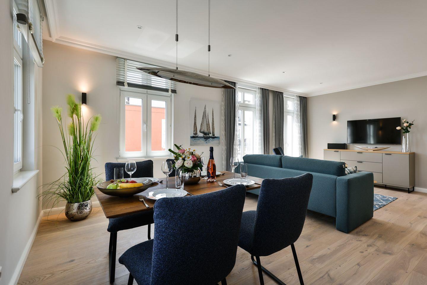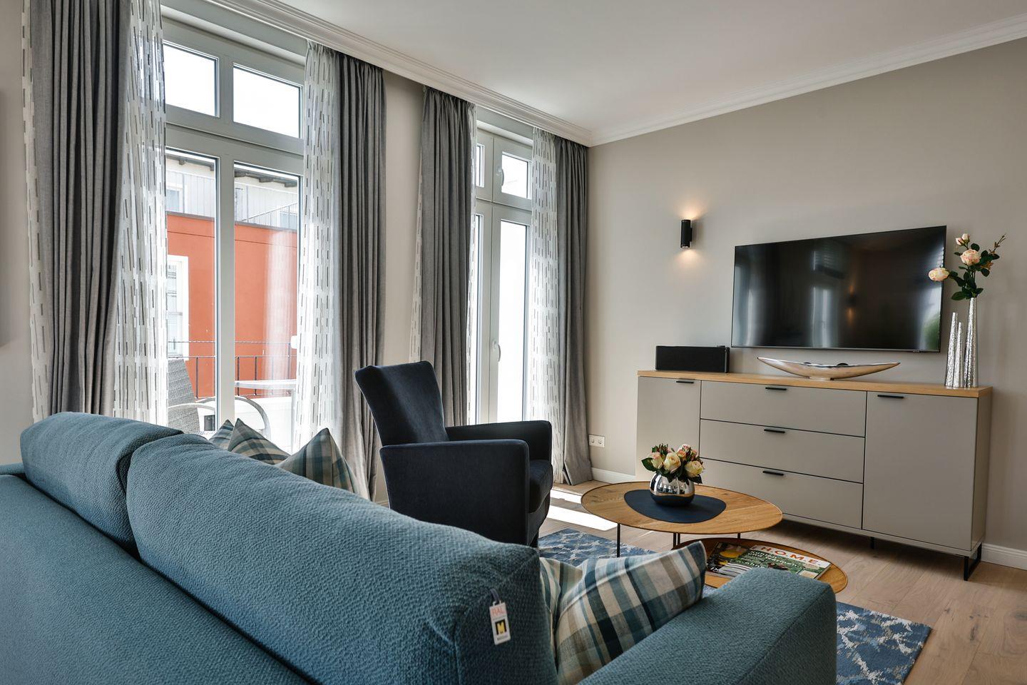 Moderne 3-Zimmer-Ferienwohnung in Westerland mit Wellnessbereich, zwei Balkonen und zentraler Lage, nur 200 m vom Strand entfernt.