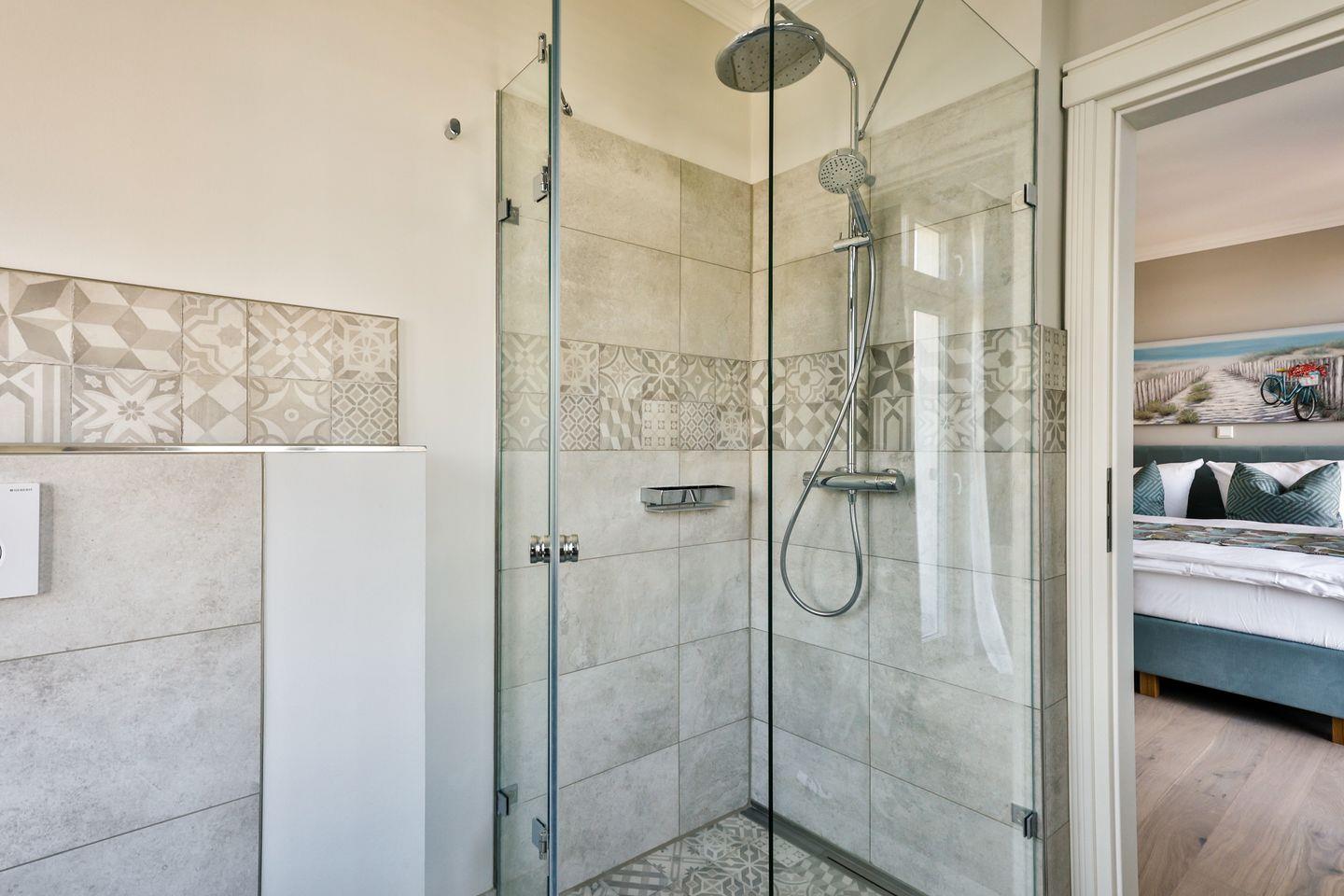 Die Ferienwohnung und das Treppenhaus sind barrierefrei gestaltet. Rollstühle und Rollatoren können dort problemlos abstellt und aufgeladen werden. Die Bäder bieten viel Platz und haben geräumige, ebenerdige Duschen mit bequemer Bewegungsfreiheit. Bitte beachten Sie, dass die Balkonschwelle eine Höhe von 6 cm aufweist und der Zugang daher nicht vollständig barrierefrei ist.