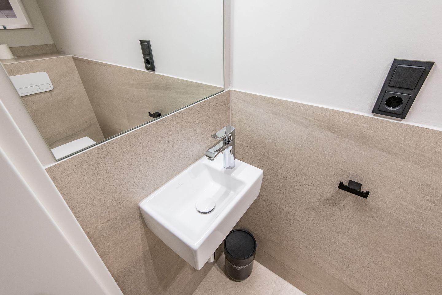 Im Untergeschoss befindet sich das Badezimmer mit ebenerdiger Dusche, WC, Föhn und Handtuchwärmer. Ein zusätzliches Gäste-WC im Erdgeschoss rundet das durchdachte Raumkonzept ab.