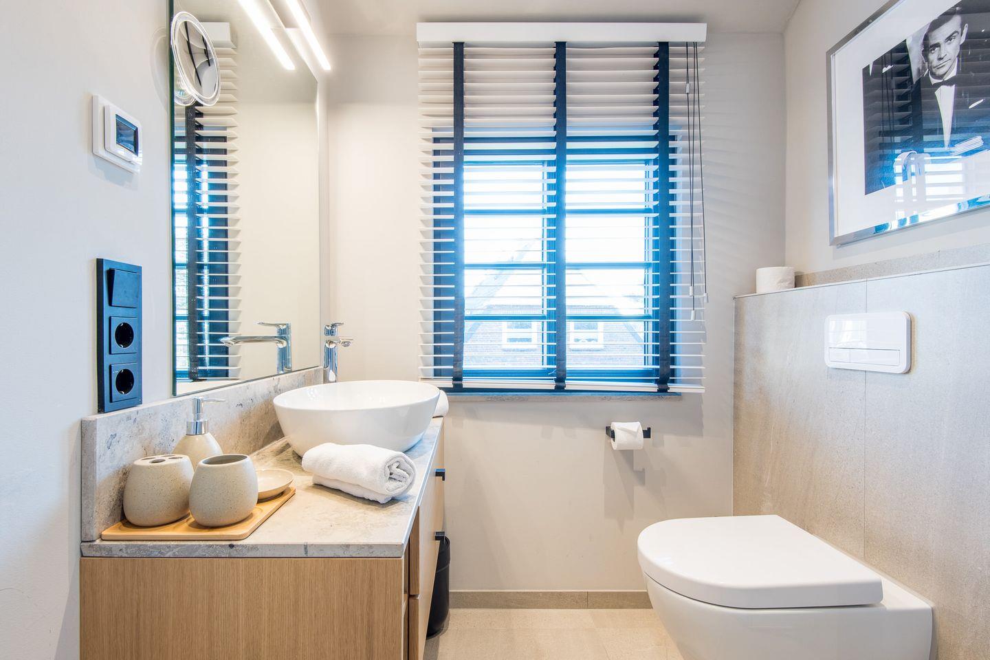 Das moderne Badezimmer bietet eine ebenerdige Dusche, WC, Föhn und Handtuchwärmer und sorgt so für den perfekten Start in den Tag.