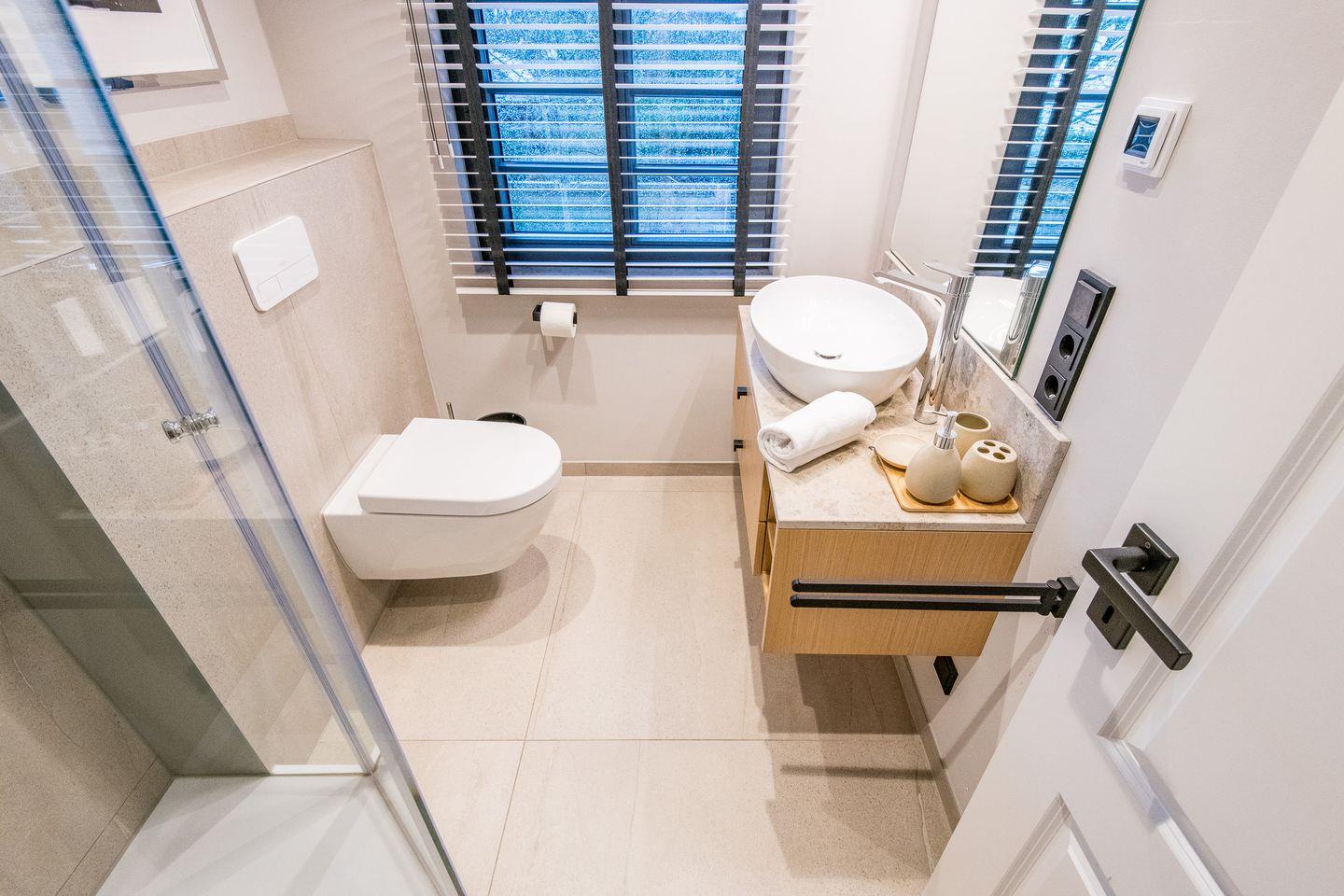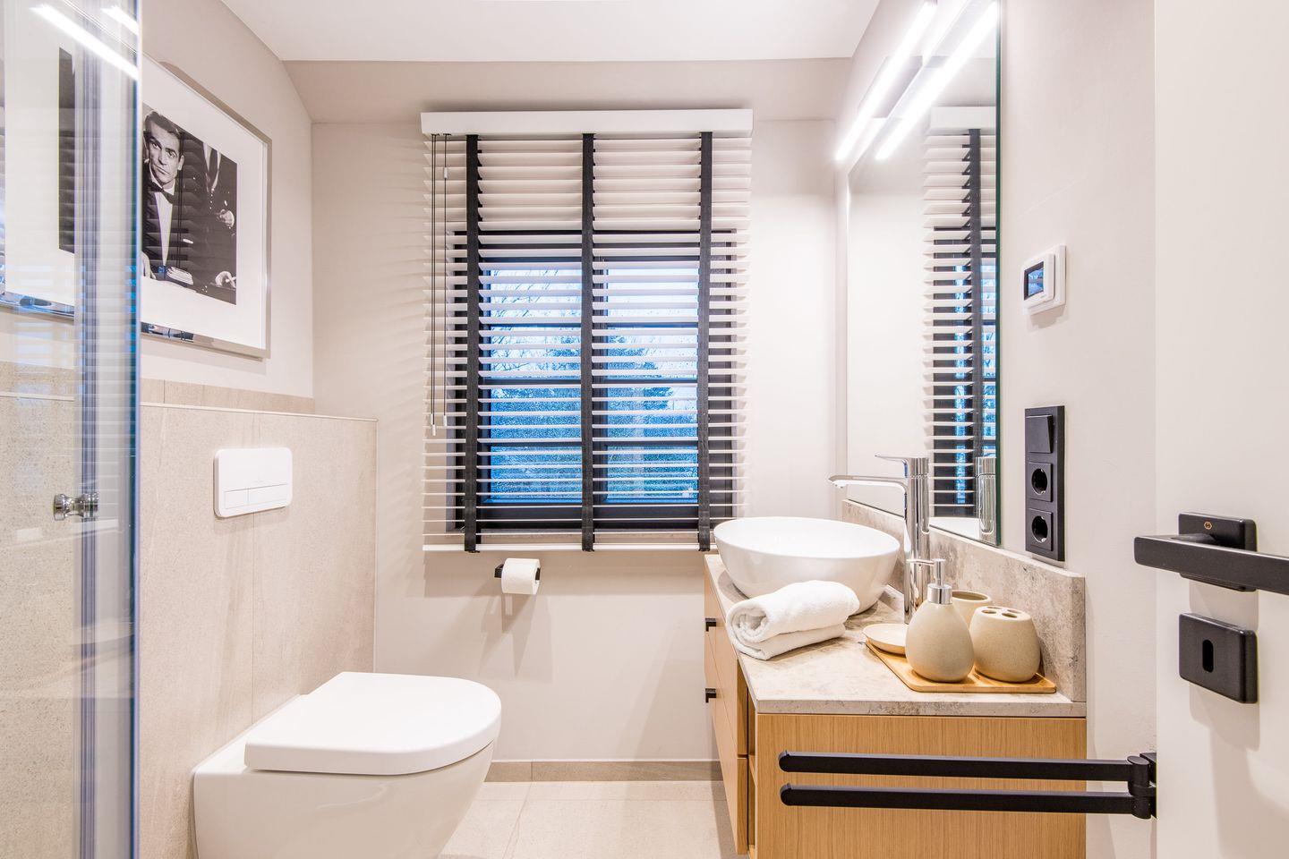 Zwei modern gestaltete Badezimmer, eines davon en Suite, stehen Ihnen zur Verfügung. Das Hauptbadezimmer im Obergeschoss ist mit einer ebenerdigen Dusche, WC, Föhn und Handtuchwärmer ausgestattet, und sorgt für Komfort und Erfrischung.