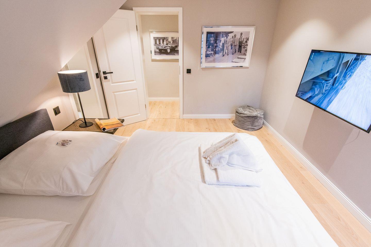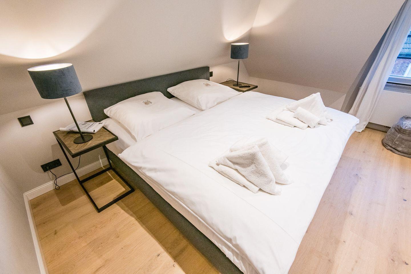 Die zwei geräumigen Schlafzimmer bieten jeweils ein komfortables Boxspringbett (180x200 cm) und einen eigenen TV. Das erste Schlafzimmer verfügt über ein Badezimmer en Suite und garantiert so maximale Privatsphäre. Ein dritter Raum im Dachgeschoss bietet zusätzlichen Platz und kann als Rückzugsort genutzt werden.