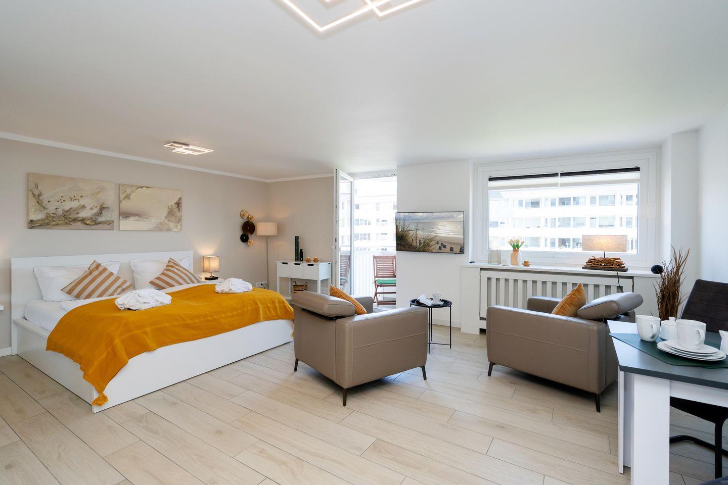 Sunset - das moderne, ca. 37 m² große 1-Zimmer App. für bis zu 2 Personen befindet sich im 3. Stock und bietet Ihnen eine Kombination aus hochwertiger Ausstattung und höchstem Komfort. Die große offene Küche samt Geschirrspüler und Waschtrockner ist voll ausgestattet. Der angrenzende Wohn- und Schlafbereich mit Doppelbett (180x200 cm) und Essecke lädt zur absoluten Entspannung ein. Im Badezimmer erwartet Sie eine großzügige Dusche. Nutzen Sie gerne den sonnigen Westbalkon und genießen den Meerblick auf die Nordsee. Kostenloses WLAN, sowie ein Fahrstuhl sind vorhanden. Haustiere sind erlaubt.