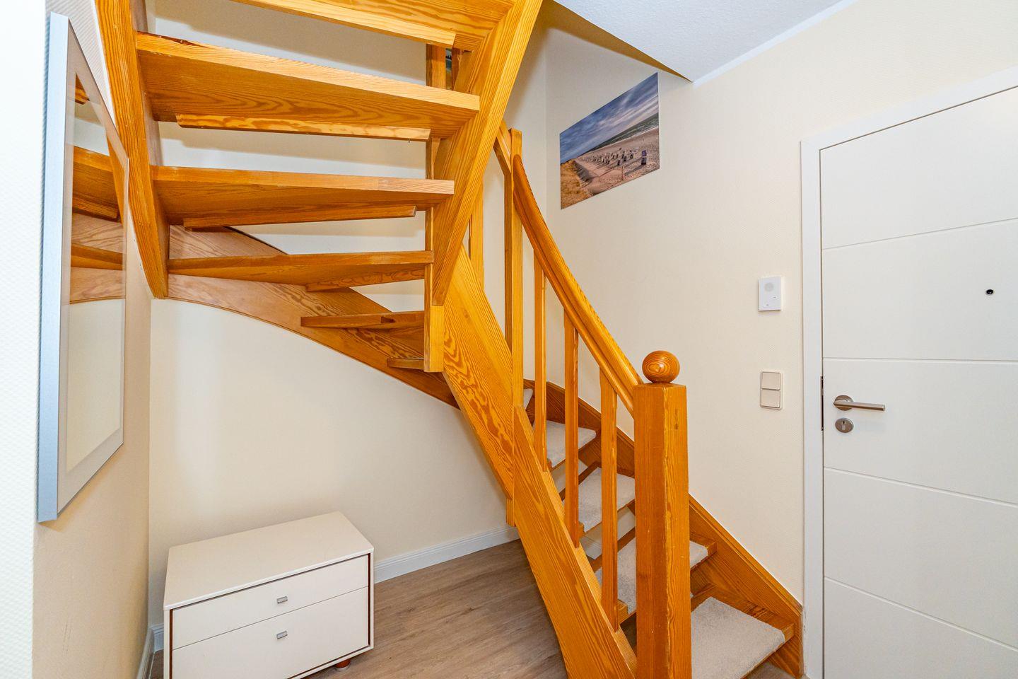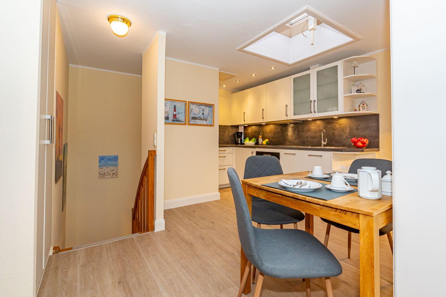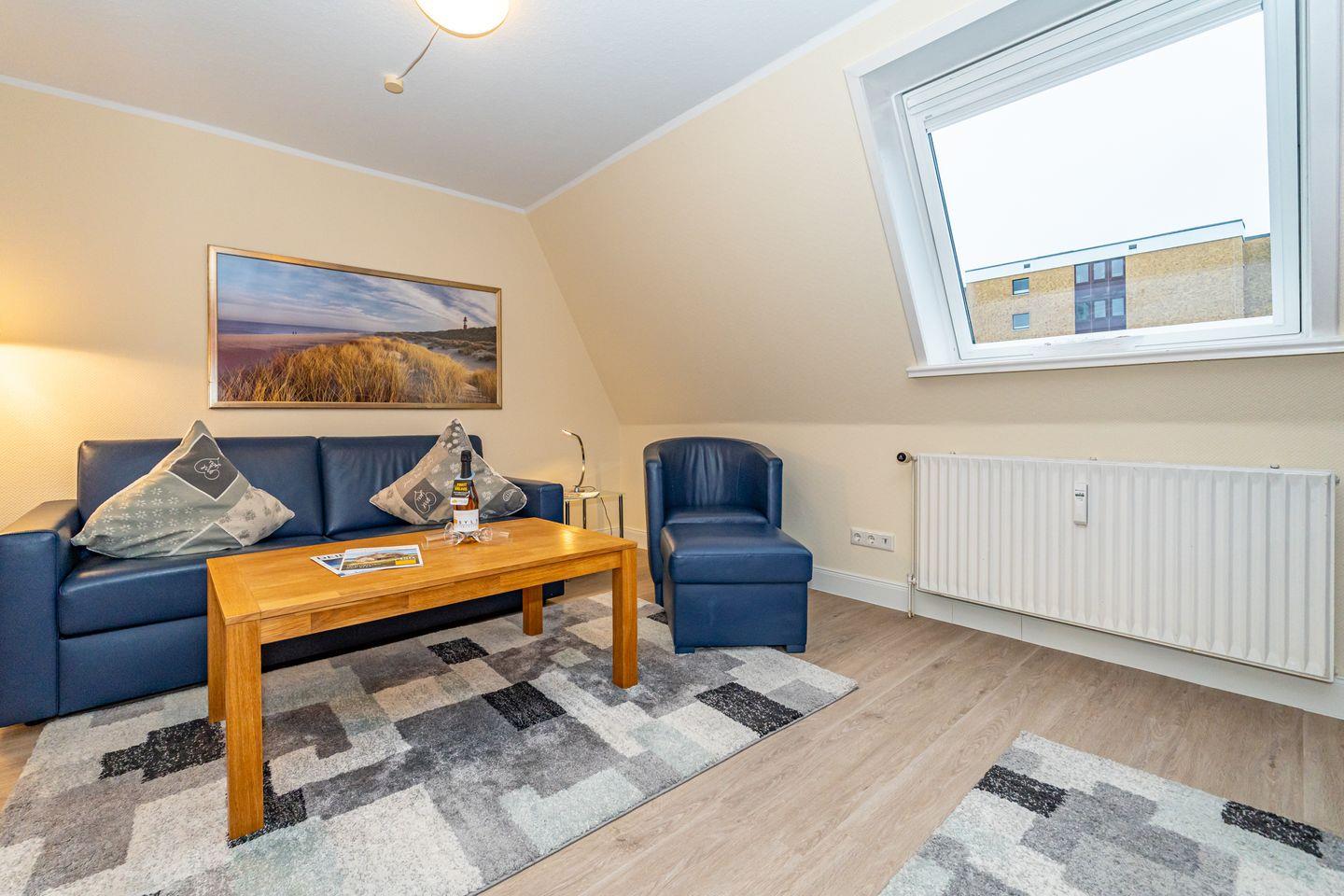 Diese 2 Zimmer Maisonette Ferienwohnung befindet sich in der 2. Etage (ohne Aufzug) wo auch das Schlafzimmer und das Badezimmer mit Dusche und WC liegt. Im Schlafzimmer mit Doppelbett (180 x 200 cm) haben Sie Zugang zum Westbalkon mit Blick auf die Dünen. Über eine bequeme Treppe gelangen Sie in das Dachgeschoss. Dort finden Sie die gemütliche offene Wohnküche mit Esstisch. Im Wohnraum befindet sich eine Schlafcouch. So können Sie zu viert oder auch getrennt in der Ferienwohnung übernachten. Die Ferienwohnung verfügt über einen Stellplatz in der Garage, bitte beachten Sie, dass es sich um eine Duplex Doppelgarage handelt und nicht jedes Auto hinein passt (max. Höhe 150cm).