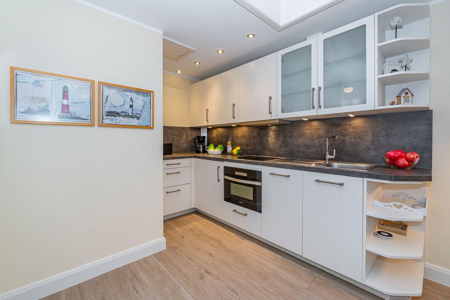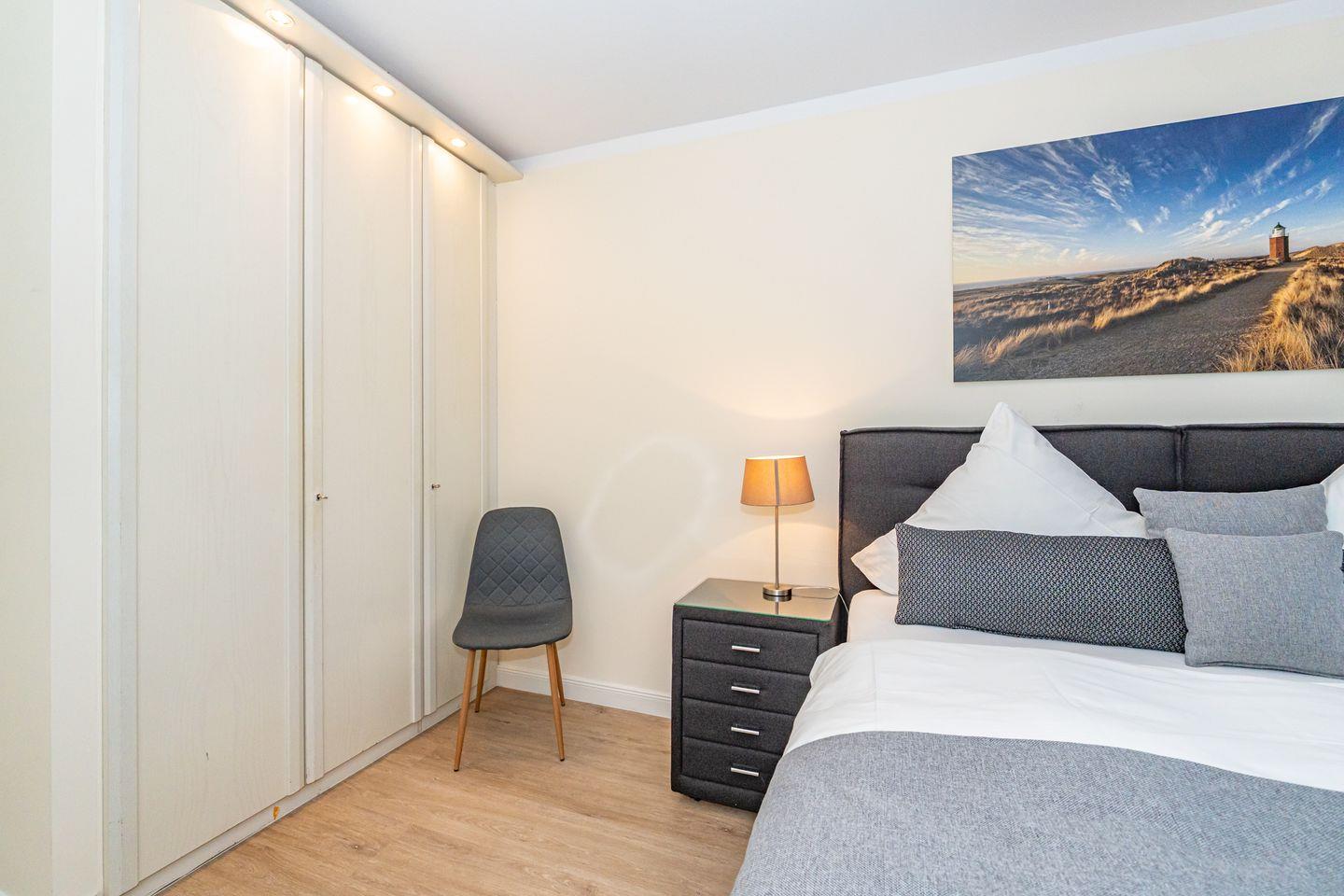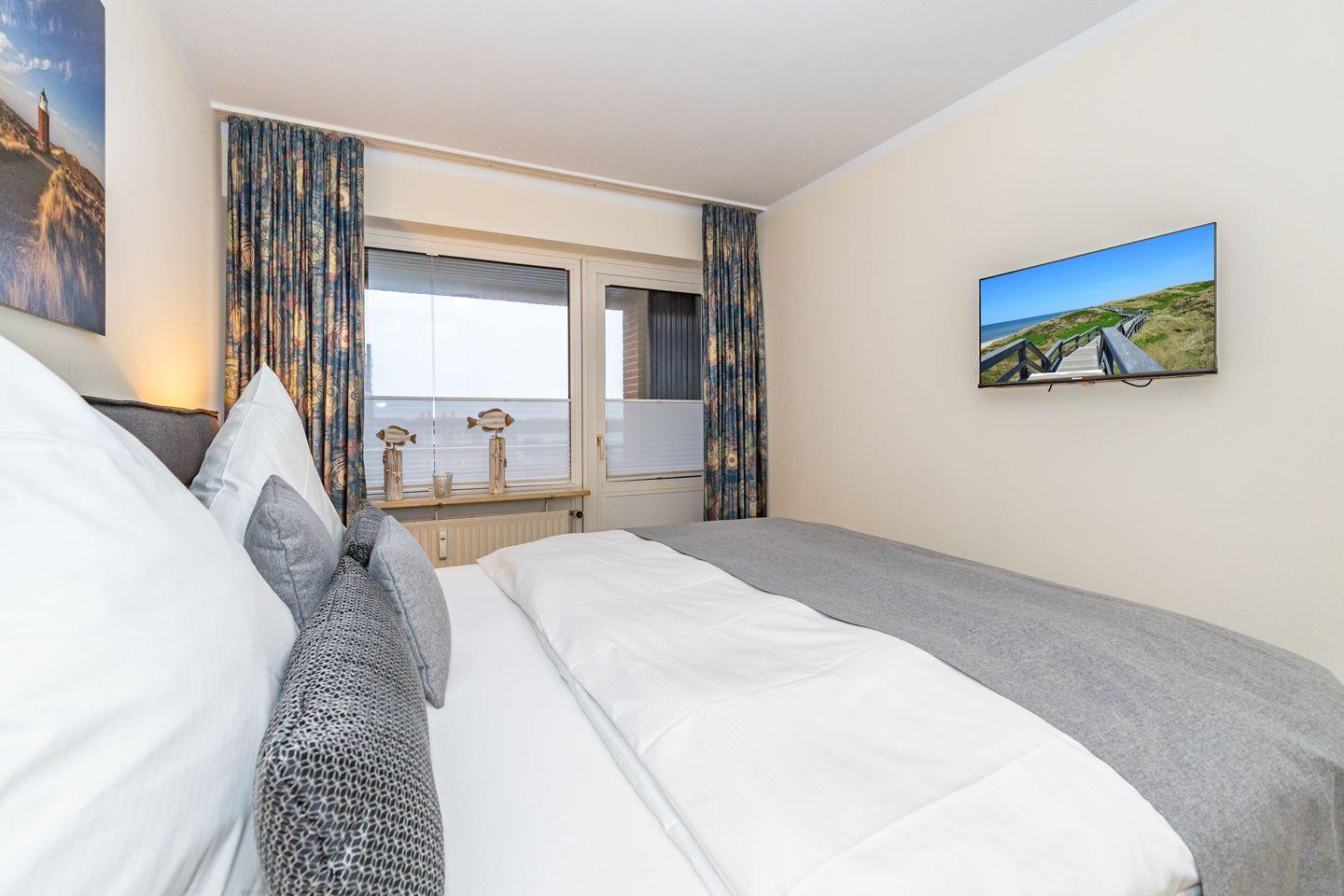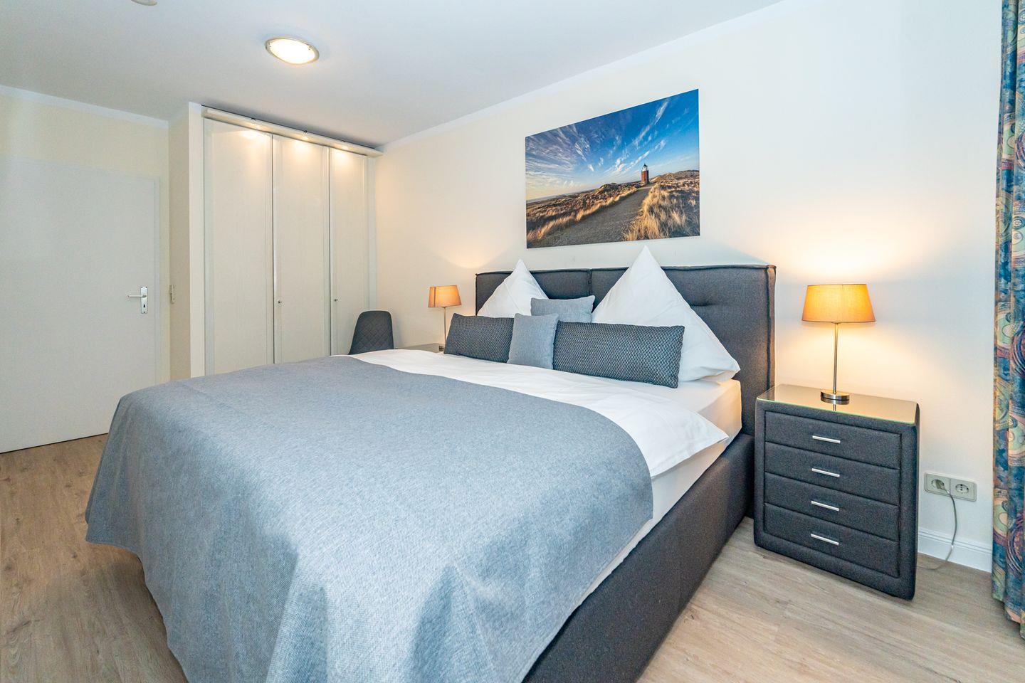 Diese 2 Zimmer Maisonette Ferienwohnung befindet sich in der 2. Etage (ohne Aufzug) wo auch das Schlafzimmer und das Badezimmer mit Dusche und WC liegt. Im Schlafzimmer mit Doppelbett (180 x 200 cm) haben Sie Zugang zum Westbalkon mit Blick auf die Dünen. Über eine bequeme Treppe gelangen Sie in das Dachgeschoss. Dort finden Sie die gemütliche offene Wohnküche mit Esstisch. Im Wohnraum befindet sich eine Schlafcouch. So können Sie zu viert oder auch getrennt in der Ferienwohnung übernachten. Die Ferienwohnung verfügt über einen Stellplatz in der Garage, bitte beachten Sie, dass es sich um eine Duplex Doppelgarage handelt und nicht jedes Auto hinein passt (max. Höhe 150cm).