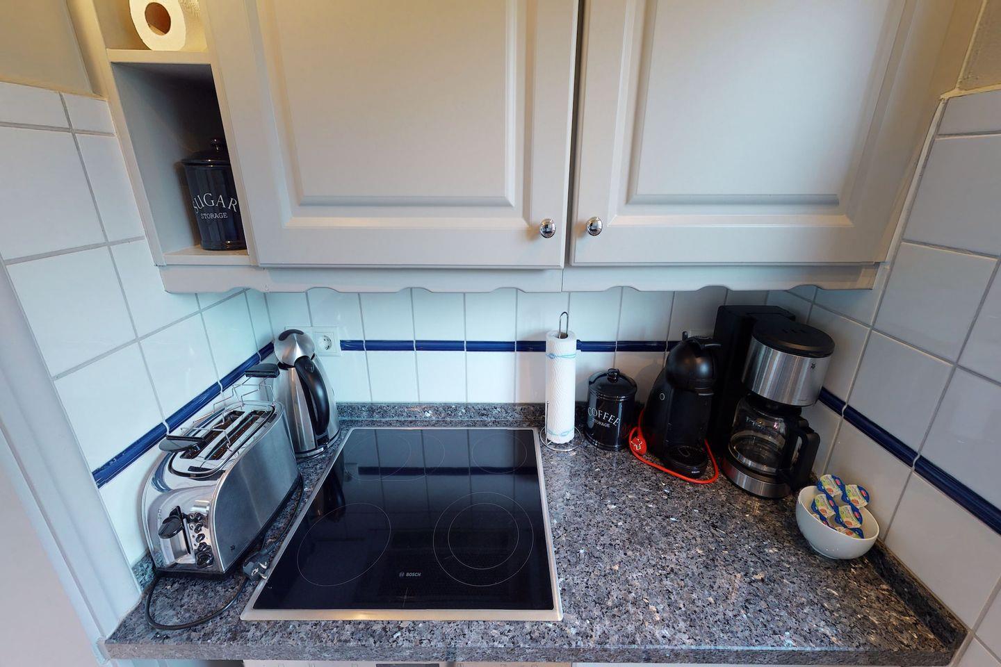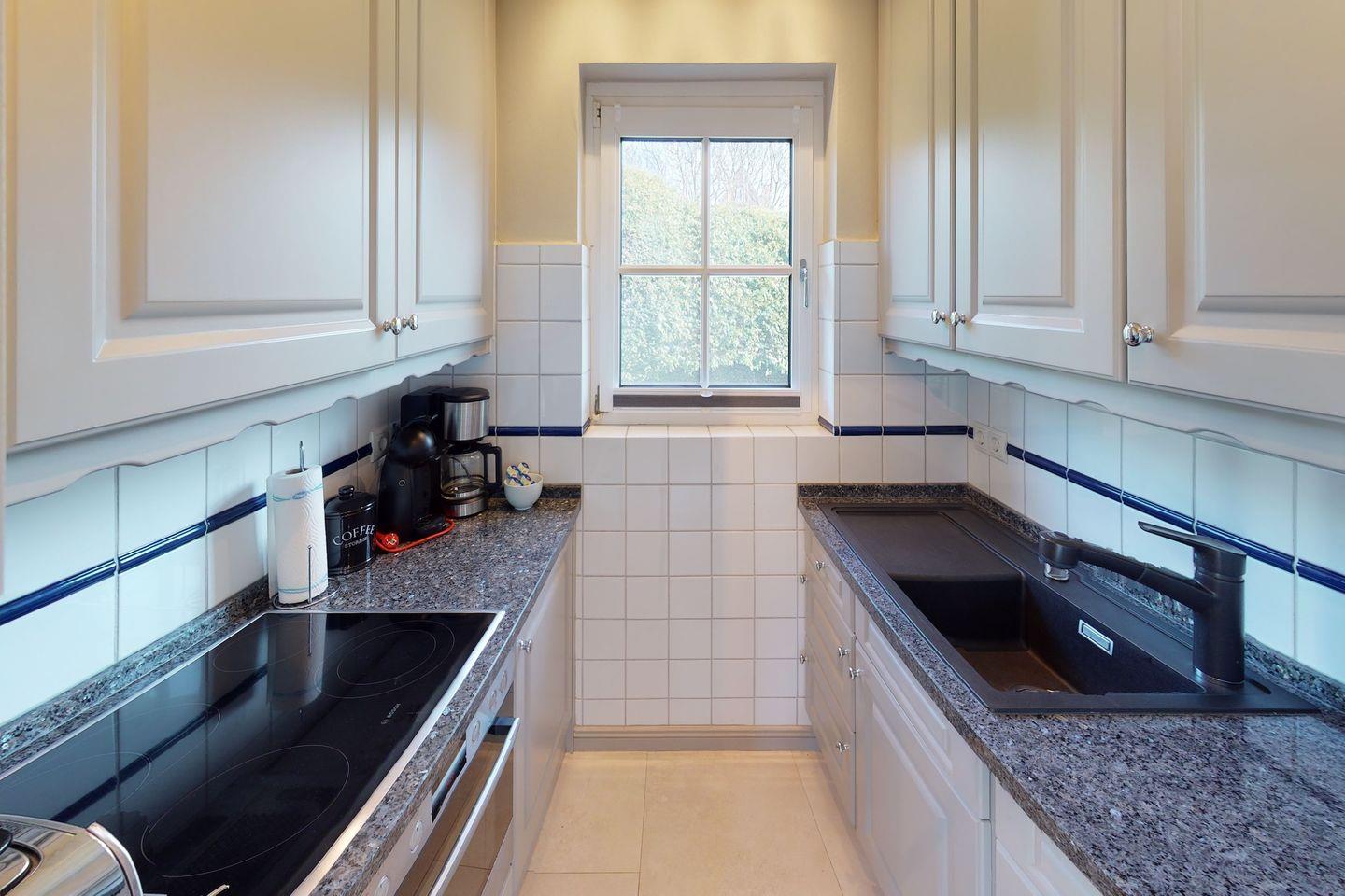 Der nach Süden ausgerichtete Garten mit Gartenmöbeln, Strandkorb und Liegemöglichkeiten bietet die Möglichkeit, die Sonne und die Natur zu genießen. Die zwei Bäder, eins mit Tageslicht und WC, das andere mit Dusche, sowie die voll ausgestattete Küche mit Backofen, Ceranfeld und Kapselkaffeemaschine, sorgen für Komfort und Bequemlichkeit.