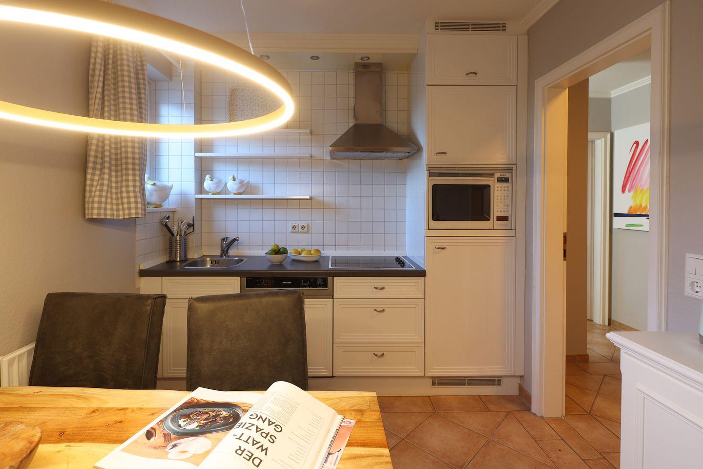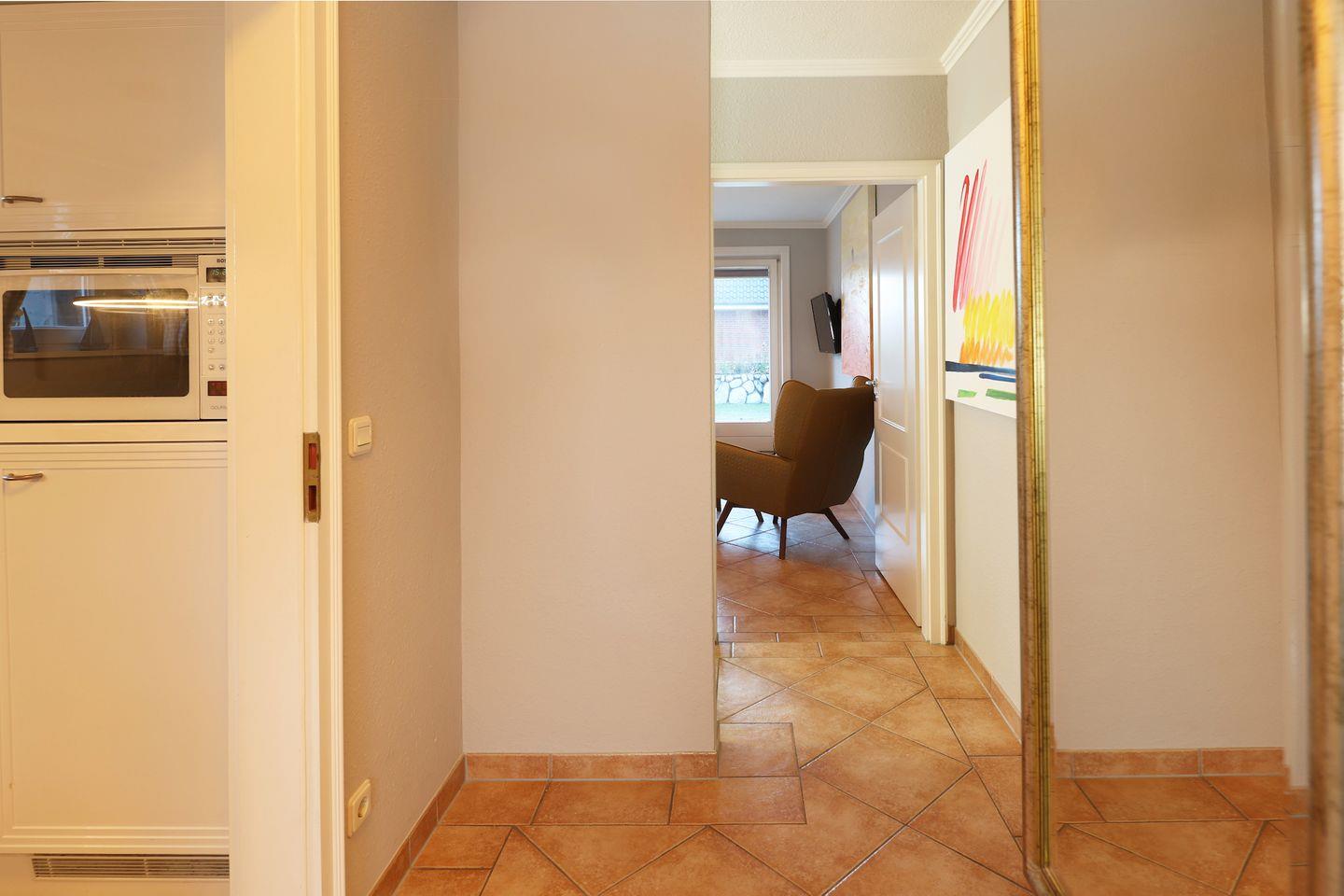 Die helle Erdgeschosswohnung ist ideal für 2-3 Personen und bietet eine separate Küche mit einer Esstischgruppe für 4 Personen, einem Cerankochfeld, Geschirrspüler sowie einem Mikrowellenbackofen. Vom Flur aus gelangt man ins Duschbad, in den Souterrain zum Schlafzimmer mit Flat TV und Einbauschränken. Im Wohnzimmer befindet sich eine bequeme Schlafcouch, Flat TV, Stereoanlage und DVD Player. Vom Wohnzimmer aus haben Sie Zugang zum sonnigen Terrasse, auf dem ein Strandkorb sowie Tisch und Stühle für Sie bereit stehen.