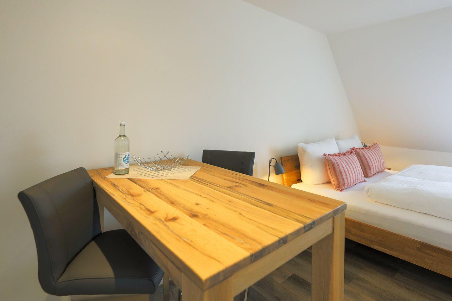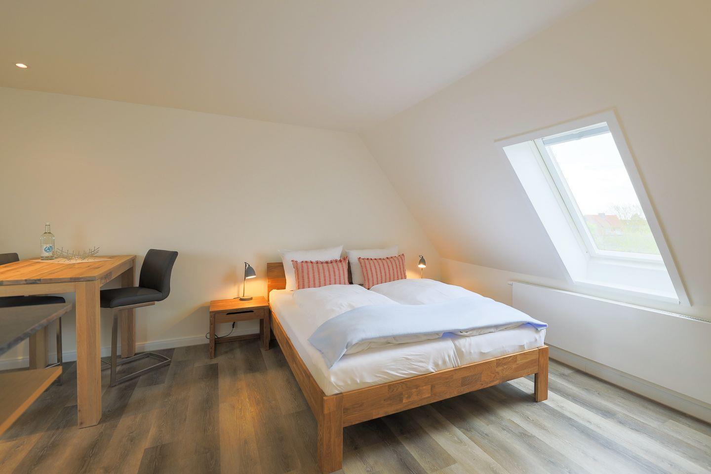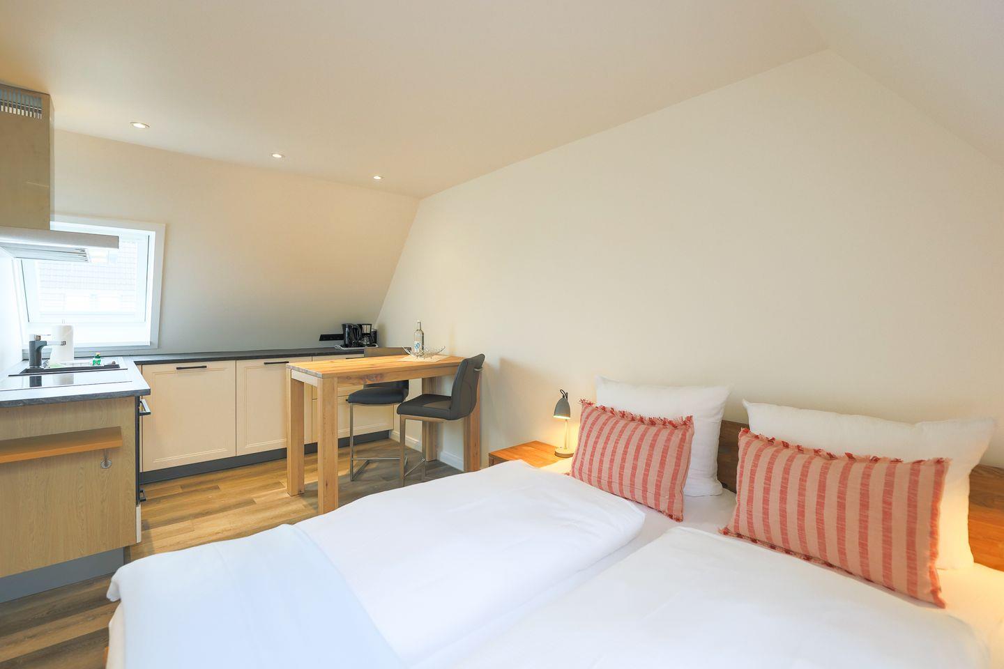 Der Blick aus dem Fenster geht hin bis zum Rantumer Wattenmeer und auch der Blick ins Innere des Studio-Appartements lohnt sich. Küche, Ess- und Schlafbereich gehen fließend ineinander über, aber das fällt bei der klugen Raumaufteilung kaum auf. Und so macht es sich das bequeme Doppelbett neben dem hohen Esstisch gemütlich, während die große Küchenzeile sich in die Ecke kuschelt. Alles ist im cleanen Skandi-Look gehalten und wirkt trotzdem gemütlich. Passend dazu präsentiert sich auch das Duschbad in einem modernen Beige-Weiß Look und mit einem großen Fenster.