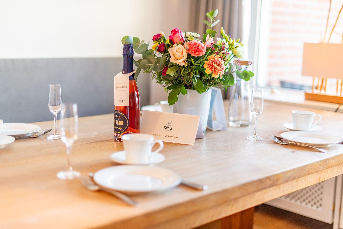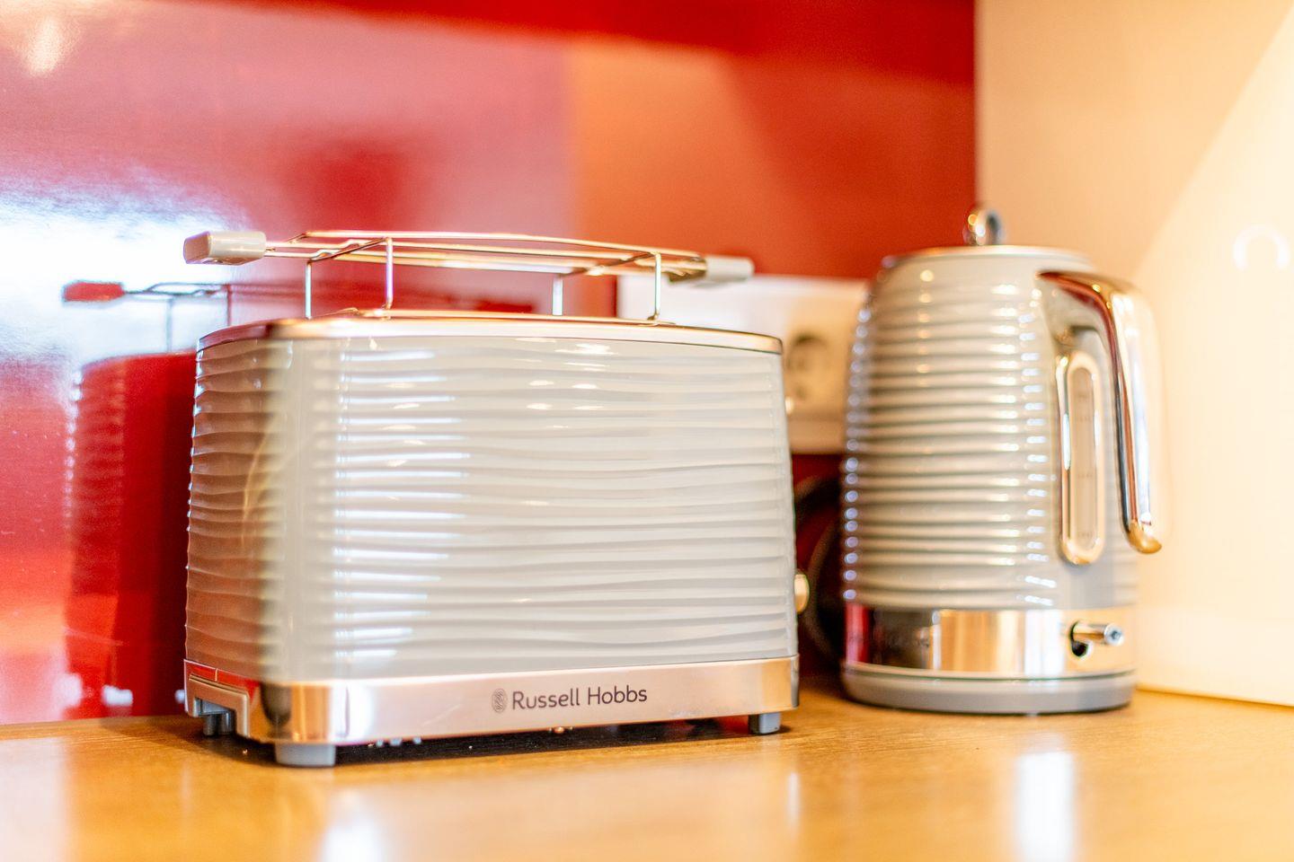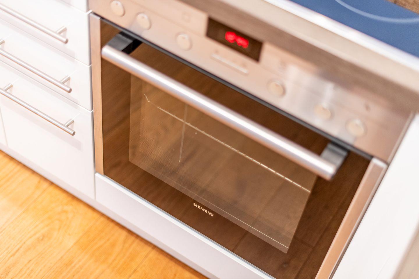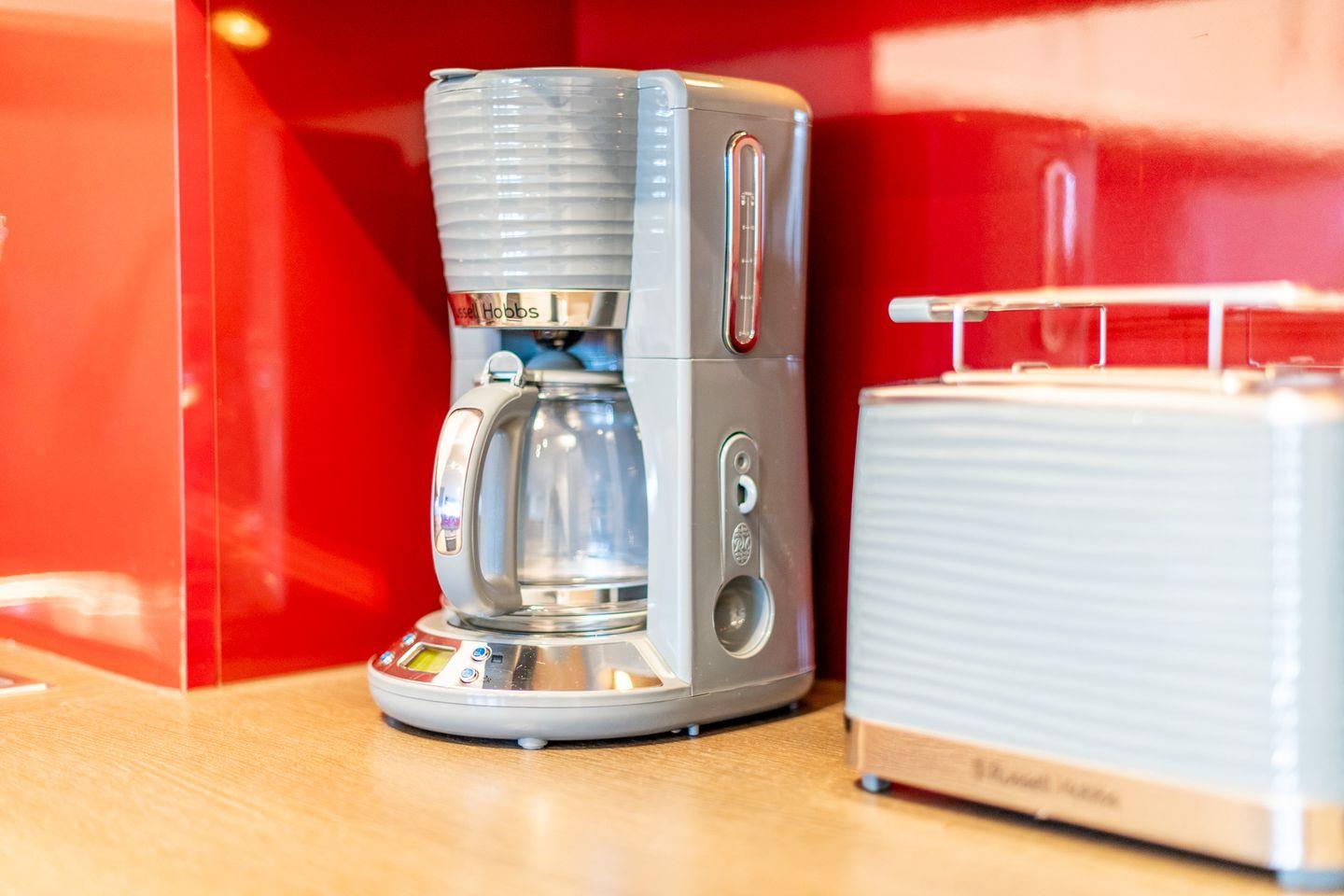 Die helle, offen gestaltete Küche ist modern ausgestattet und bietet alles, was Sie für eine gelungene Mahlzeit benötigen, inklusive einer Filterkaffeemaschine und Espressomaschine. Der angrenzende große Esstisch ist ideal für gemeinsame Mahlzeiten und gesellige Stunden.