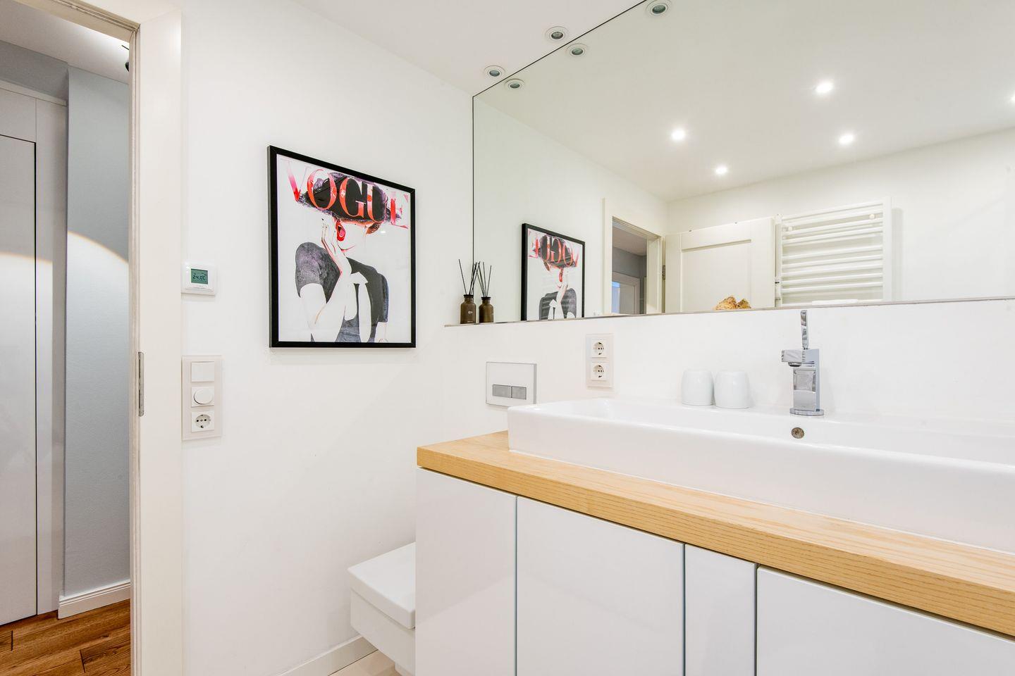 Im lichtdurchfluteten Wohnzimmer erwartet Sie ein gemütliches Sofa, das auch als Schlafmöglichkeit dient, sowie ein moderner Smart-TV für entspannte Abende. Von hier aus gelangen Sie direkt auf den möblierten Balkon, der besonders am Morgen ein idealer Ort für ein Frühstück im Sonnenschein ist.