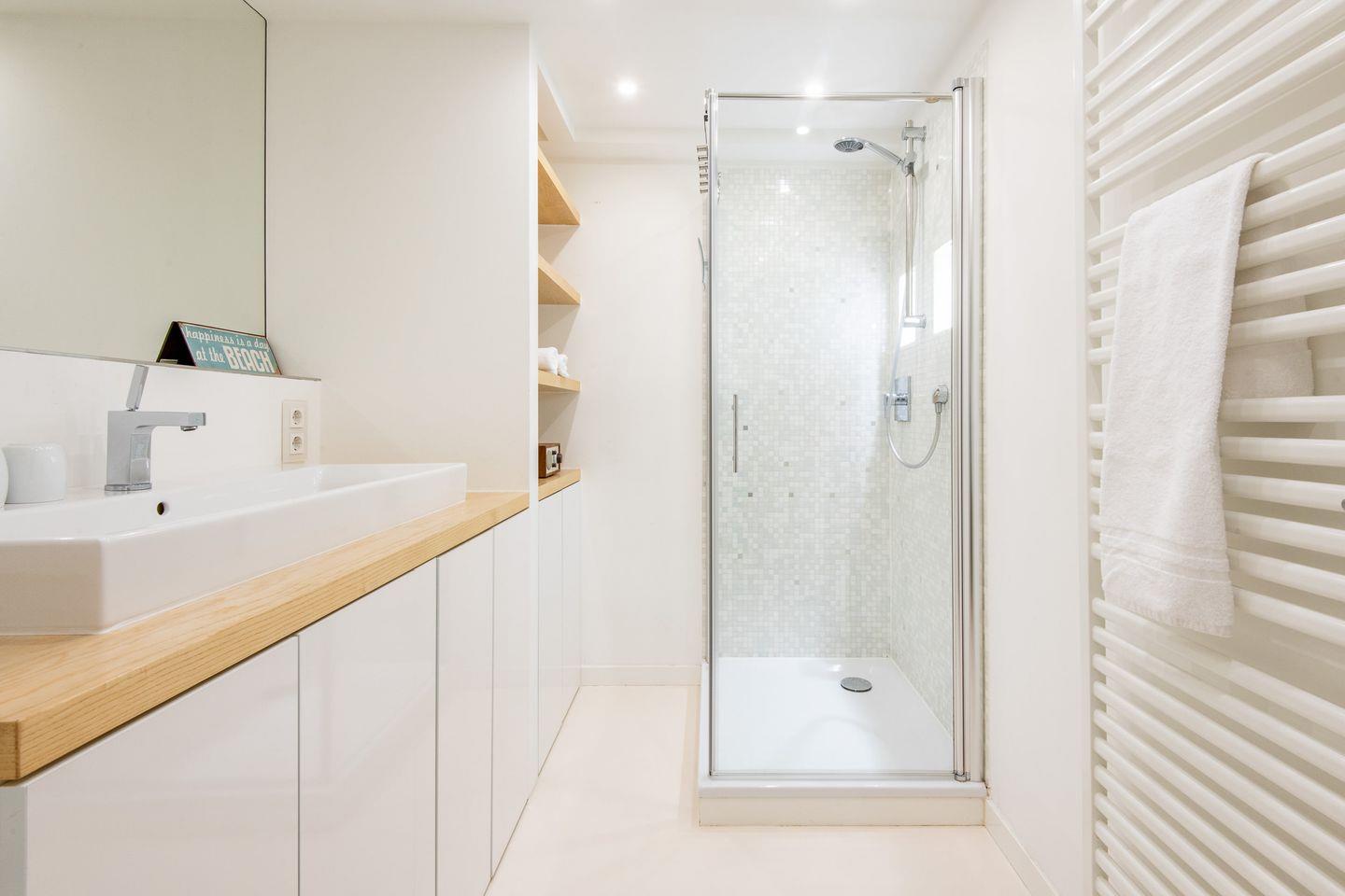 Das helle Badezimmer verfügt über eine Dusche, WC und einen Handtuchwärmer und bietet Ihnen nach einem erlebnisreichen Tag auf der Insel den Komfort, den Sie sich wünschen.