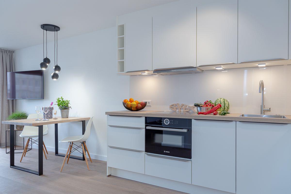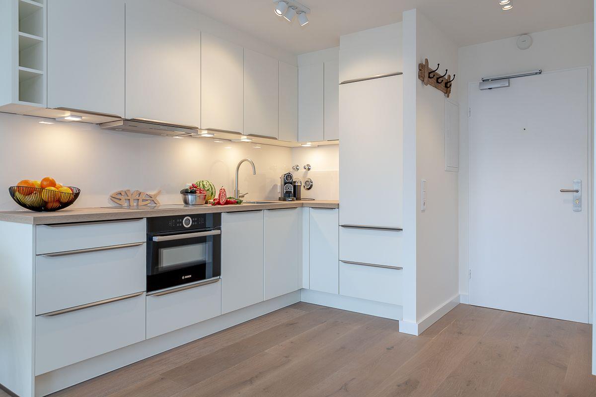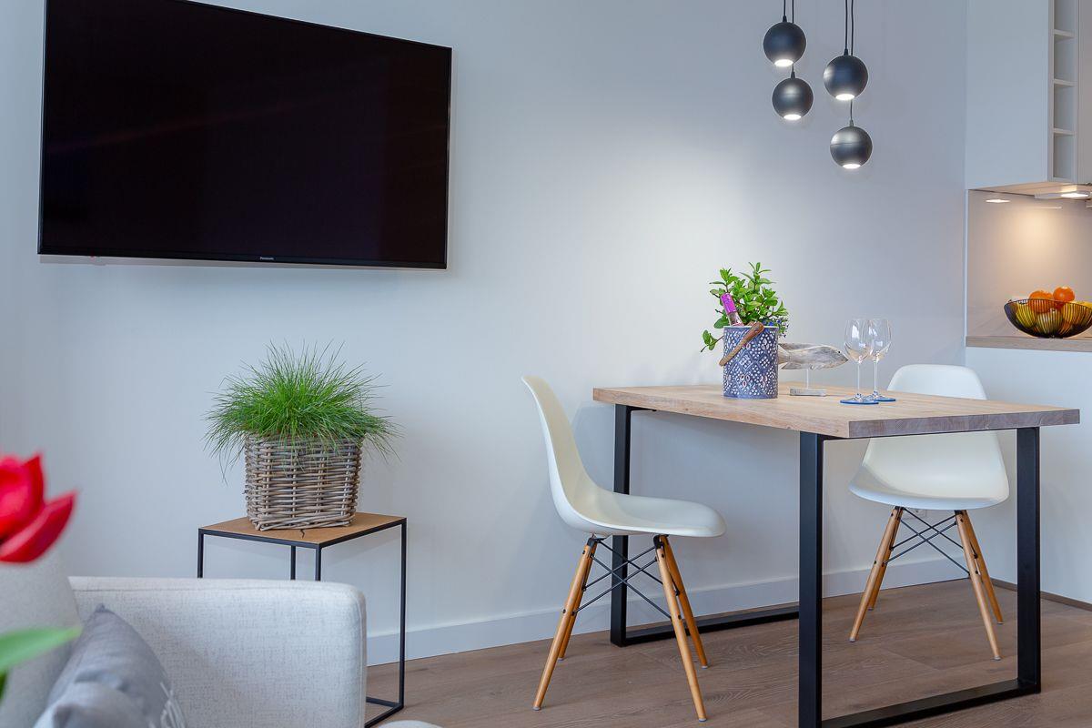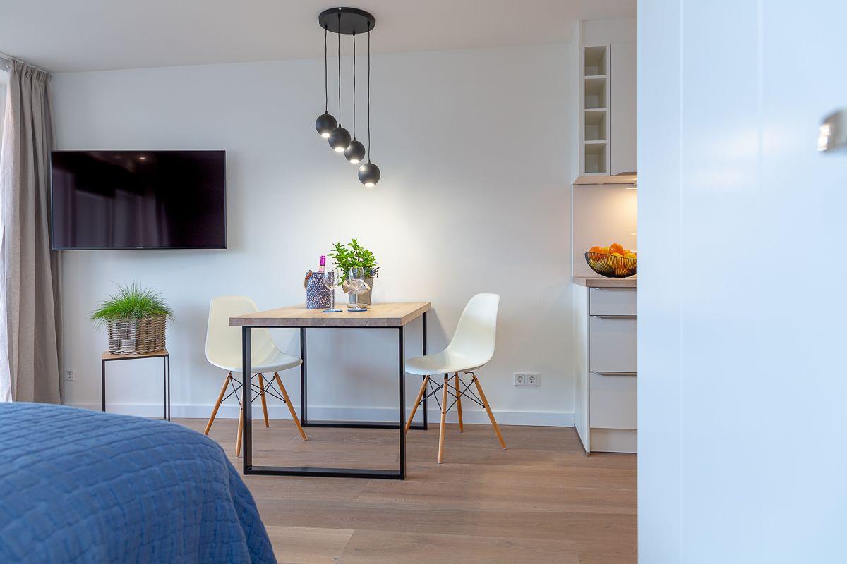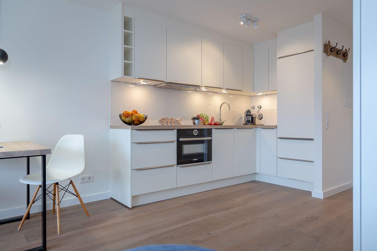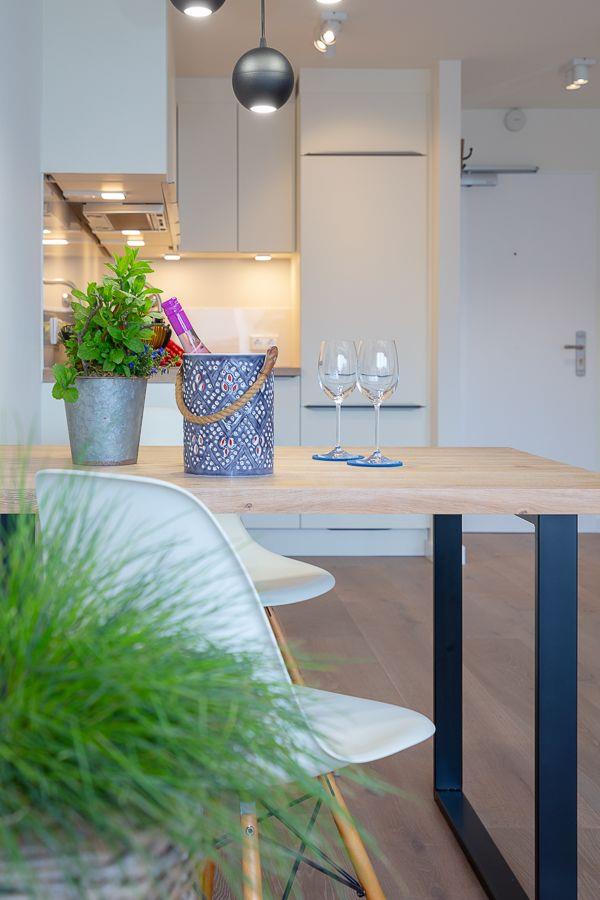 Der Esstisch bietet Ihnen zusätzlich einen angenehmen Platz zum Verweilen, die offene und sehr moderne Küchenzeile fügt sich perfekt in den Wohnraum ein und bietet Ihnen, neben einer Nespresso Maschine, alles, was Sie für die Selbstversorgung im Urlaub benötigen.