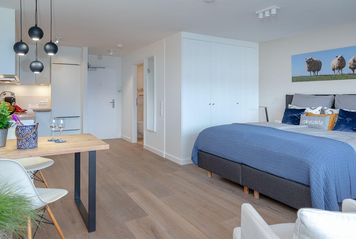 Wir freuen uns, Sie in unserem neuen Domizil Meeresbrise62 willkommen heißen zu dürfen. In diesem eleganten Appartement finden zwei Personen in bester Lage einen charmanten und gleichzeitig exklusiven Ort, um ihren Traumurlaub genießen zu können. Das Stadt-Appartement befindet sich in der 2. Etage, die über einen großzügigen Flur und einen Fahrstuhl mühelos zu erreichen ist. Waschmaschine & Trockner (gemeinschaftlich). Das helle Ambiente wird durch die gelungene Inszenierung von hochwertigem Mobiliar und farblich abgestimmten Accessoires zusätzlich unterstützt. Der Naturholz - Boden und die extra angefertigten Einbauten runden dieses Bild stimmig ab.
