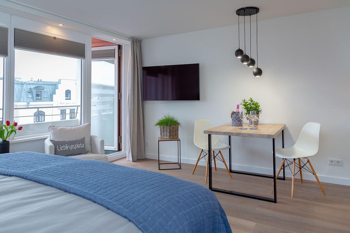 Modernes, allergikerfreundliches Appartement (38?m²) für bis zu 2 Personen – strand- und zentrumsnah gelegen. Heller Wohn- und Schlafbereich, Balkon mit Sitzmöglichkeiten, WLAN, Aufzug, Badezimmer mit Dusche. Waschmaschine & Trockner im Gemeinschaftskeller. Ideal für entspannte Tage in bester Lage!