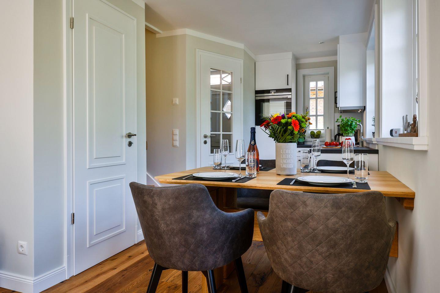 Der lichtdurchflutete Wohnbereich ist modern und gemütlich eingerichtet. Ein komfortables Sofa lädt zum Entspannen ein, während der großzügige Essbereich Raum für gemeinsame Mahlzeiten bietet. Der Zugang zur Terrasse und zum kleinen Gartenbereich nach Süden eröffnet die Möglichkeit, sonnige Stunden im Freien zu genießen.