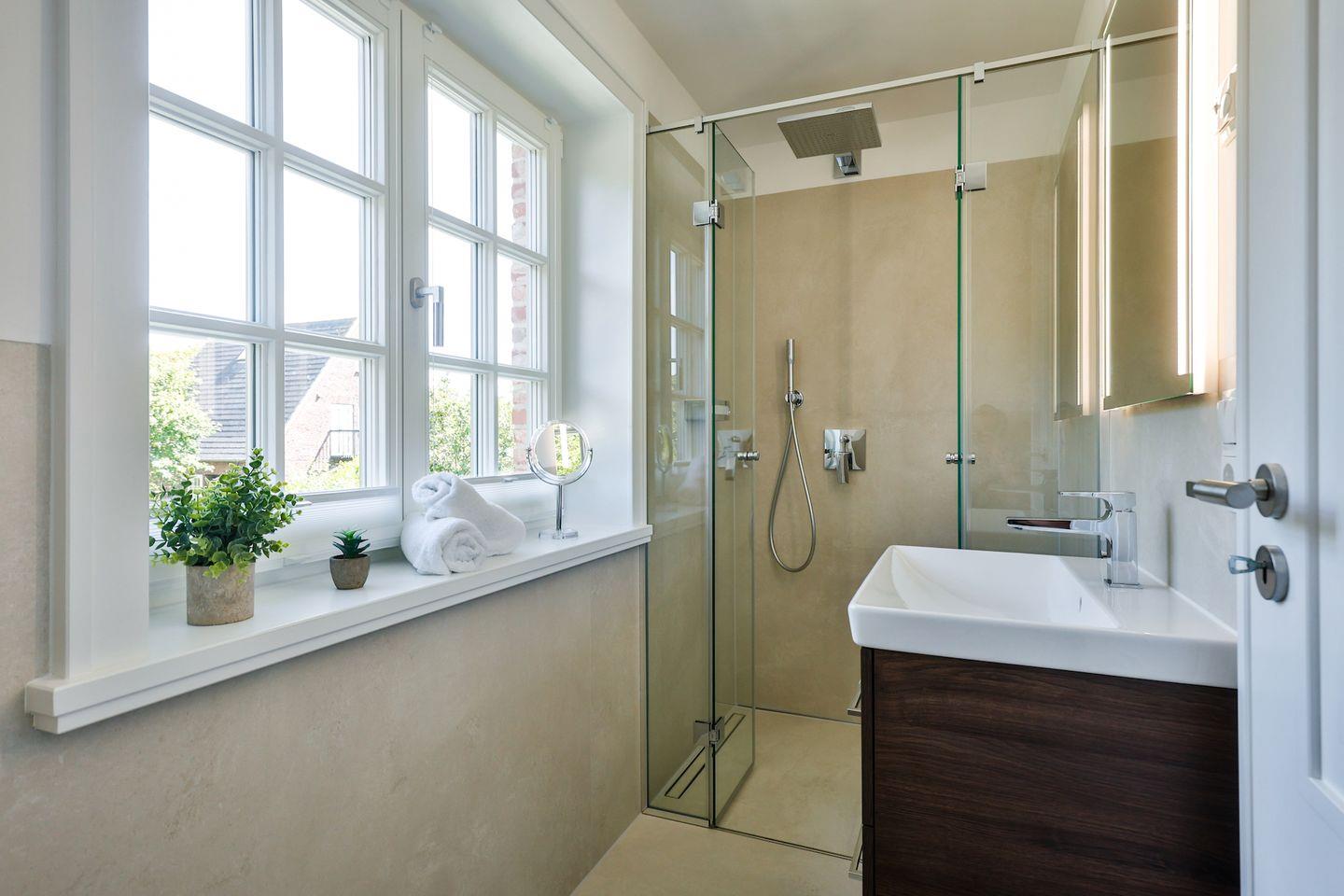 Das moderne Hauptbadezimmer ist als Duschbad ausgestattet und verfügt über WC, Föhn und Handtuchwärmer. Zusätzlich steht Ihnen ein separates Gäste-WC zur Verfügung, was den Komfort besonders erhöht.
