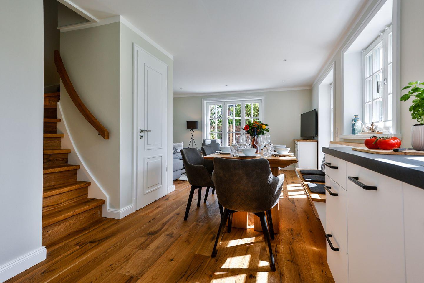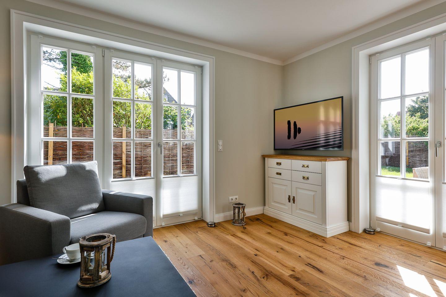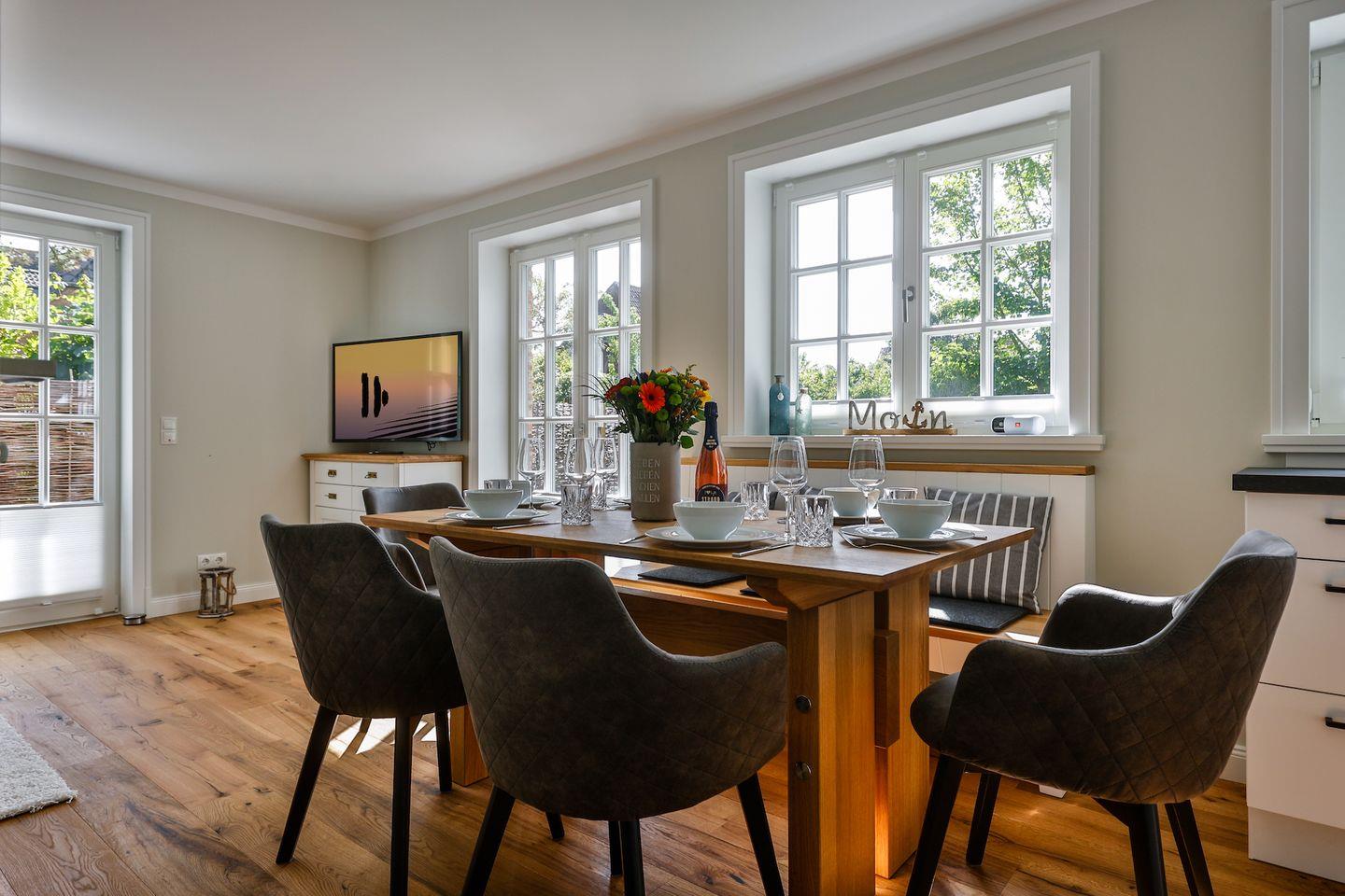 Das lichtdurchflutete Wohnzimmer lädt mit einem modernen Sofa und TV zu erholsamen Stunden ein. Der Essbereich bietet ausreichend Platz für gesellige Abende. Von hier aus gelangen Sie auf die großzügige Südwest-Terrasse, die mit gemütlichen Sitzmöglichkeiten ausgestattet ist und in einen schön begrünten Garten führt – ideal, um die Sonne und die frische Meeresluft zu genießen.