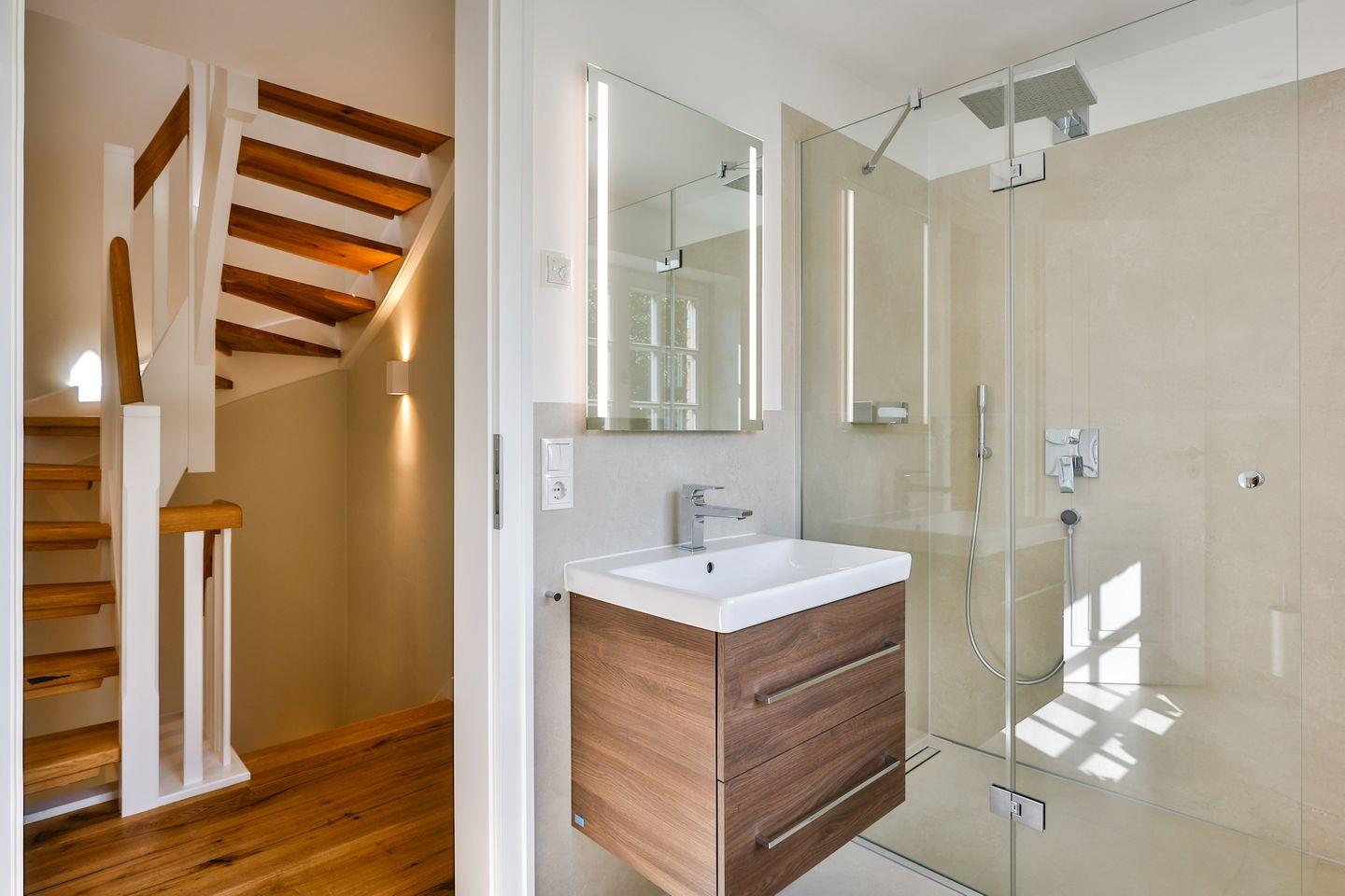 Das Hauptbadezimmer ist ein modernes Duschbad mit WC, Föhn und Handtuchwärmer. Ein zweites Badezimmer mit Dusche und WC sowie ein zusätzliches Gäste-WC erhöhen den Komfort und bieten Privatsphäre für alle Gäste.