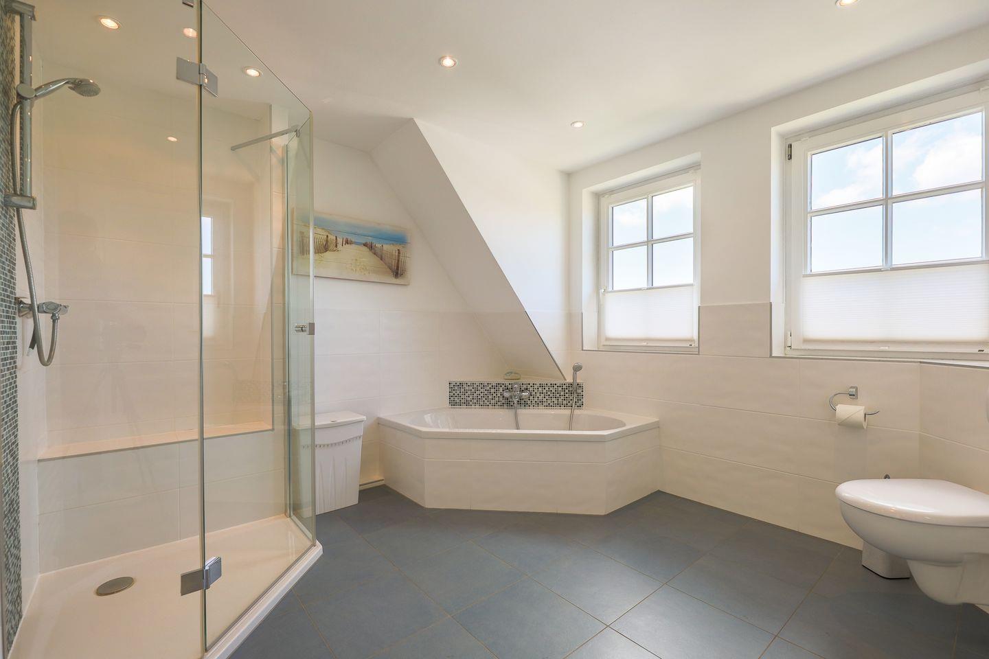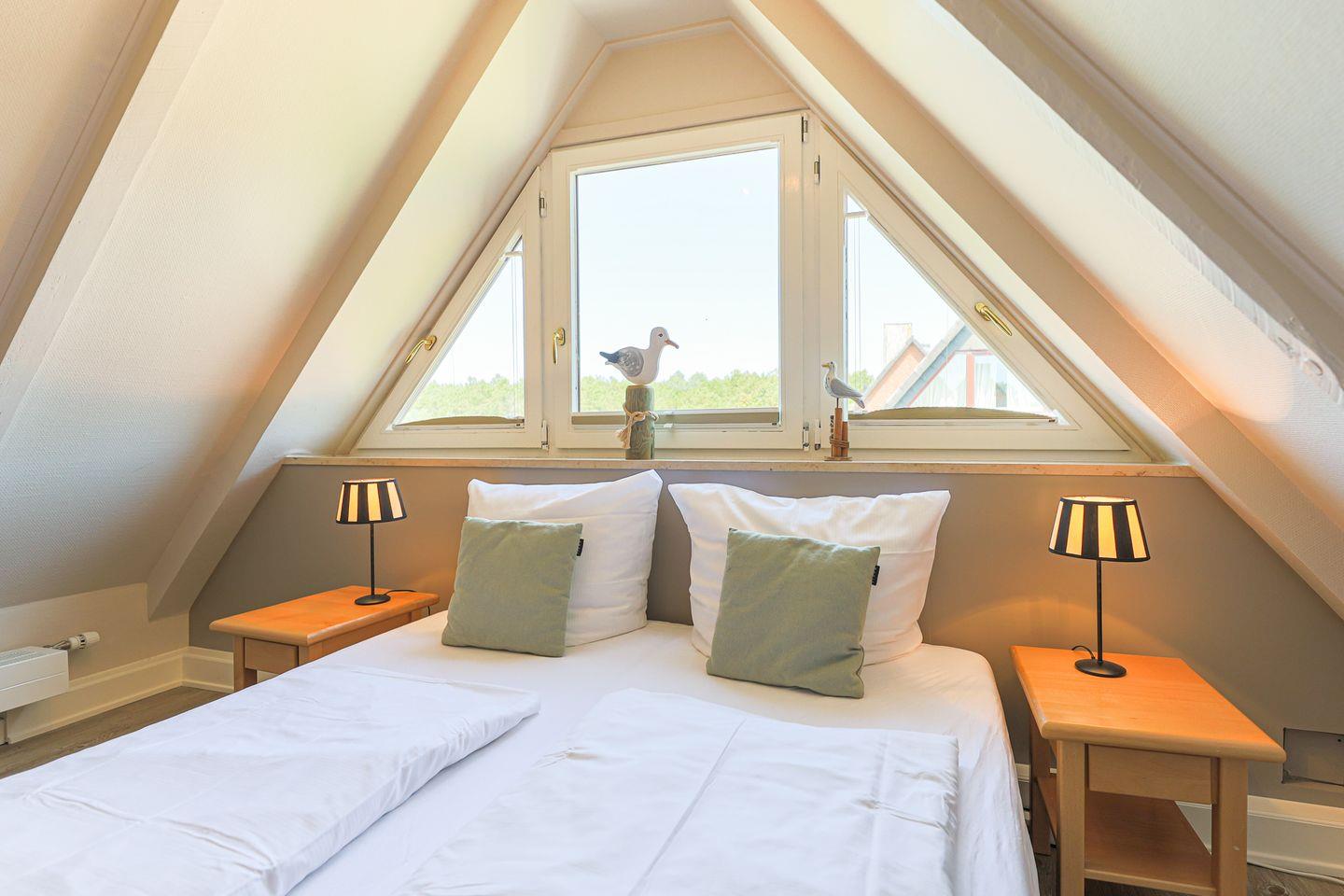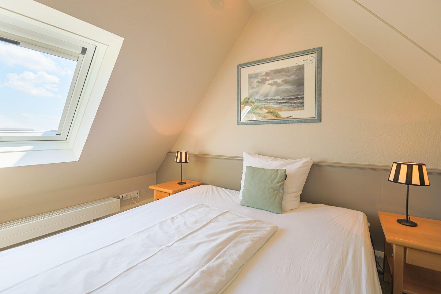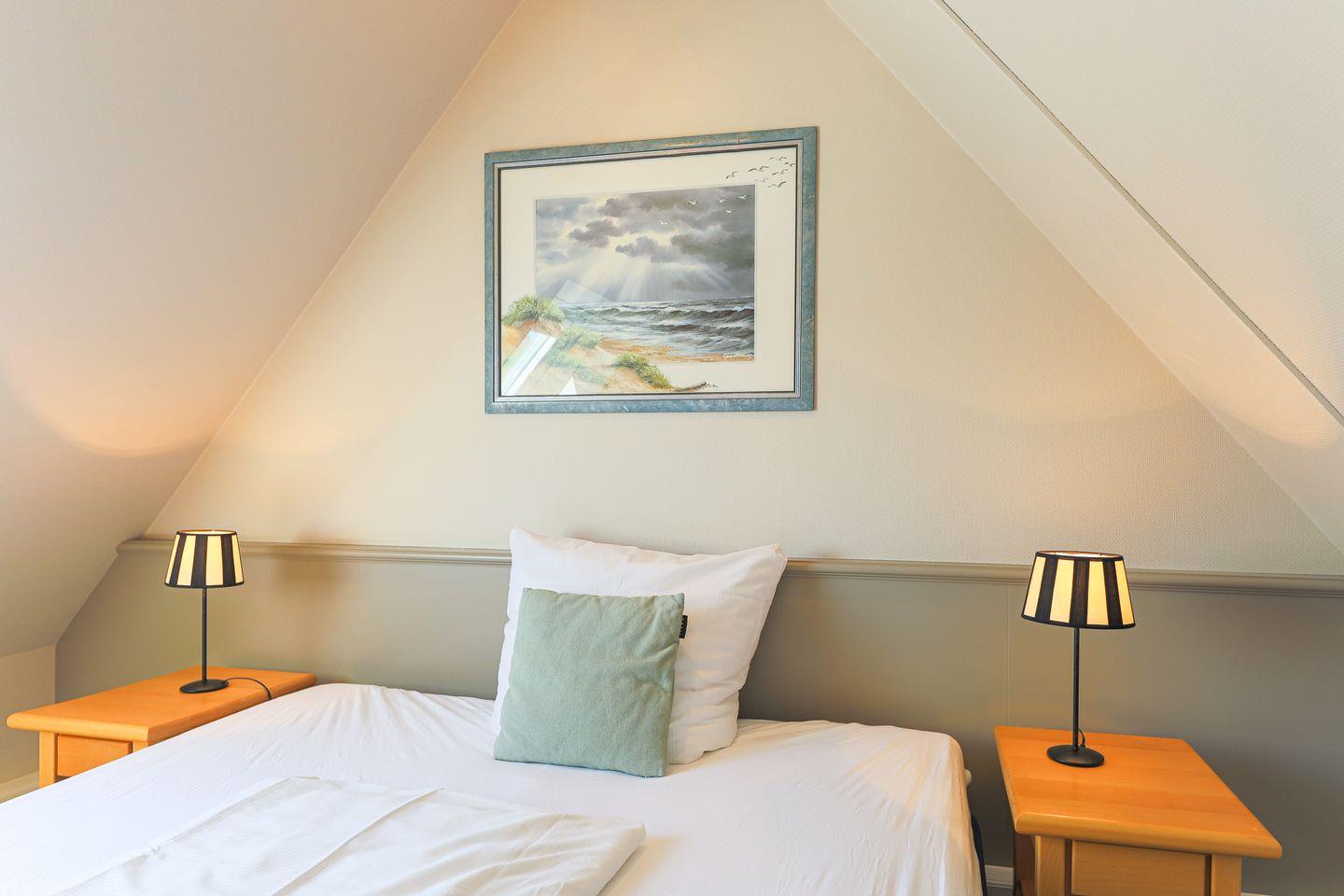 Von den insgesamt drei Schlafzimmern befindet sich eins auf Wohnebene, das über ein großes en Suite Bad mit Badewanne und Dusche verfügt. Im Dachgeschoss gibt es ein weiteres Doppelschlafzimmer sowie ein Schlafzimmer mit Einzelbett. In allen Schlafzimmern laden hochwertige Boxspringbetten zum wohligen Schlummern ein. Ein zweites Bad mit Dusche befindet sich ebenfalls auf Wohnebene.