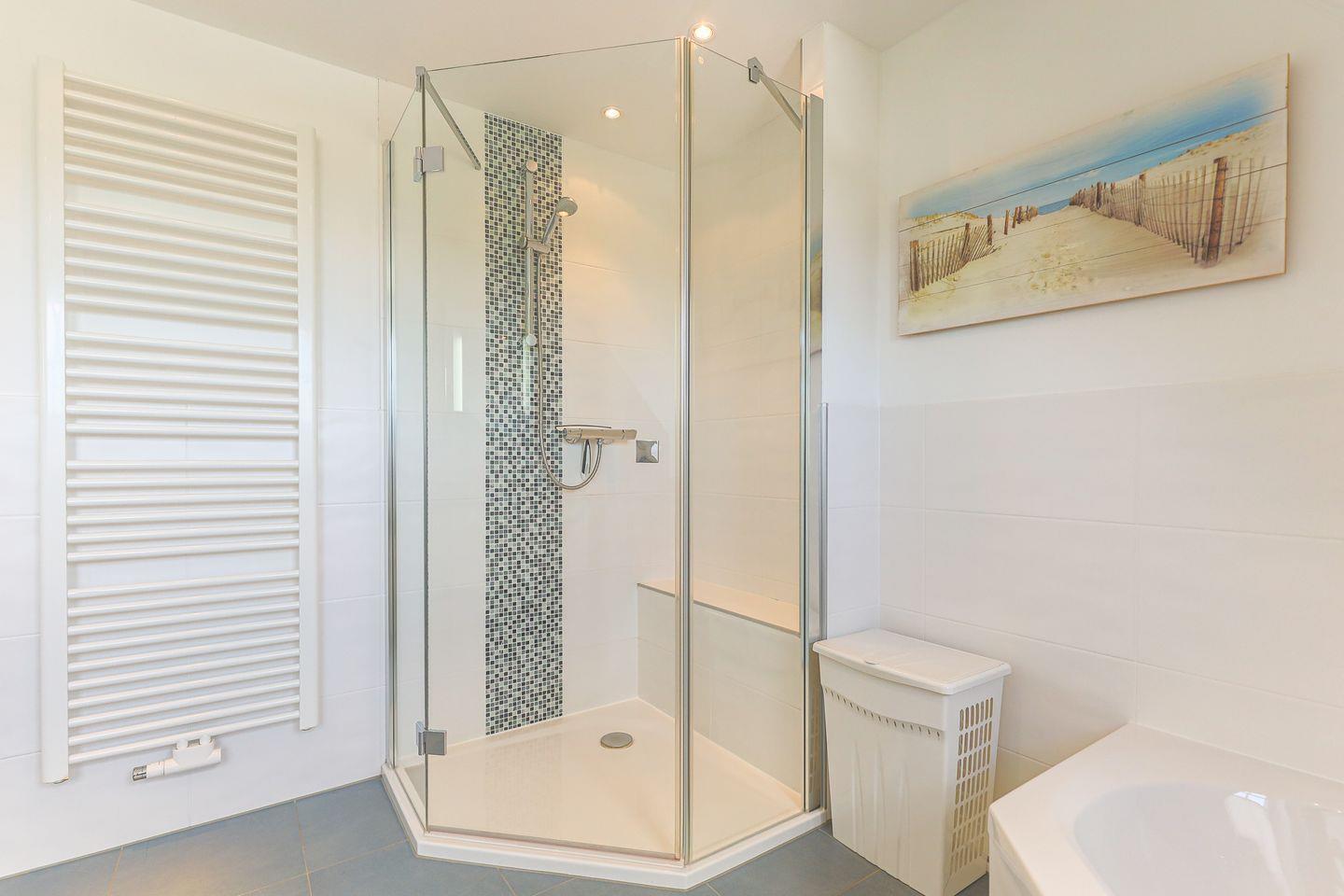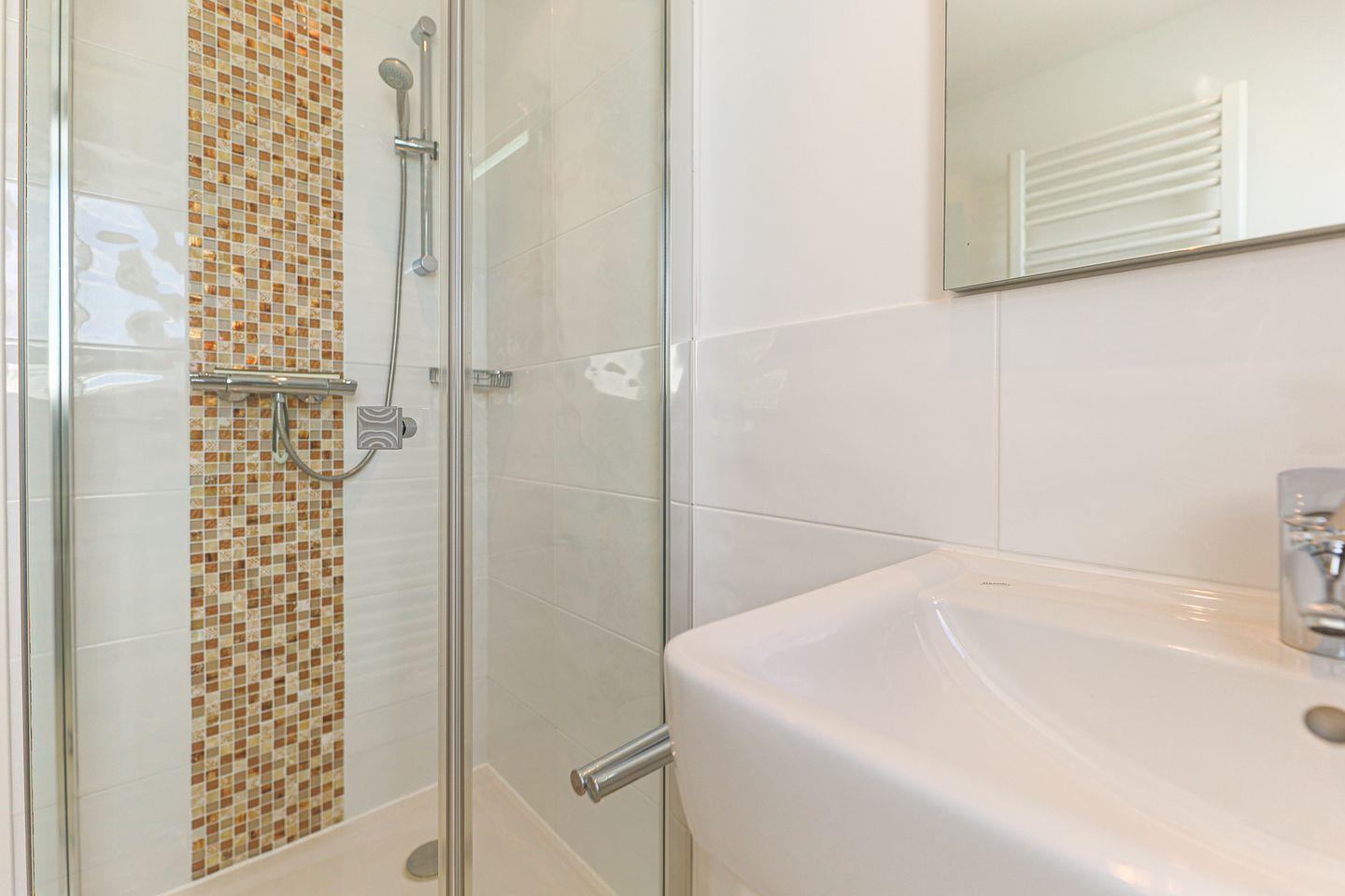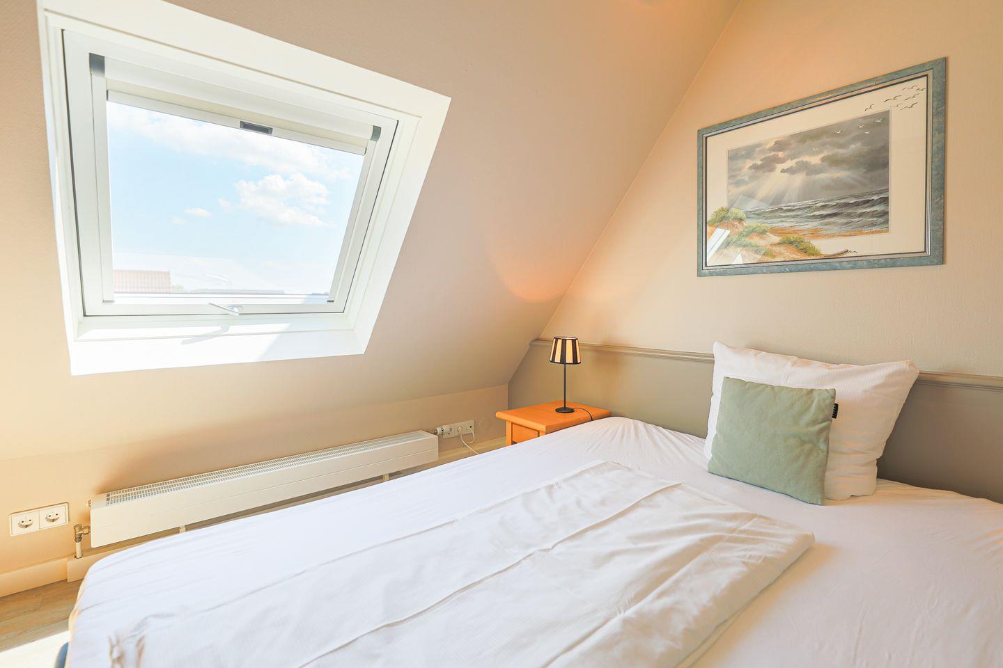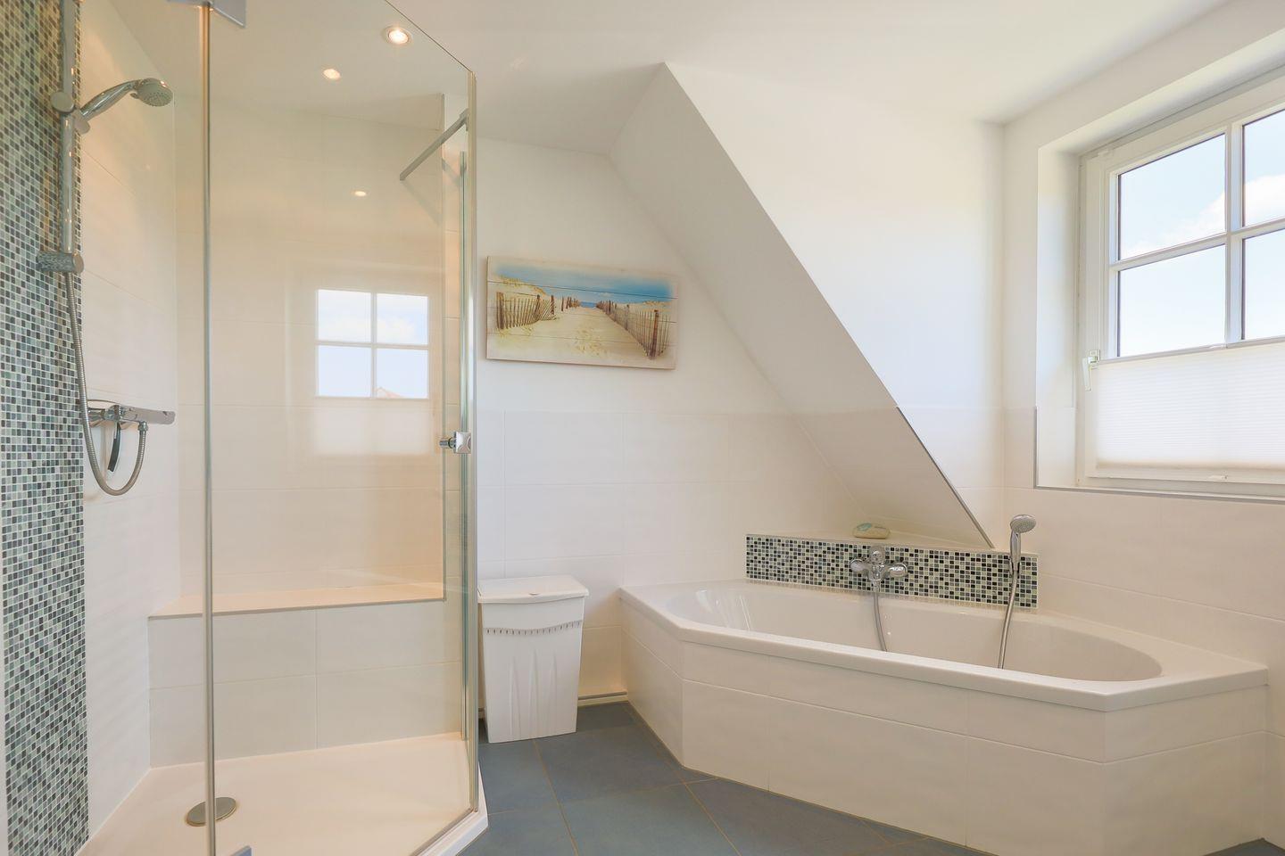 Von den insgesamt drei Schlafzimmern befindet sich eins auf Wohnebene, das über ein großes en Suite Bad mit Badewanne und Dusche verfügt. Im Dachgeschoss gibt es ein weiteres Doppelschlafzimmer sowie ein Schlafzimmer mit Einzelbett. In allen Schlafzimmern laden hochwertige Boxspringbetten zum wohligen Schlummern ein. Ein zweites Bad mit Dusche befindet sich ebenfalls auf Wohnebene.