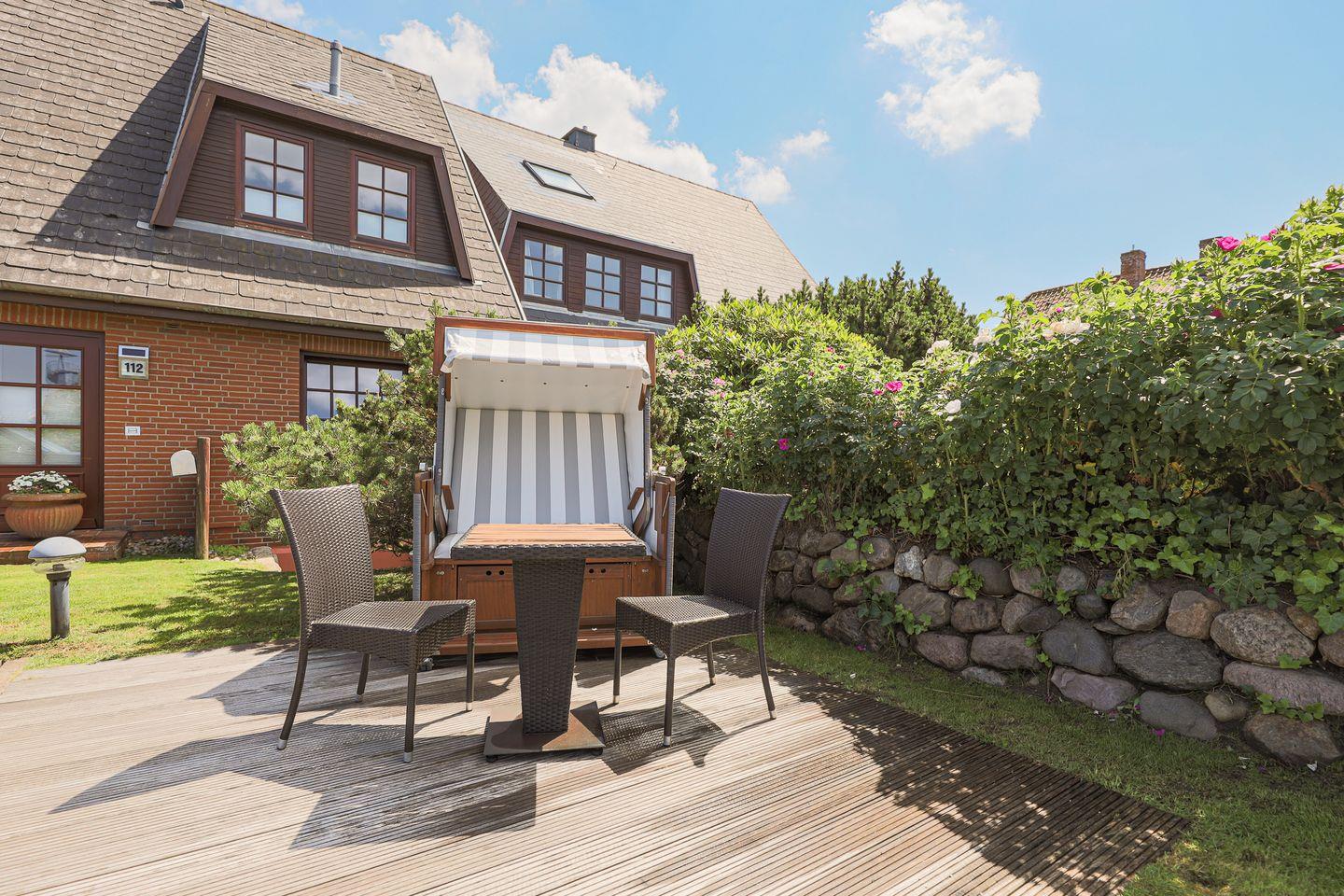 Zum Appartement Seestern gehört eine kleine Terrasse vor dem Haus mit Strandkorb für die Sonnenstunden.