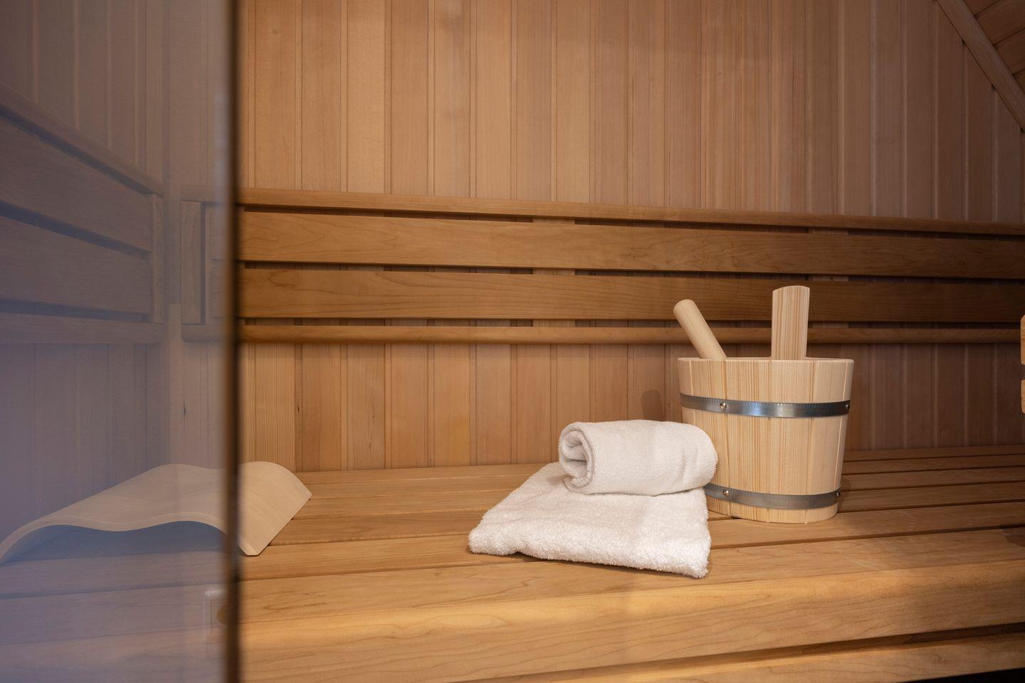 Das Hauptbadezimmer im Erdgeschoss ist ein besonderes Highlight mit einer ebenerdigen Dusche, WC, Handtuchwärmer, Föhn und Waschtrockner. Die private Sauna lädt zum Entspannen und Wohlfühlen ein.