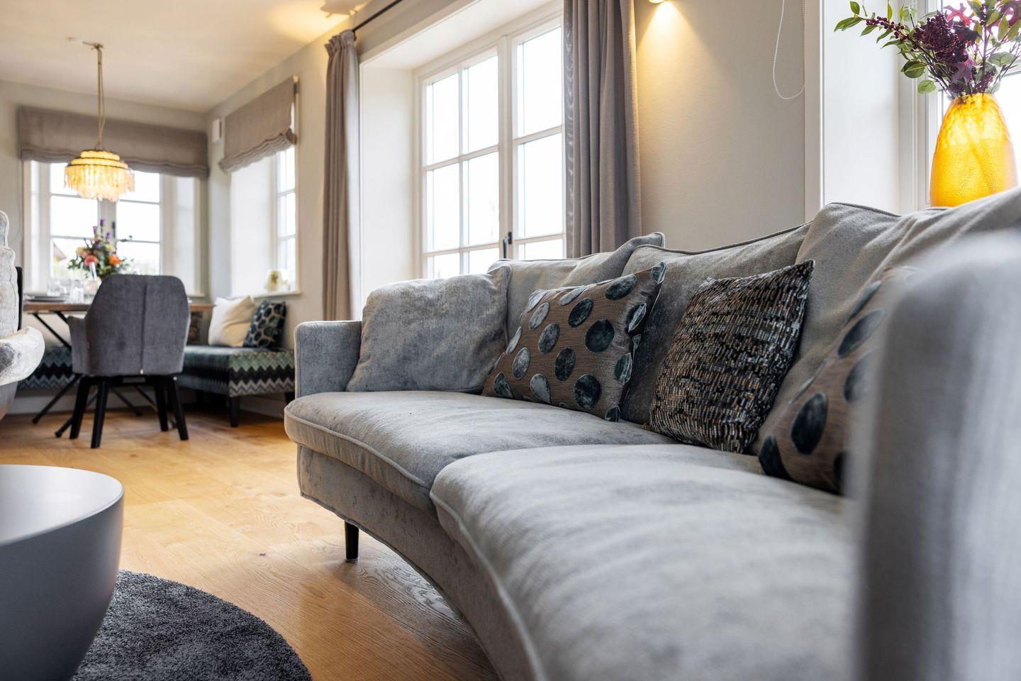 Der lichtdurchflutete Wohnbereich besticht durch seine moderne, hochwertige Einrichtung und den gemütlichen Gaskamin, der eine warme Atmosphäre schafft. Die komfortable Couch lädt zum Verweilen ein, während der großzügige Esstisch, direkt am Kamin, Platz für gesellige Mahlzeiten bietet. Vom Wohnzimmer aus gelangen Sie direkt in den schönen Garten mit zwei sonnigen Terrassen – ideal für entspannte Stunden im Freien.