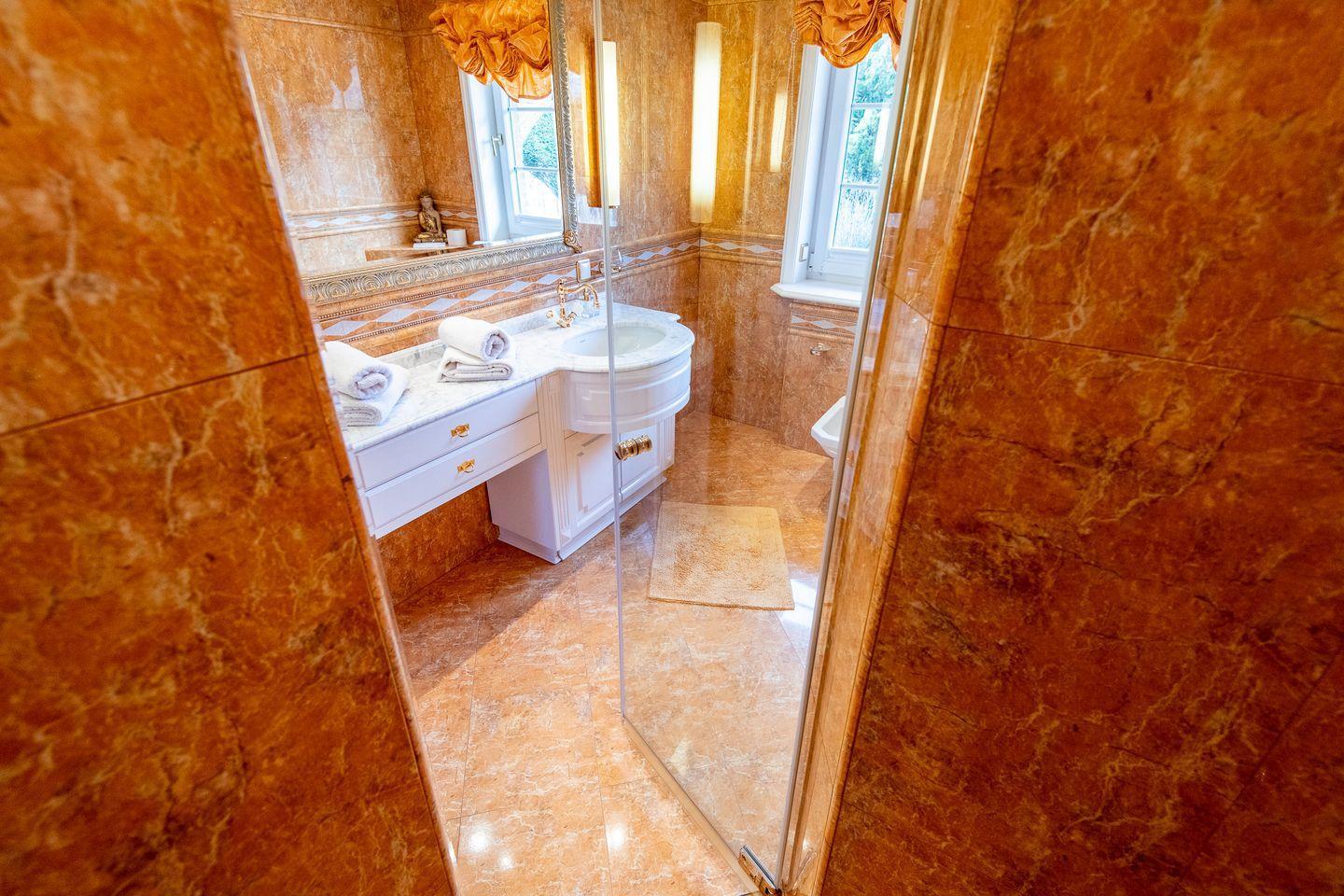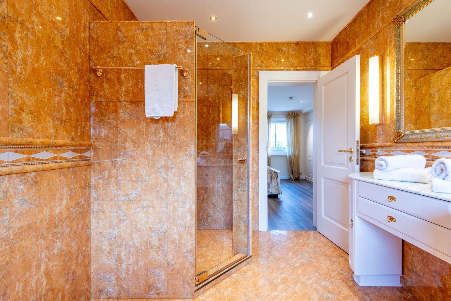 Das Hauptschlafzimmer ist mit einem gemütlichen Doppelbett (180x200 cm), einem TV und einem großzügigen Kleiderschrank ausgestattet und verfügt über einen direkten Zugang zum Badezimmer. Auch das zweite Schlafzimmer bietet ein Doppelbett (180x200 cm), TV, Kleiderschrank und ebenfalls einen eigenen Zugang zu einem modernen Badezimmer. Beide Badezimmer sind luxuriös gestaltet: Das erste Badezimmer verfügt über eine ebenerdige Dusche und ein Bidet, das zweite Badezimmer bietet eine großzügige Dusche.