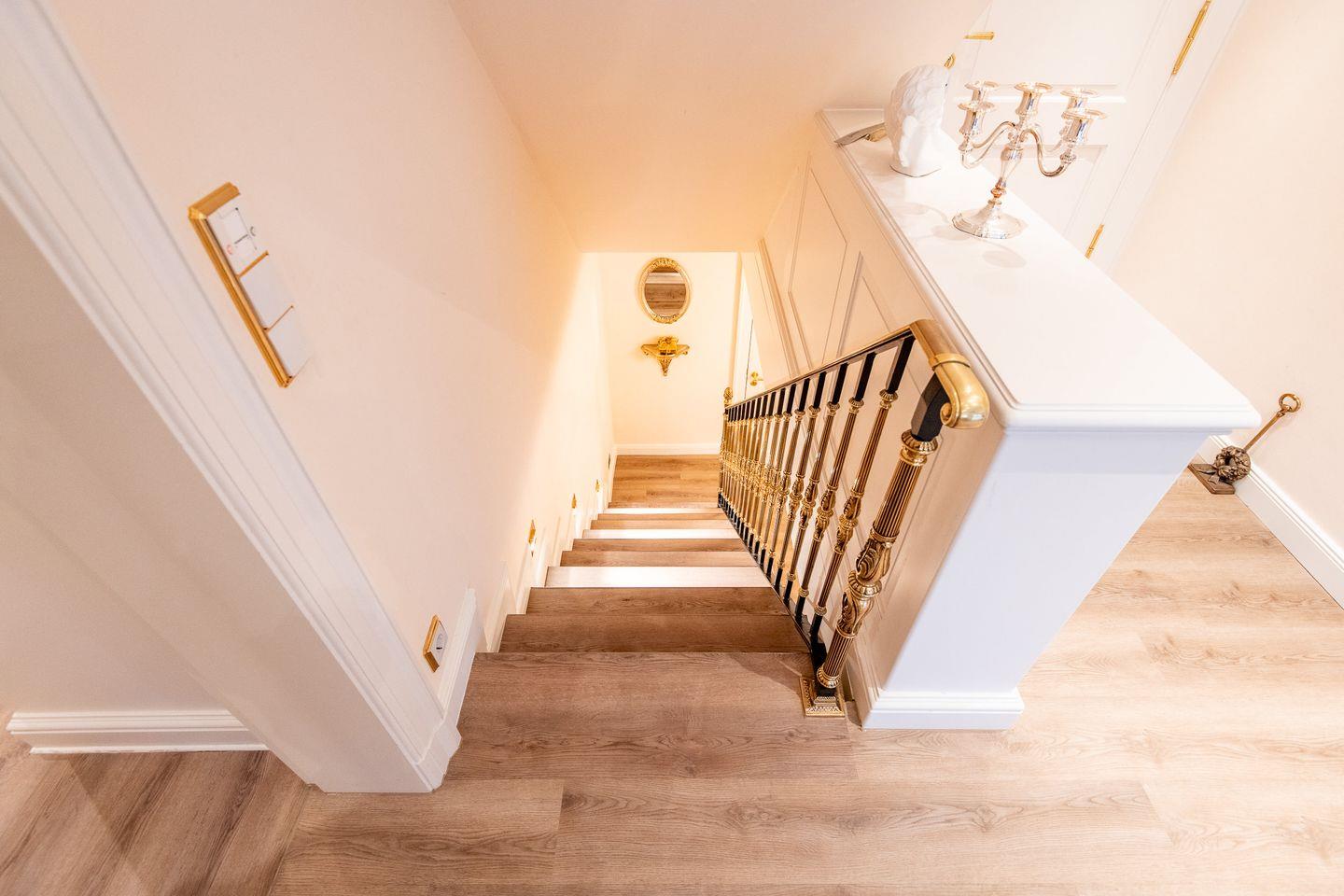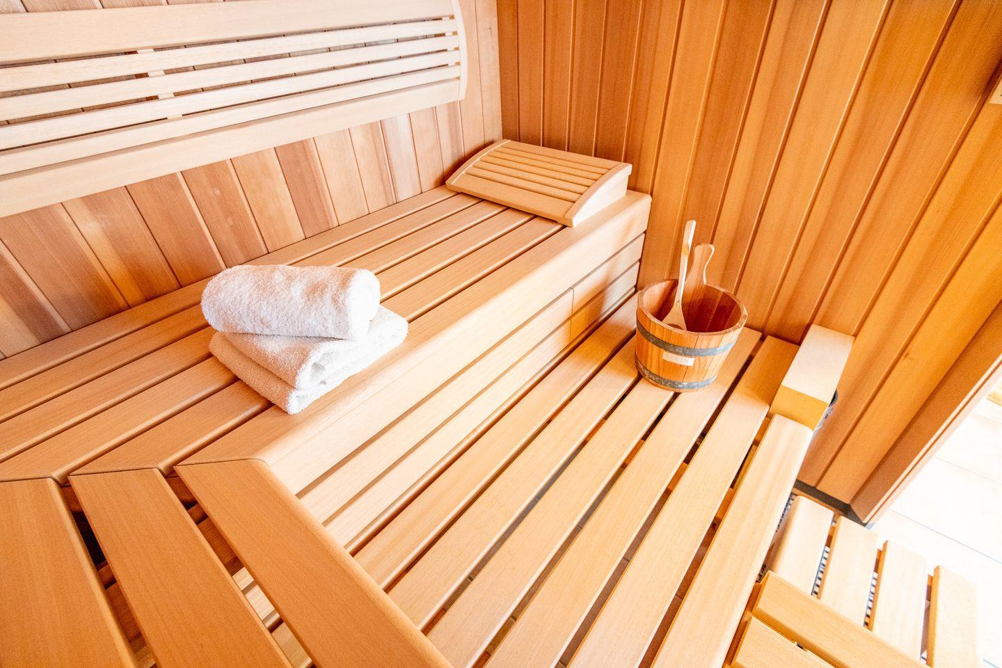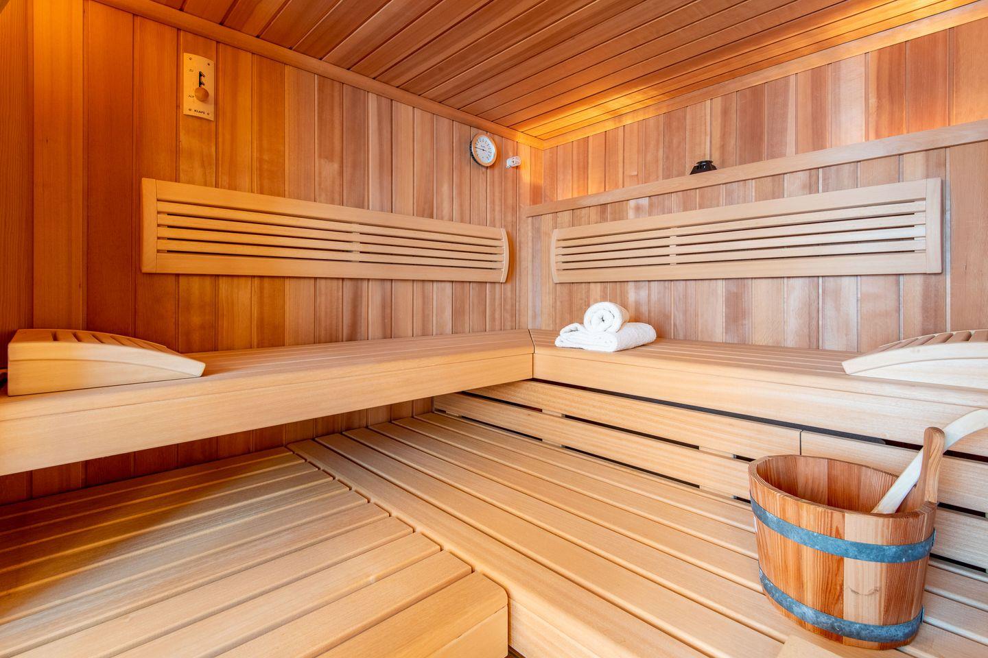 Im Untergeschoss lädt ein exklusiver Wellnessbereich mit Sauna zur Entspannung ein. Der Hauswirtschaftsraum mit Waschmaschine, Trockner und großem Weinschrank bietet zusätzliche Annehmlichkeiten für einen komfortablen Aufenthalt.