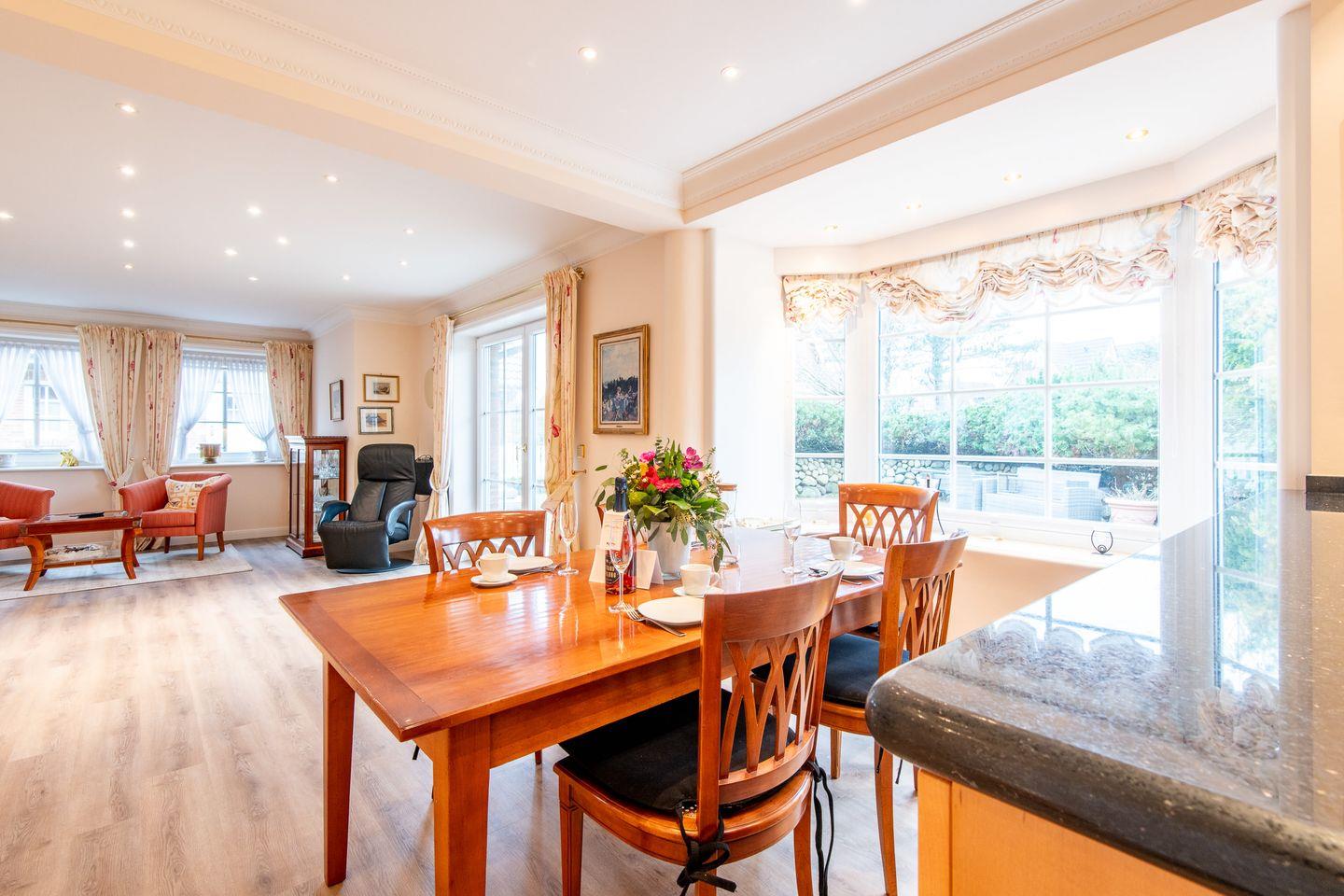 Das großzügige, lichtdurchflutete Wohnzimmer lädt mit einem komfortablen Schlafsofa und einem eleganten Mylin-Kamin zum Verweilen ein. Vom Wohnzimmer aus gelangen Sie direkt zur Westterrasse und in den gepflegten Garten. Hier erwarten Sie hochwertige Gartenmöbel, die zum entspannten Verweilen in der Nachmittagssonne einladen. Der angrenzende Essbereich ist stilvoll gestaltet und die offene Küche bietet alles, was Sie für eine komfortable Selbstverpflegung benötigen.