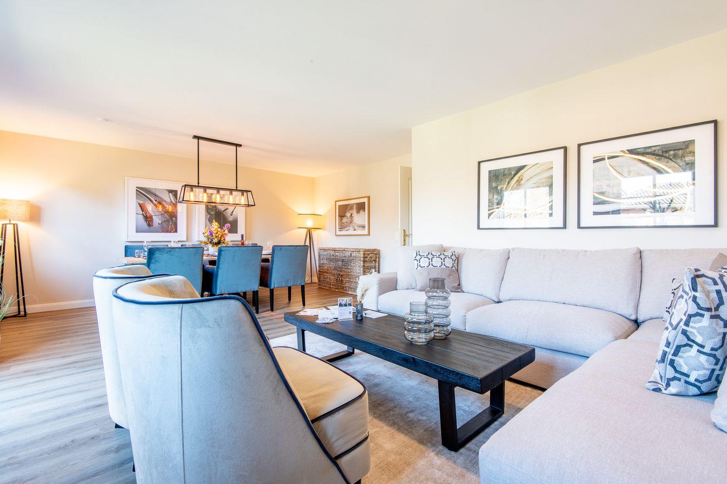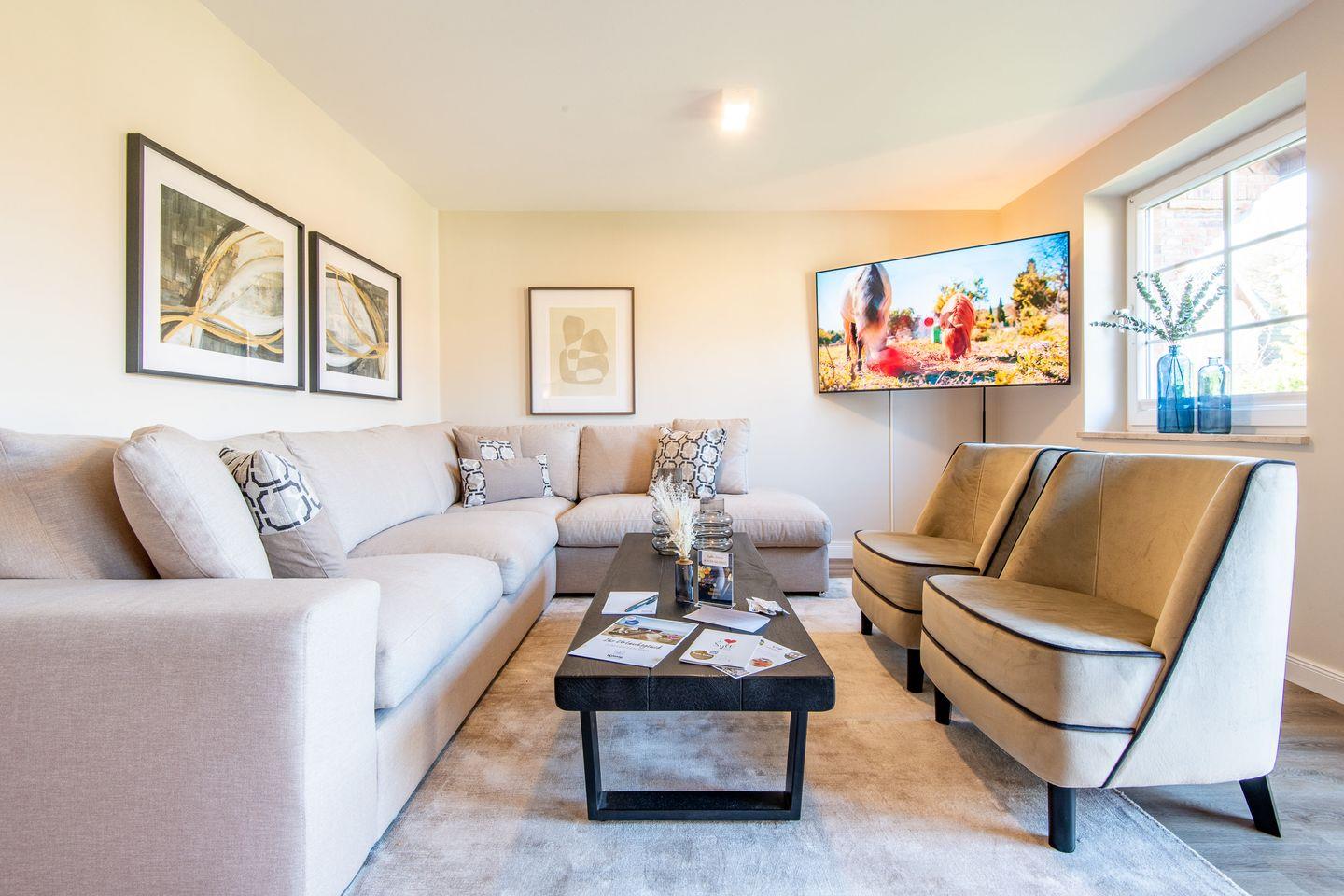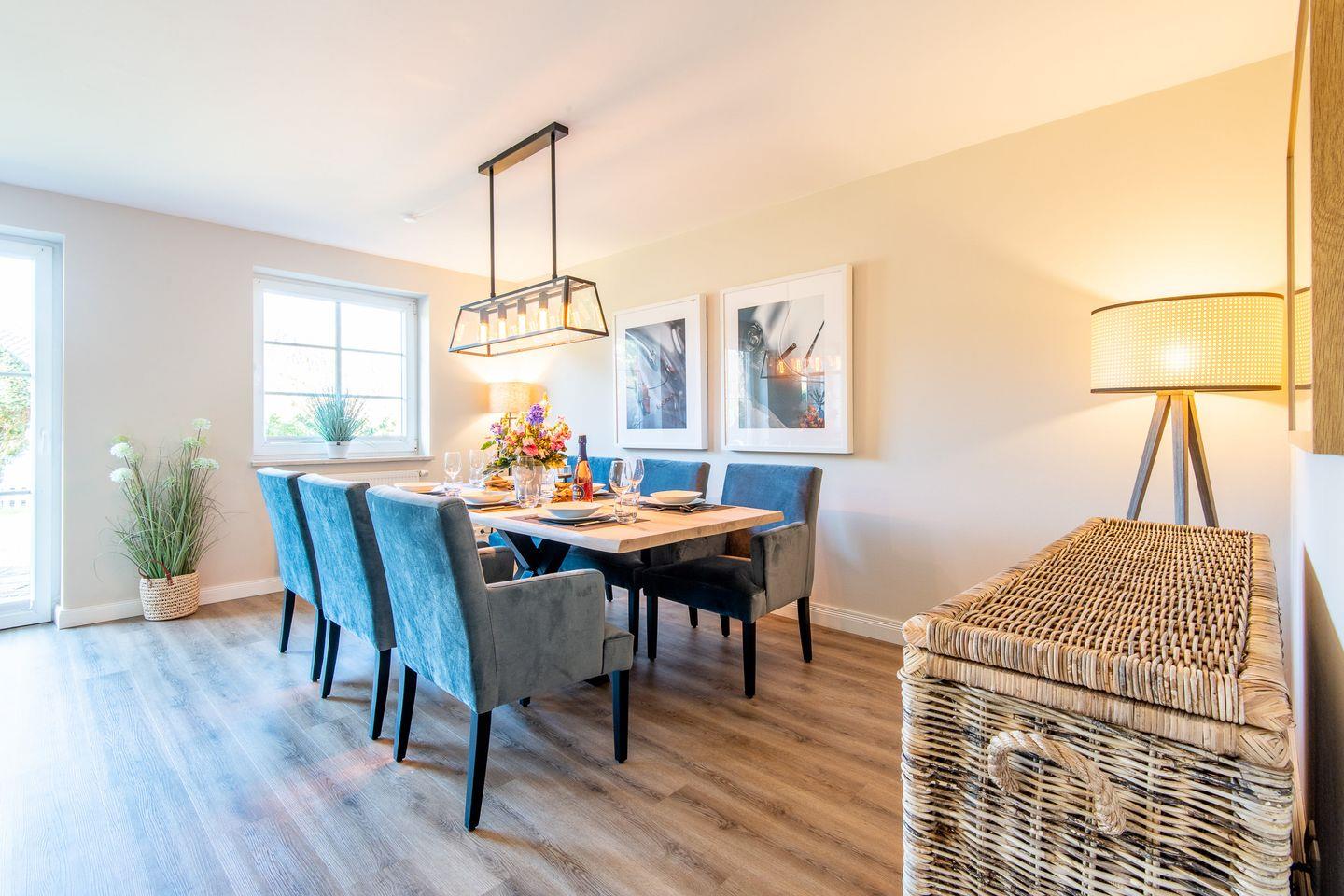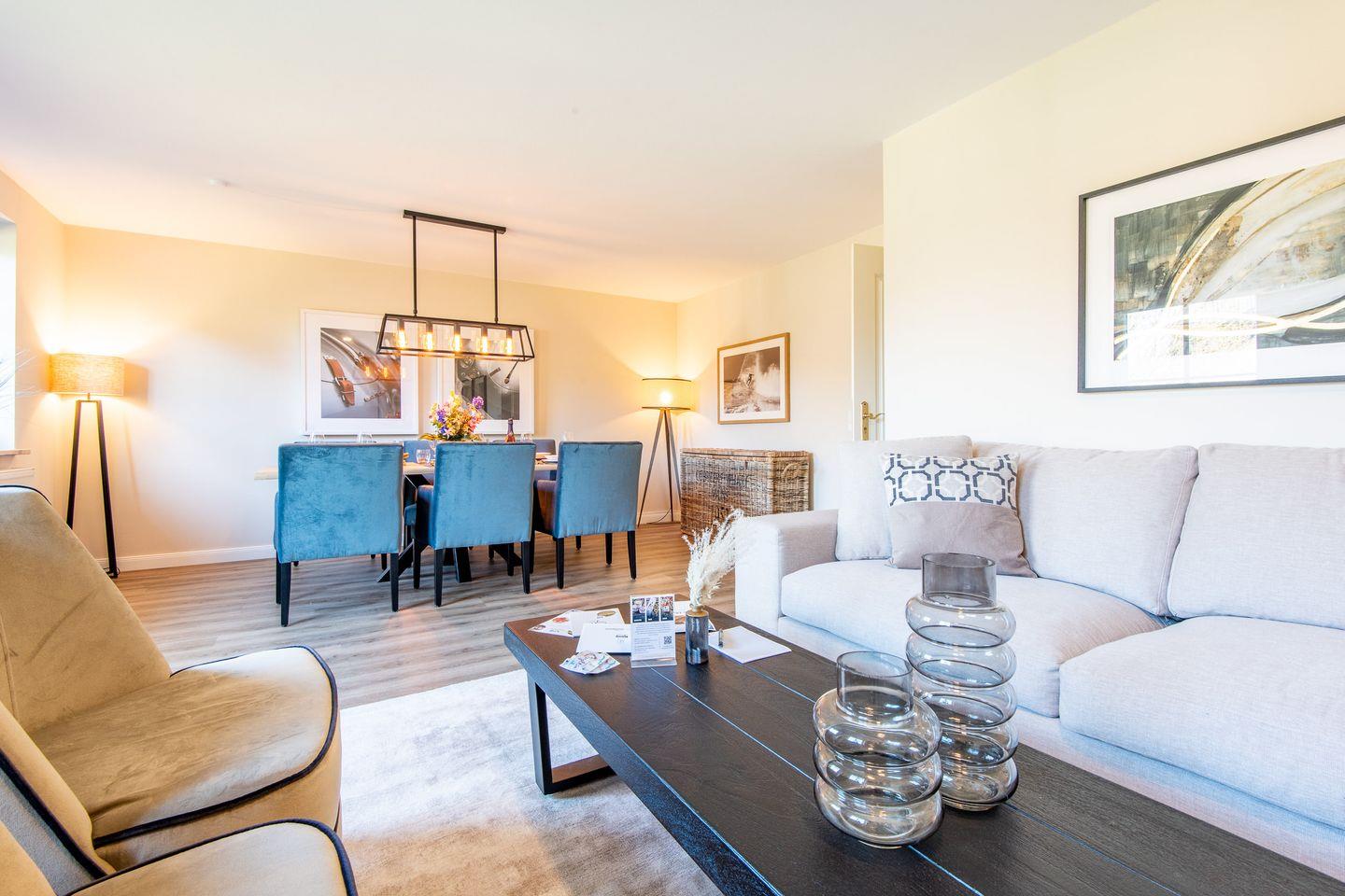 Das großzügige Wohnzimmer lädt mit einem bequemen Ecksofa und Smart TV zu erholsamen Stunden ein. Von hier aus haben Sie direkten Zugang zur möblierten Terrasse und zum gepflegten Garten, beide nach Westen ausgerichtet und ideal, um die Abendsonne zu genießen. Der offene Essbereich ist stilvoll gestaltet und bietet einen großen Esstisch für gesellige Abende und gemeinsame Mahlzeiten.