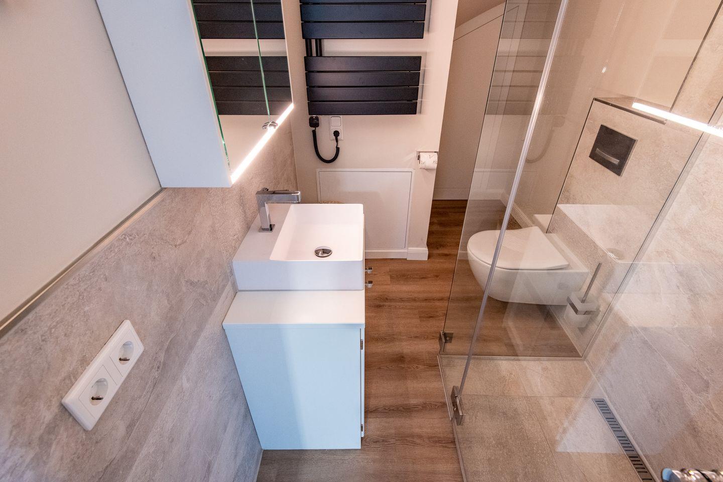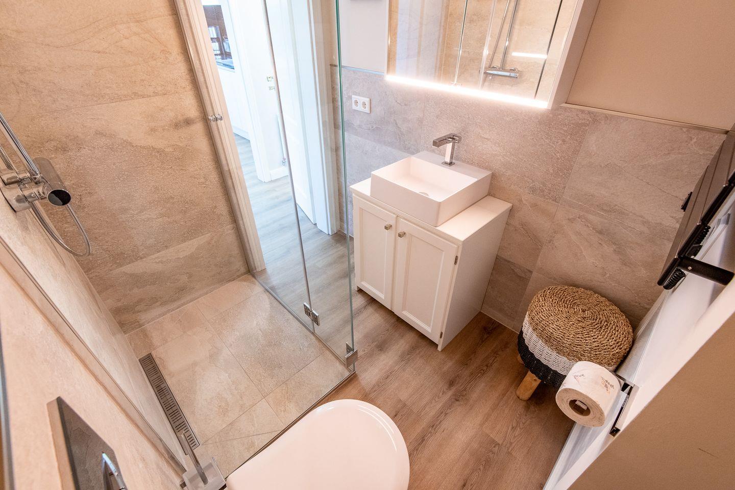 Es gibt zwei moderne Badezimmer: Das erste Badezimmer bietet eine ebenerdige Regendusche und WC, während das zweite Badezimmer ebenfalls eine ebenerdige Dusche und WC umfasst. Beide Badezimmer sind mit hochwertigen Materialien ausgestattet und bieten ein modernes Design für erfrischende Momente.