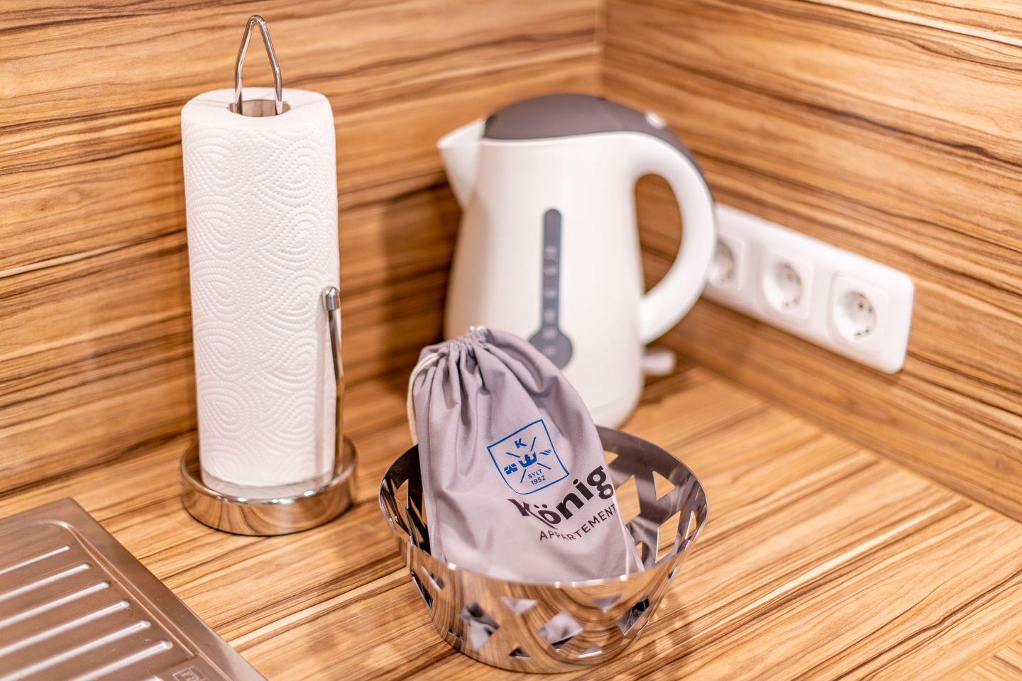 Die separate Küche ist voll ausgestattet mit einem Cerankochfeld, Filterkaffeemaschine, Nespresso-Maschine und weiteren Annehmlichkeiten – ideal für die Zubereitung kulinarischer Köstlichkeiten.