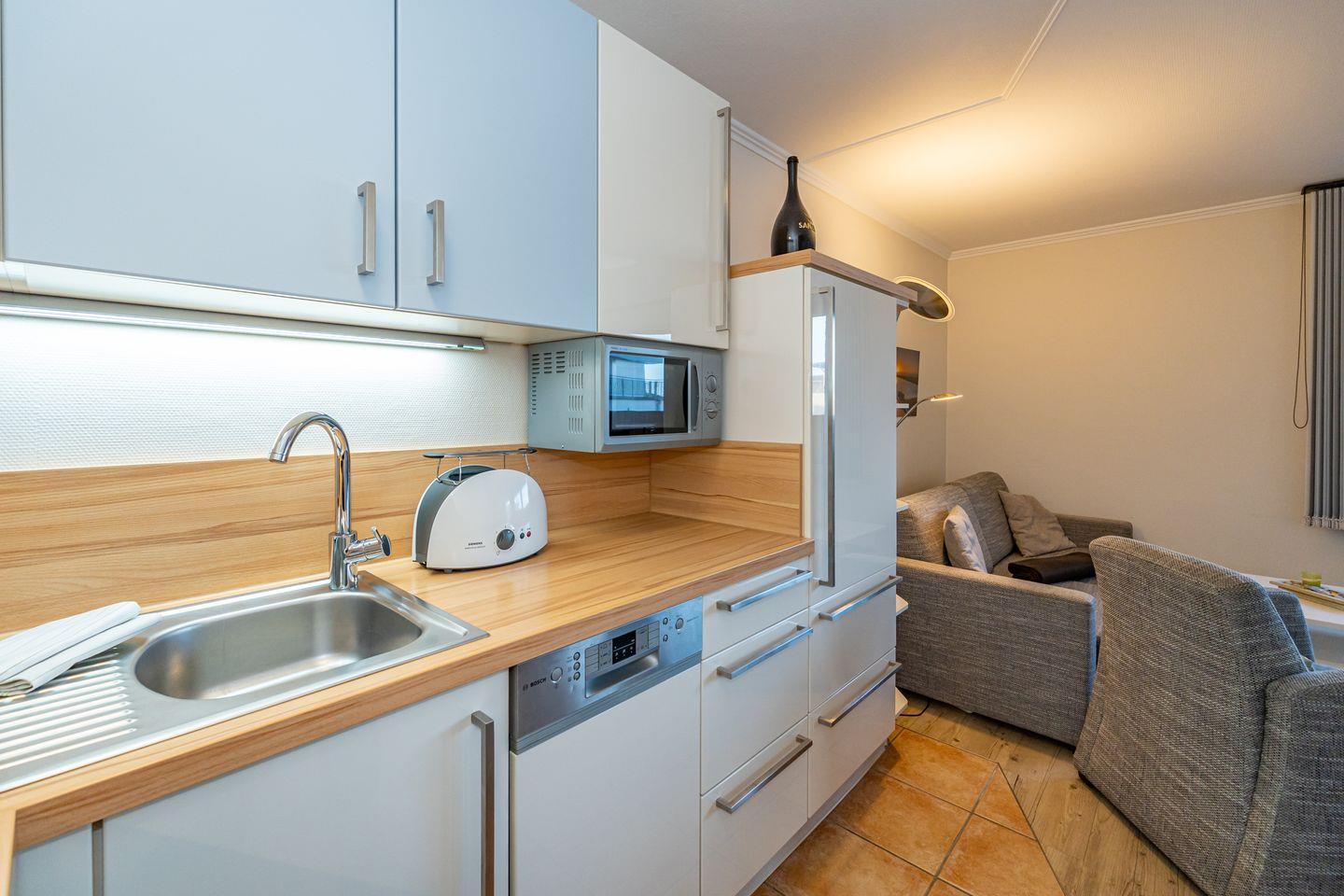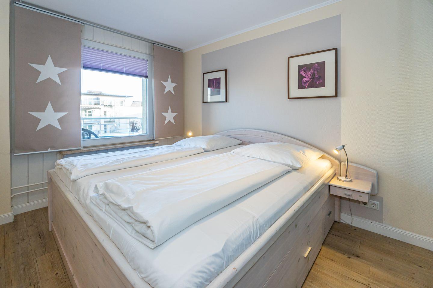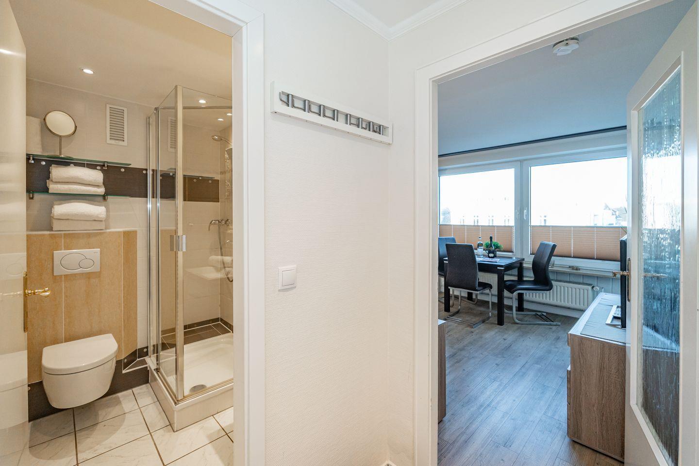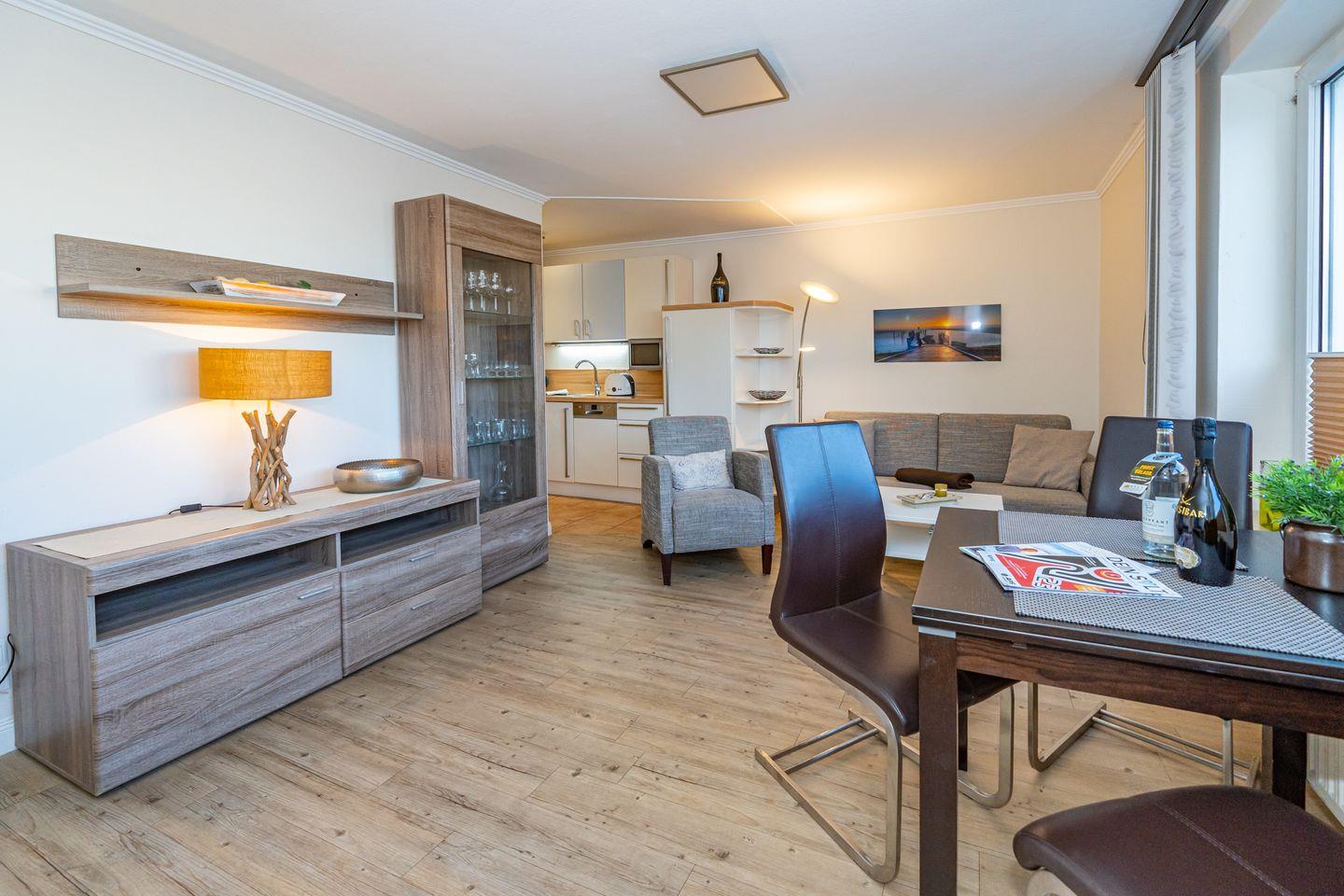 Diese 2-Zimmer-Ferienwohnung, in der zweiten Etage, verfügt über einen Wohn- und Essbereich. Gemütlich eingerichtet mit einem Sofa, Sessel, TV und Essplatz. Die offene Küche ist ausgestattet mit einem Backofen, Mikrowelle, Gefrierfach, Kaffeefiltermaschine und einer Nespressomaschine. Das Schlafzimmer bietet ein großes Doppelbett und einem Kleiderschrank. Das Badezimmer verfügt über eine Dusche, Waschtisch und WC. Zur Wohnung gehört ein Balkon zur Ostseite und ein privater Stellplatz Nr.22. Gut erzogene Hunde sind herzlich willkommen (10,- € pro Tier/Tag). Im Haus befindet sich ein Aufzug. Zur Hauseingangstür müssen Sie 8 Stufen überwinden, da das Erdgeschoss sich im Hochparterre befindet. Waschmaschine und Trockner stehen Ihnen in einem Gemeinschaftskeller gegen ein Entgelt zur Verfügung.