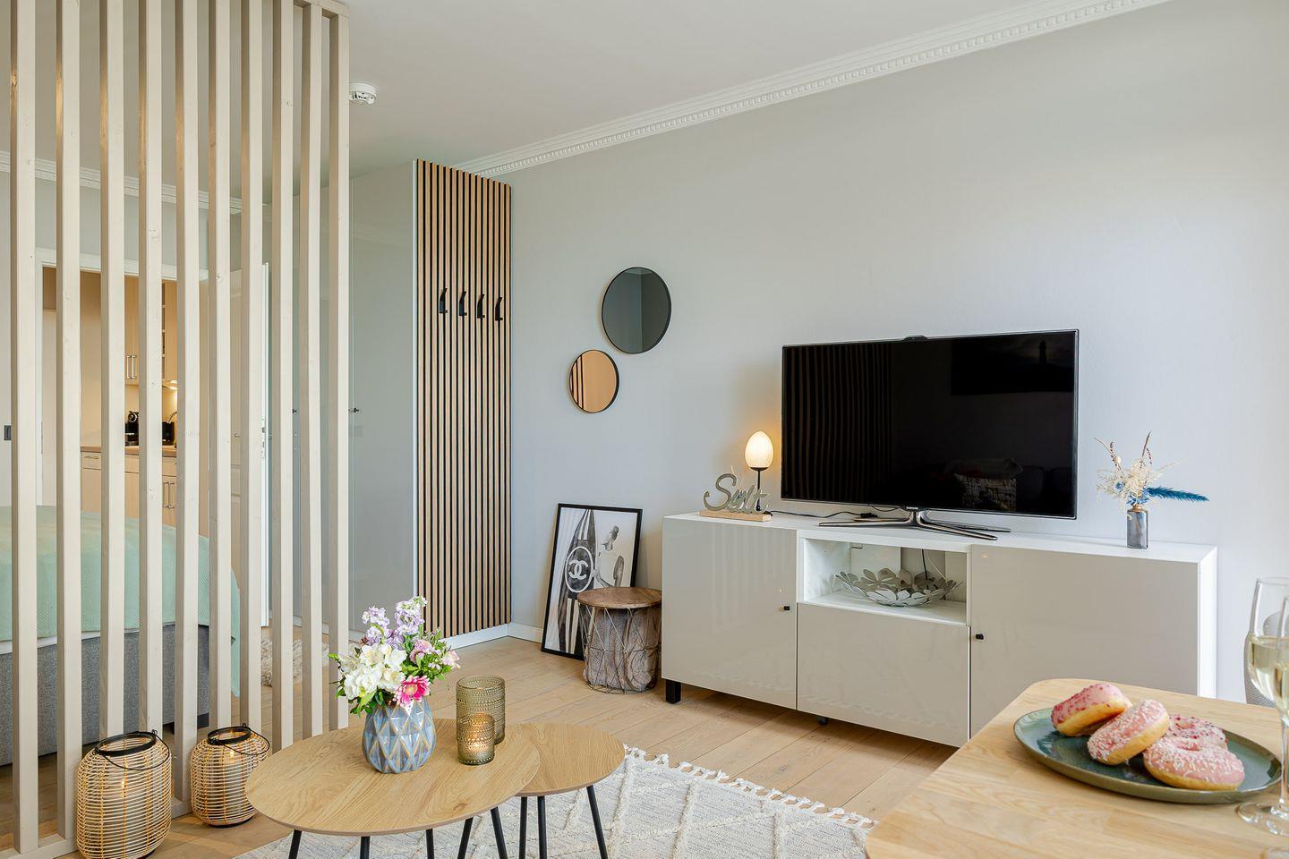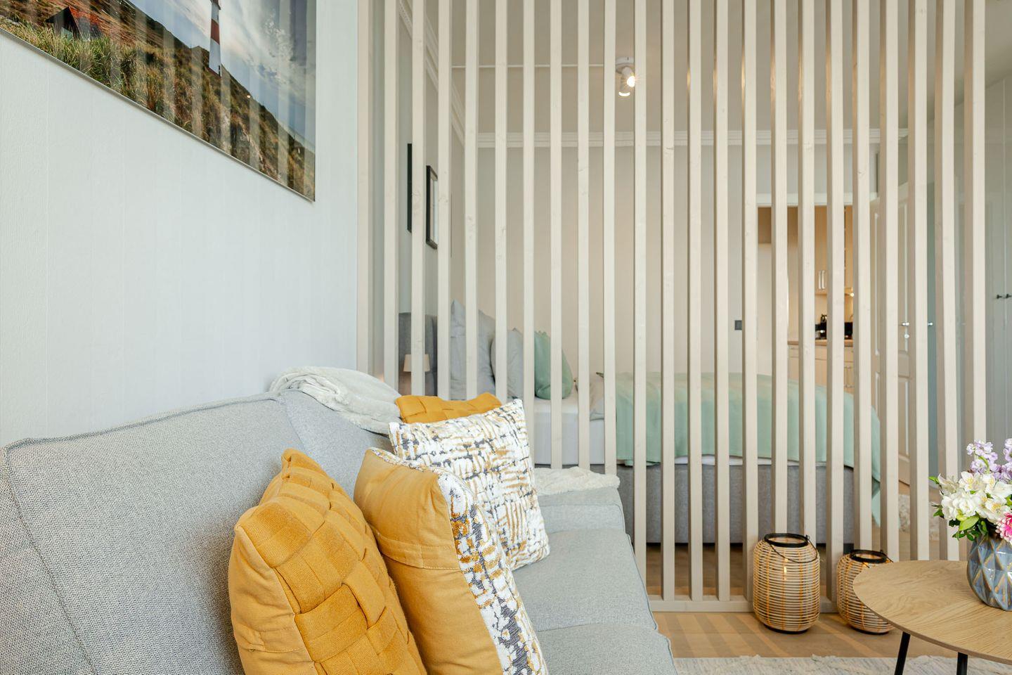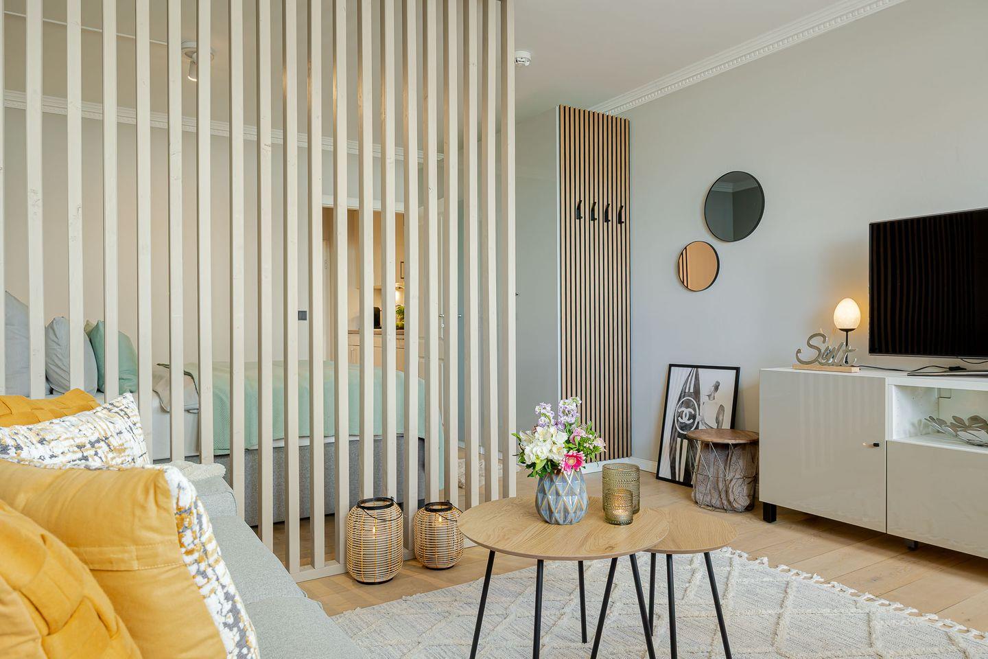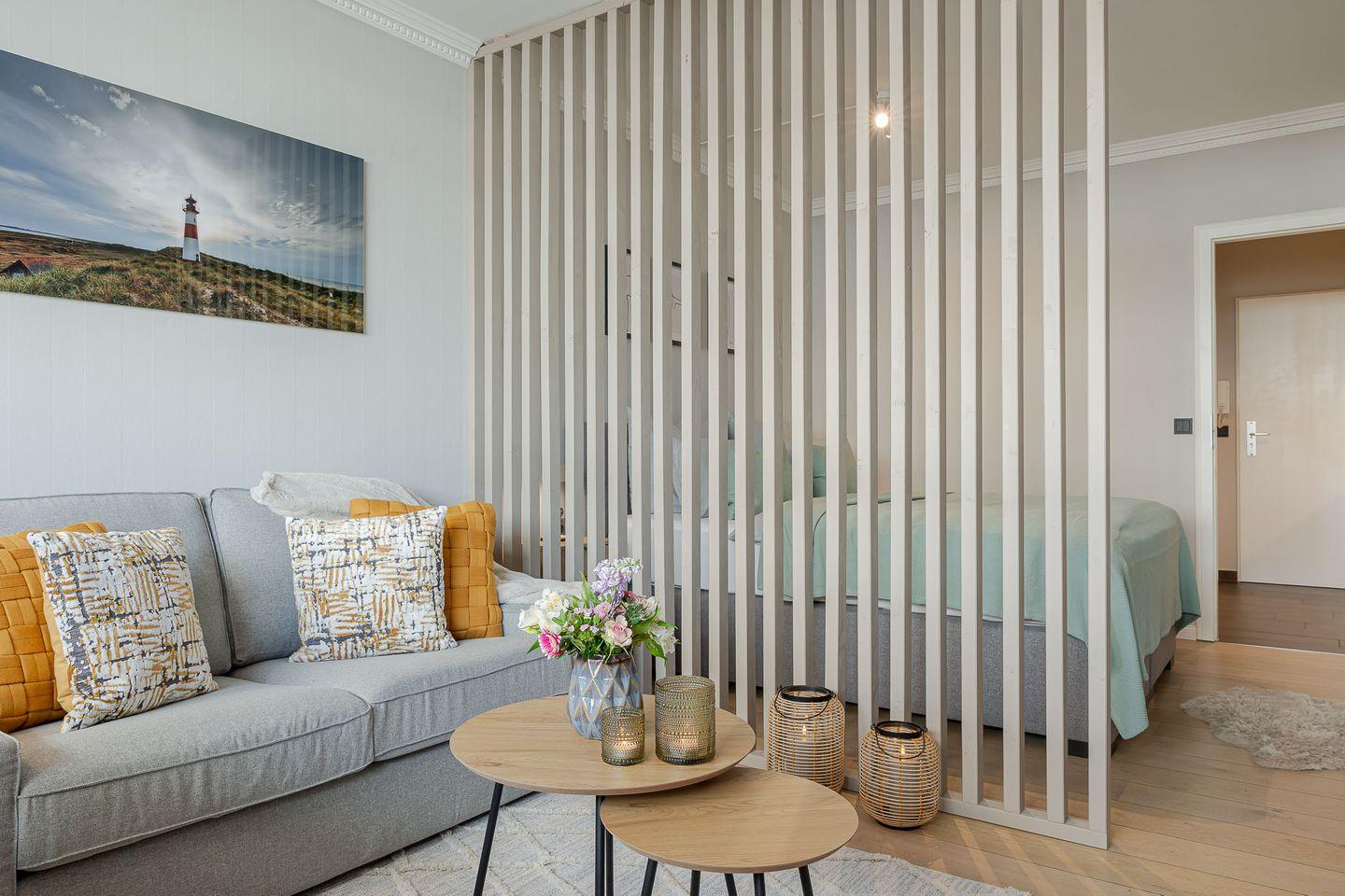 Durch eine stilvolle Lamellenwand sind Wohn- und Schlafbereich sanft voneinander getrennt – ein elegantes Detail, das Ruhe und Offenheit zugleich schafft. Das hochwertige Boxspringbett lädt zum Ausschlafen ein, während das gemütliche Sofa zum Verweilen bei einem guten Buch oder einem Filmabend einlädt.