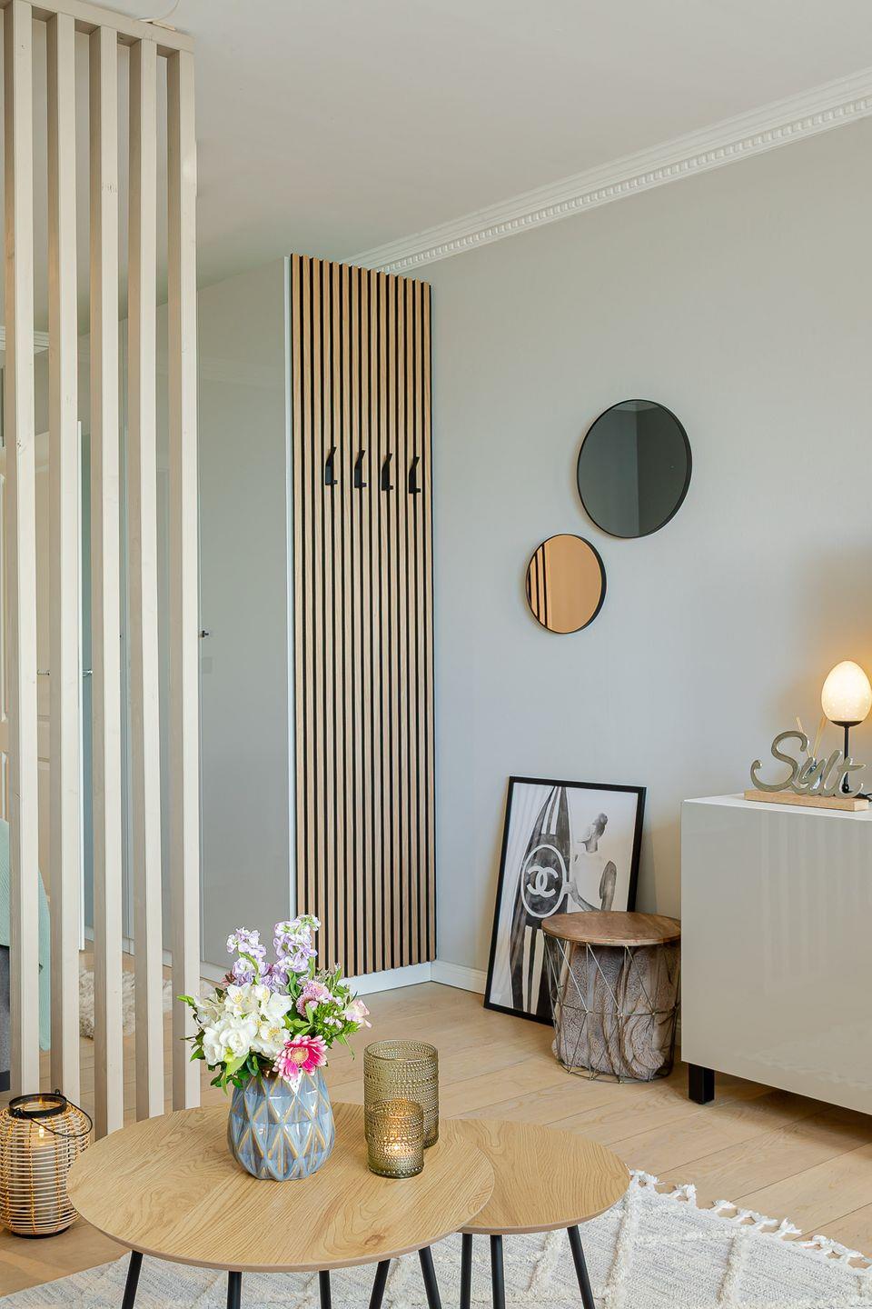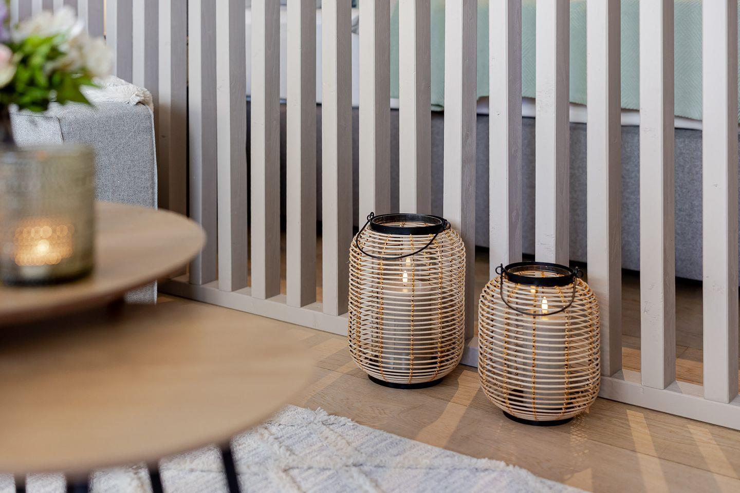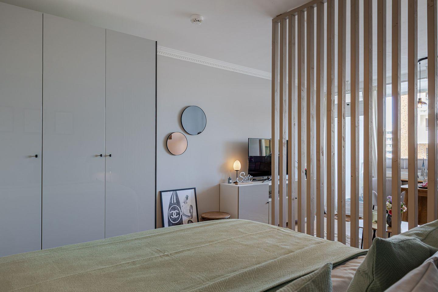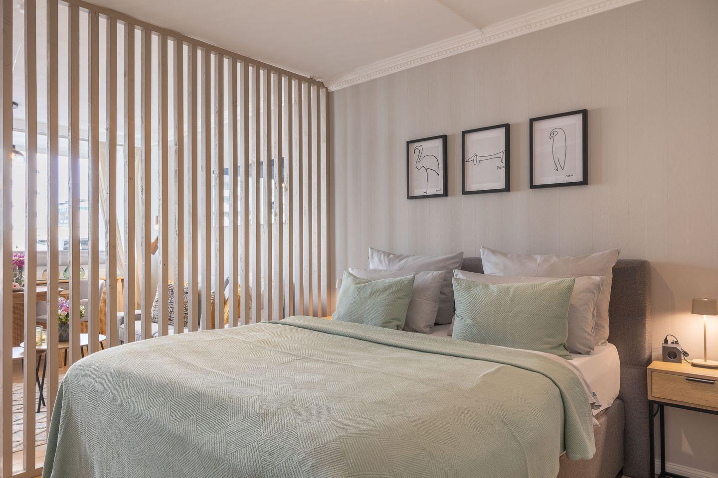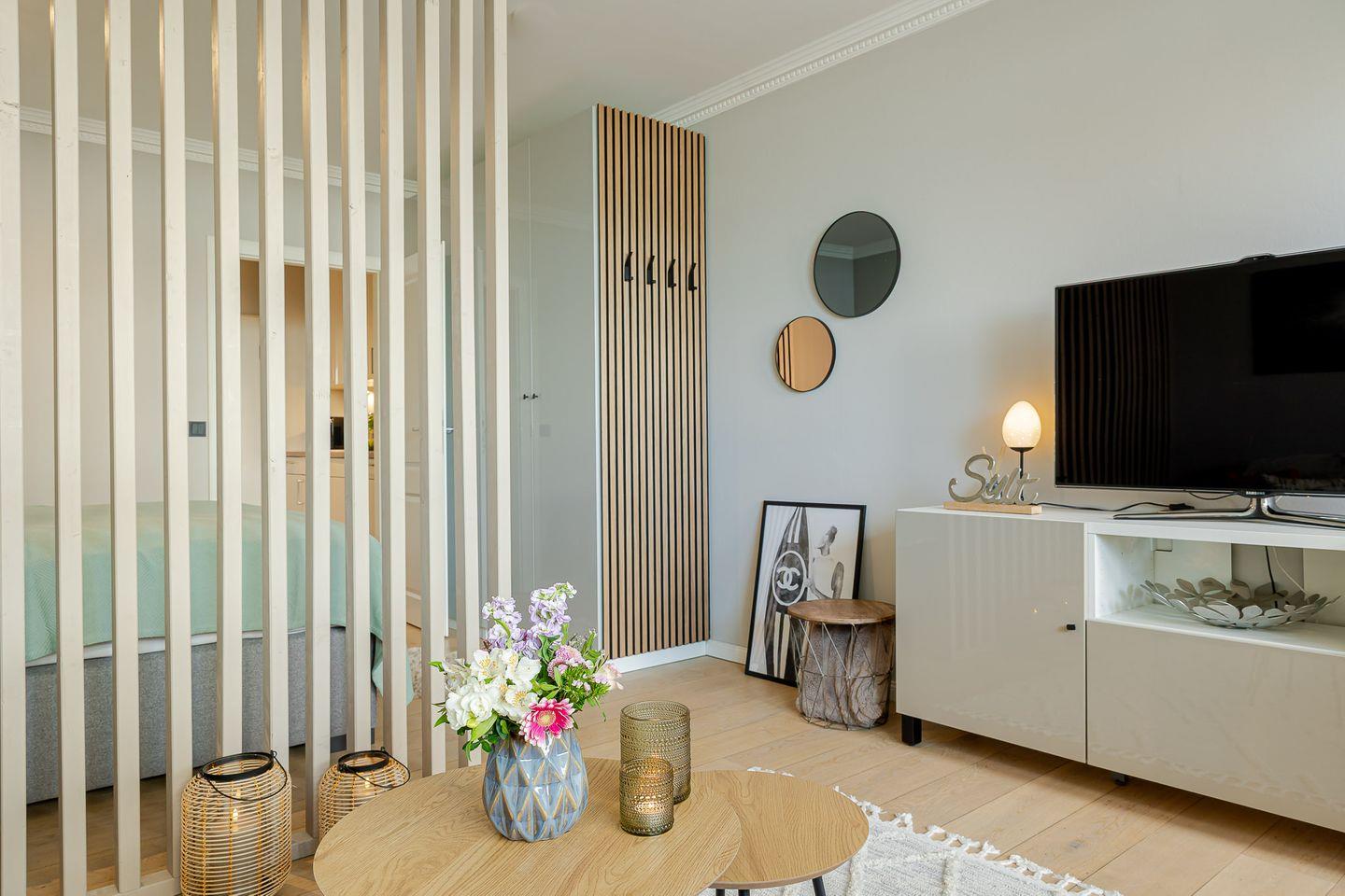 Durch eine stilvolle Lamellenwand sind Wohn- und Schlafbereich sanft voneinander getrennt – ein elegantes Detail, das Ruhe und Offenheit zugleich schafft. Das hochwertige Boxspringbett lädt zum Ausschlafen ein, während das gemütliche Sofa zum Verweilen bei einem guten Buch oder einem Filmabend einlädt.