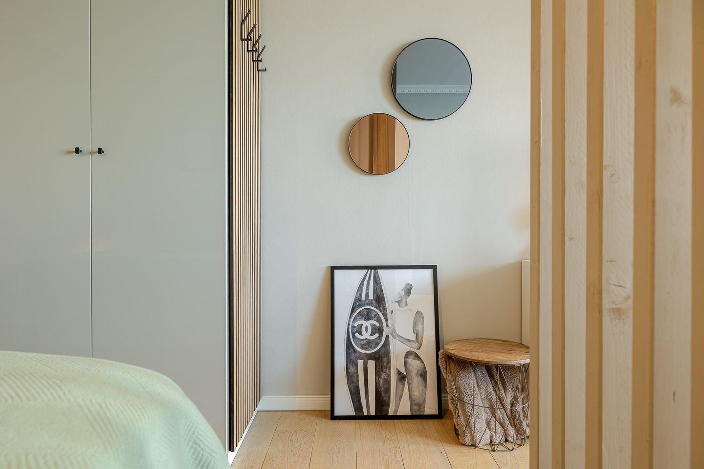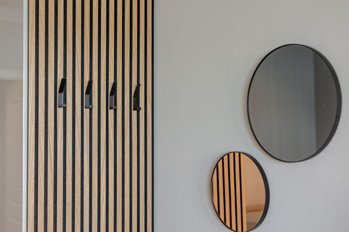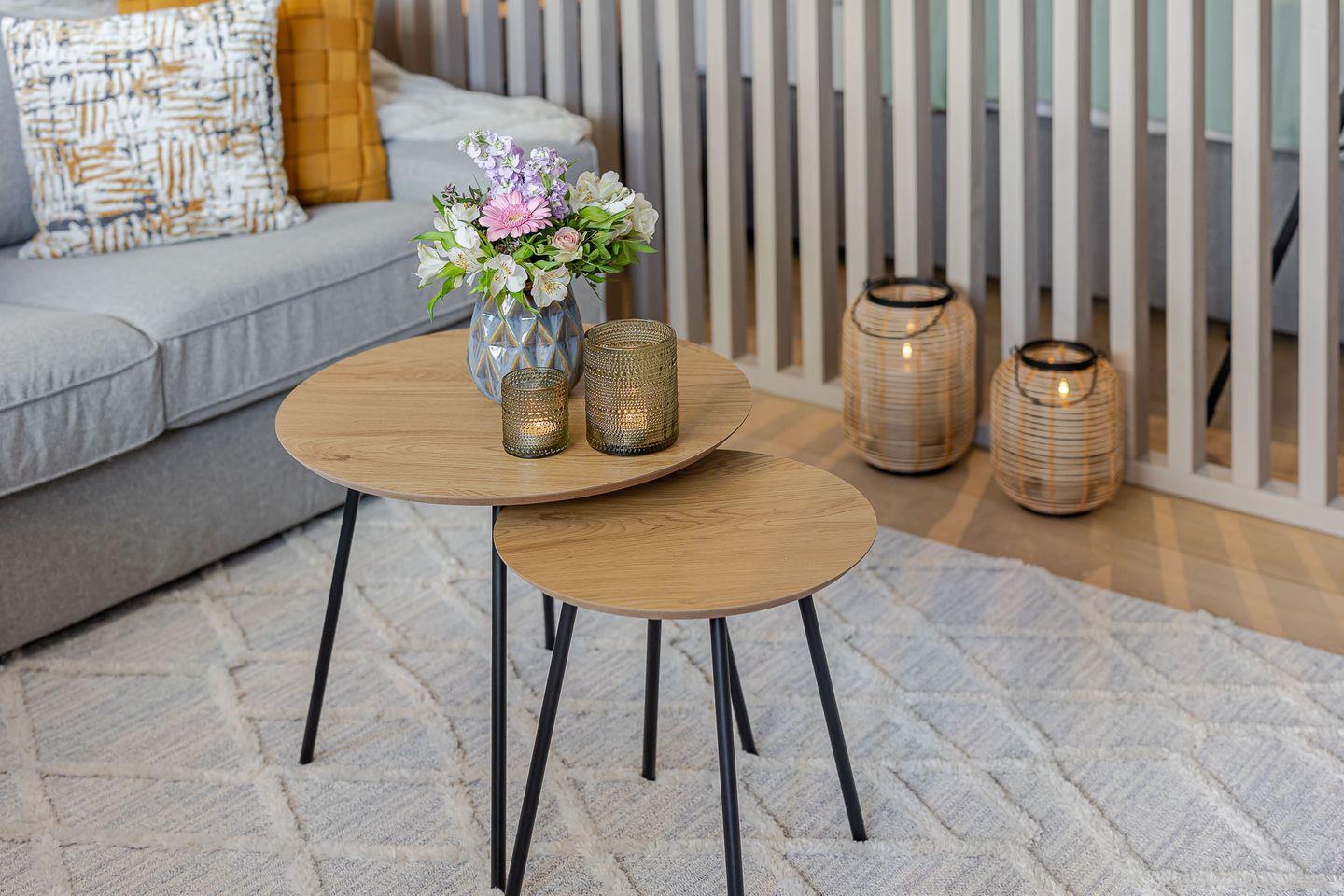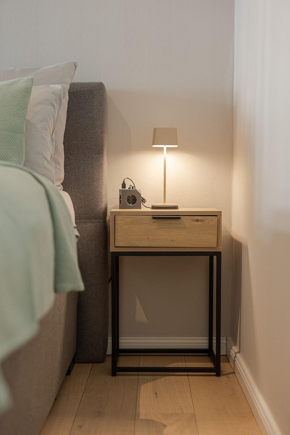 Durch eine stilvolle Lamellenwand sind Wohn- und Schlafbereich sanft voneinander getrennt – ein elegantes Detail, das Ruhe und Offenheit zugleich schafft. Das hochwertige Boxspringbett lädt zum Ausschlafen ein, während das gemütliche Sofa zum Verweilen bei einem guten Buch oder einem Filmabend einlädt.