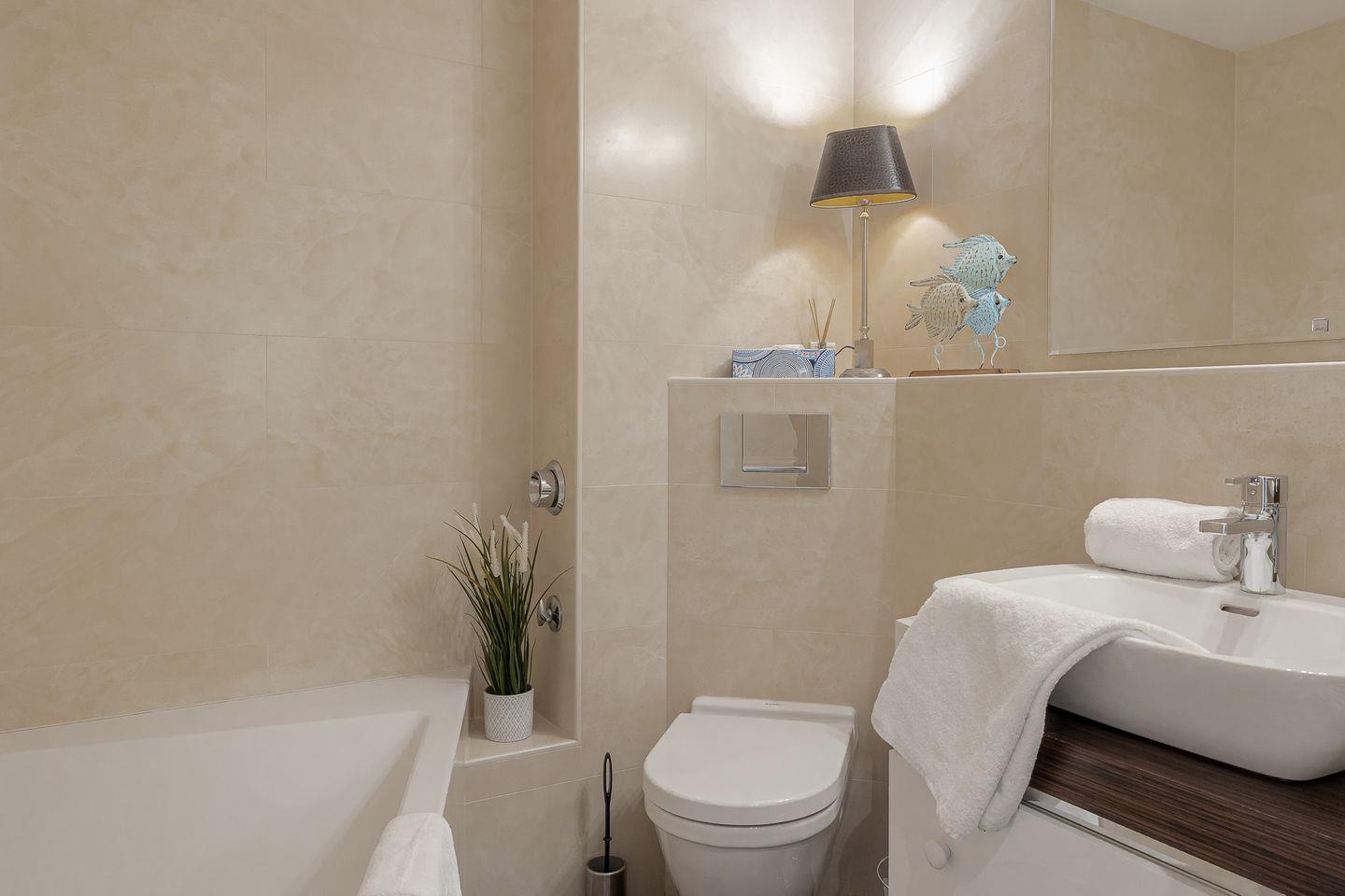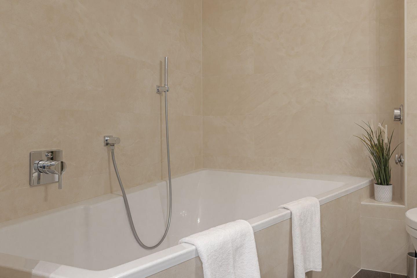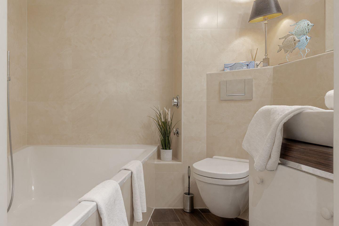 Im stilvoll gestalteten Badezimmer mit Badewanne und Duschmöglichkeit finden Sie Zeit für sich.